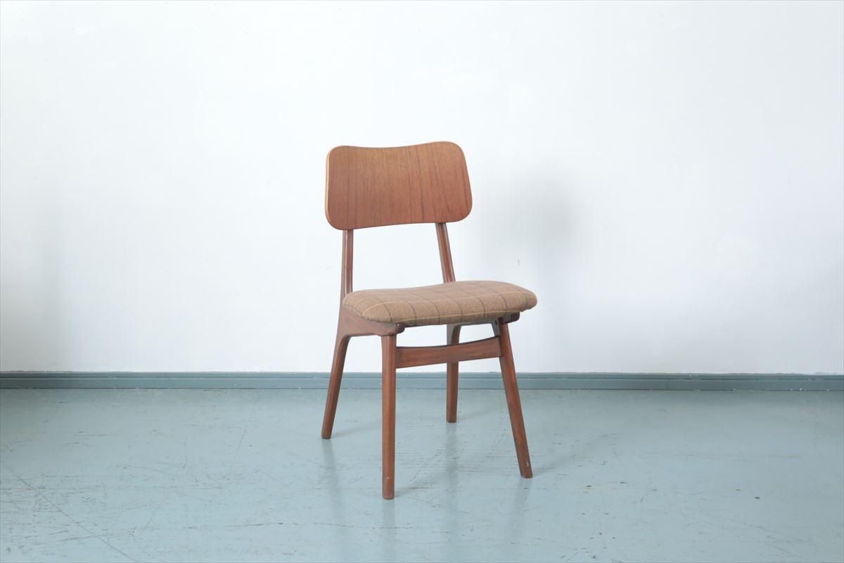 チークのダイニングチェアーです。 背もたれの形や後ろ姿がアクセントとなったレトロな雰囲気のデザインです。 とてもしっかりとした造りで、どっしりと重みがあります。 座面は日本製のRIBACO(リバコ)のRibbonシリーズ/RB341(ウール30%・アクリル70%)で張替えています。 細かいキズや凹みなど多少使用感はありますが、良いコンディションです。