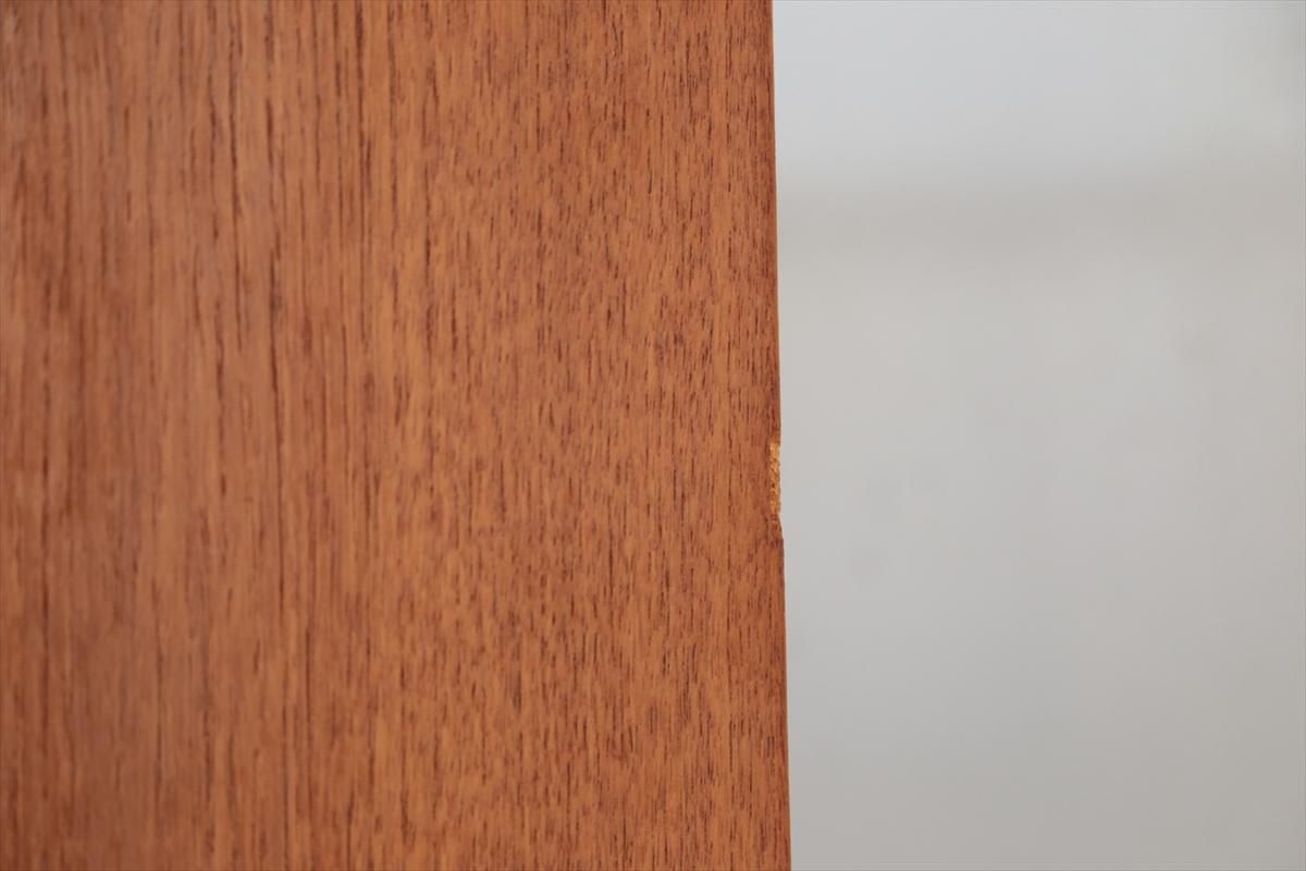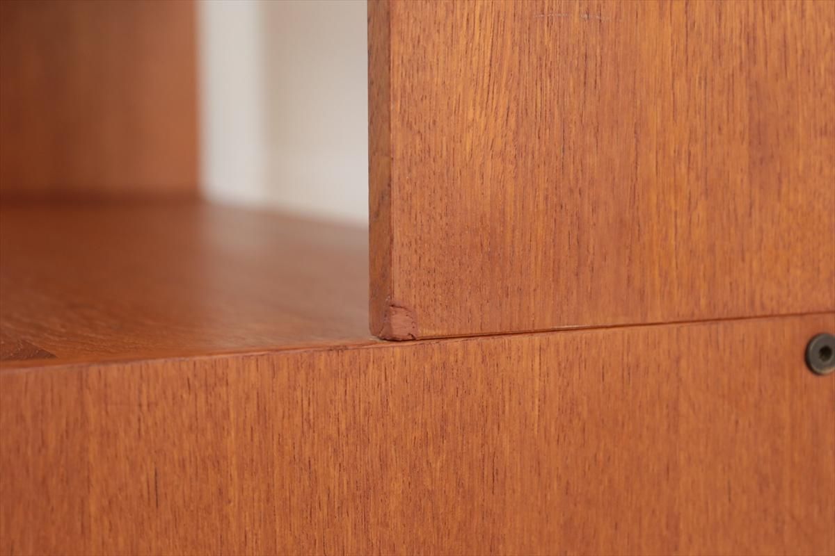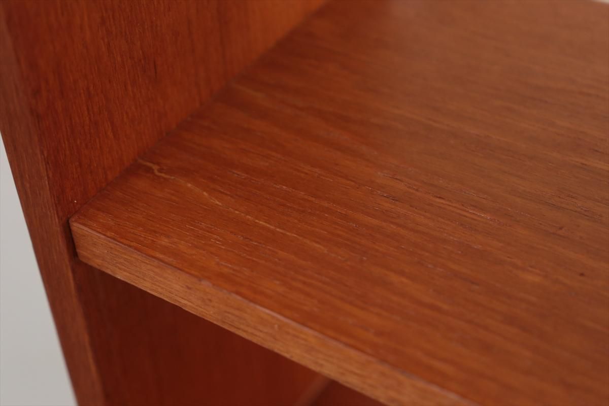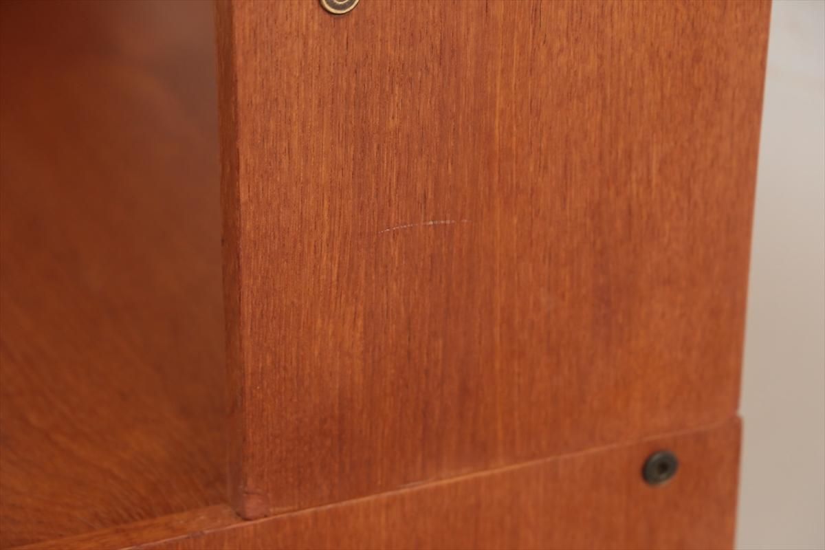スウェーデンのチークのブックケースです。 コンパクトなサイズ感で、オープンタイプのため圧迫感がなくすっきりとした印象です。 キッチンやリビングで本棚や飾り棚として様々に使えます。 上段の棚(1段目のみ)は2段階、下段はの高さ調節が可能です。 下段は引き戸で開閉しやすく、たっぷりと収納できます。 画像のような角部の欠けや、欠けを補修した箇所が数か所あります。 その他の細かいキズや凹みなど多少使用感はありますが、がたつきなどはなく良いコンディションです。
