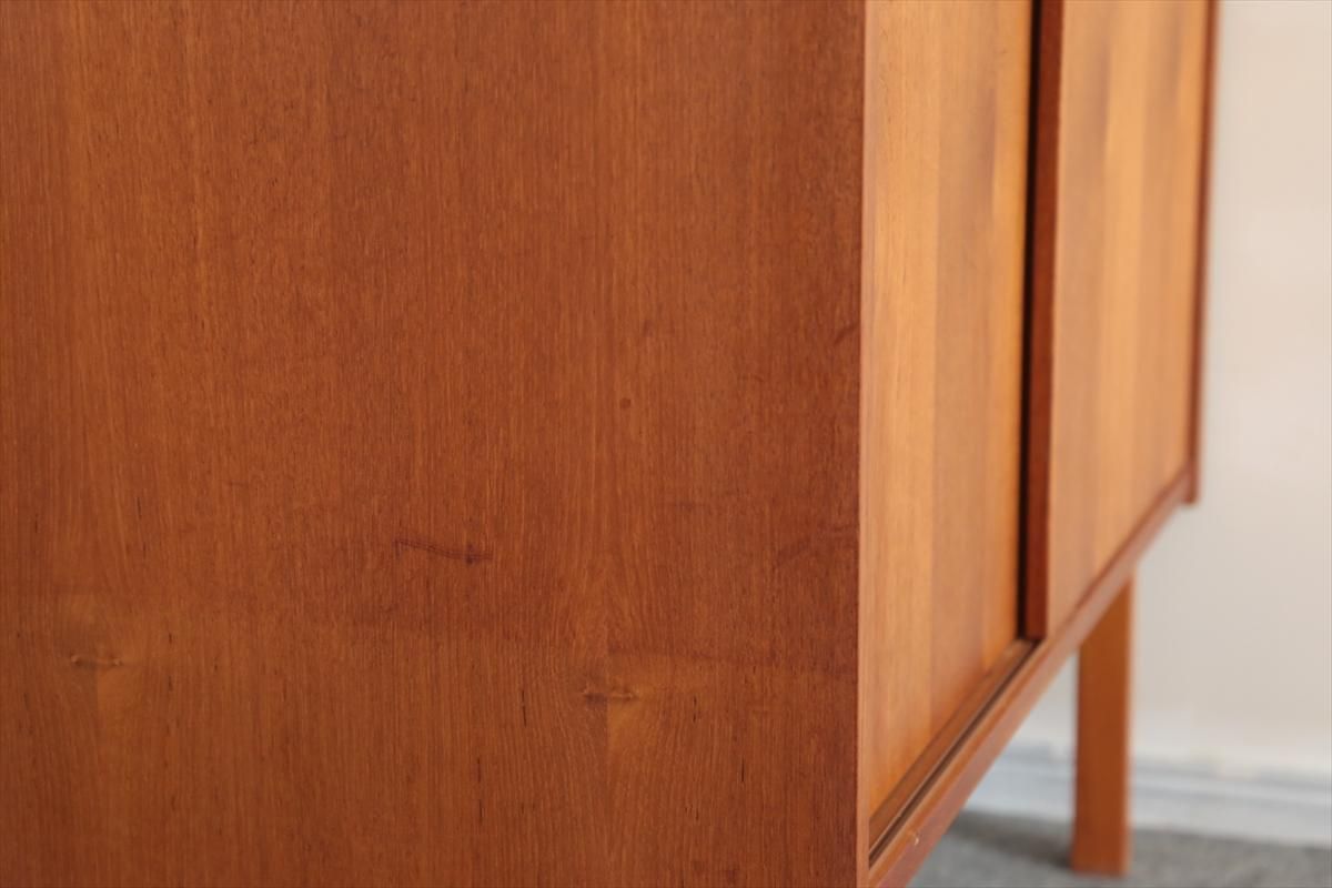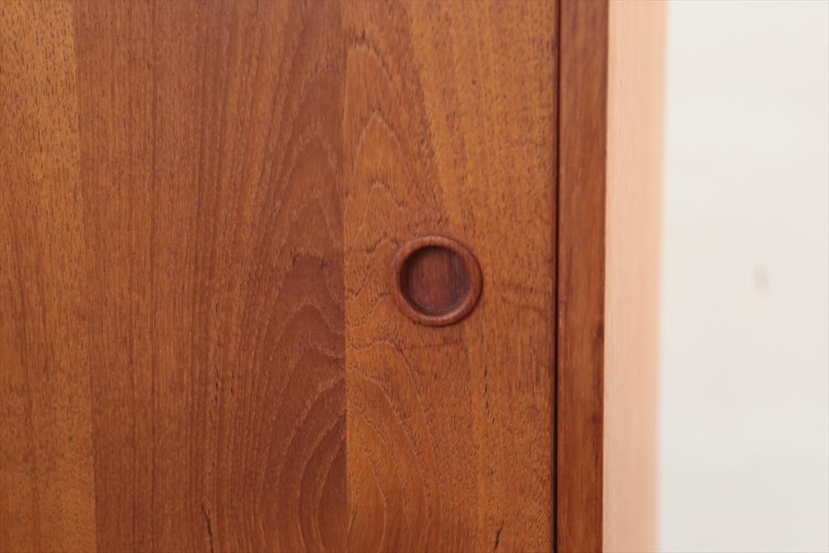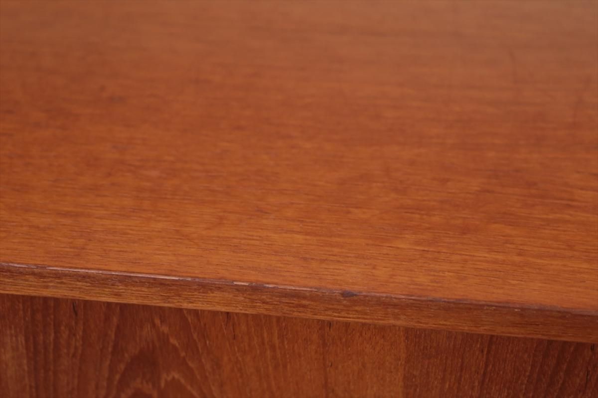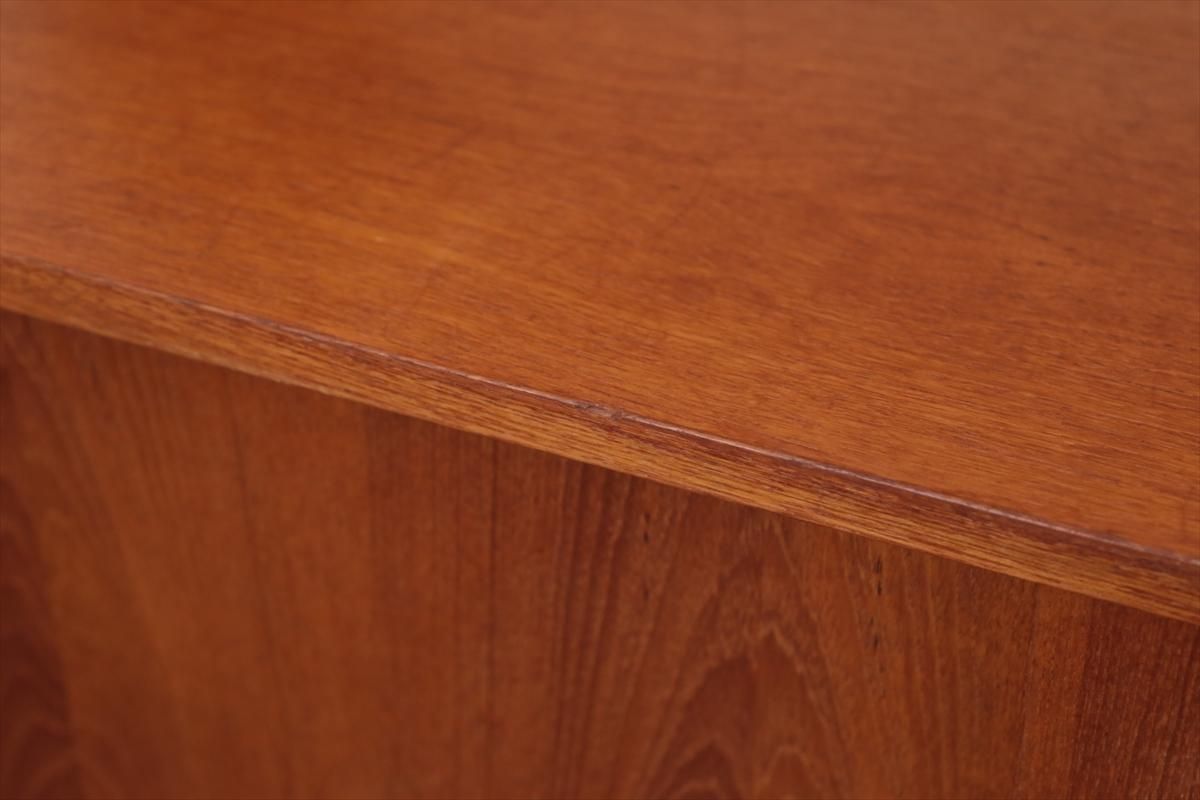 スウェーデンのチークのブックケースです。 コンパクトなサイズ感で、オープンタイプのため圧迫感がなくすっきりとした印象です。 キッチンやリビングで本棚や飾り棚として様々に使えます。 上段の棚(1段目のみ)は2段階、下段はの高さ調節が可能です。 下段は引き戸で開閉しやすく、たっぷりと収納できます。 画像のような角部の欠けや、欠けを補修した箇所が数か所あります。 その他の細かいキズや凹みなど多少使用感はありますが、がたつきなどはなく良いコンディションです。