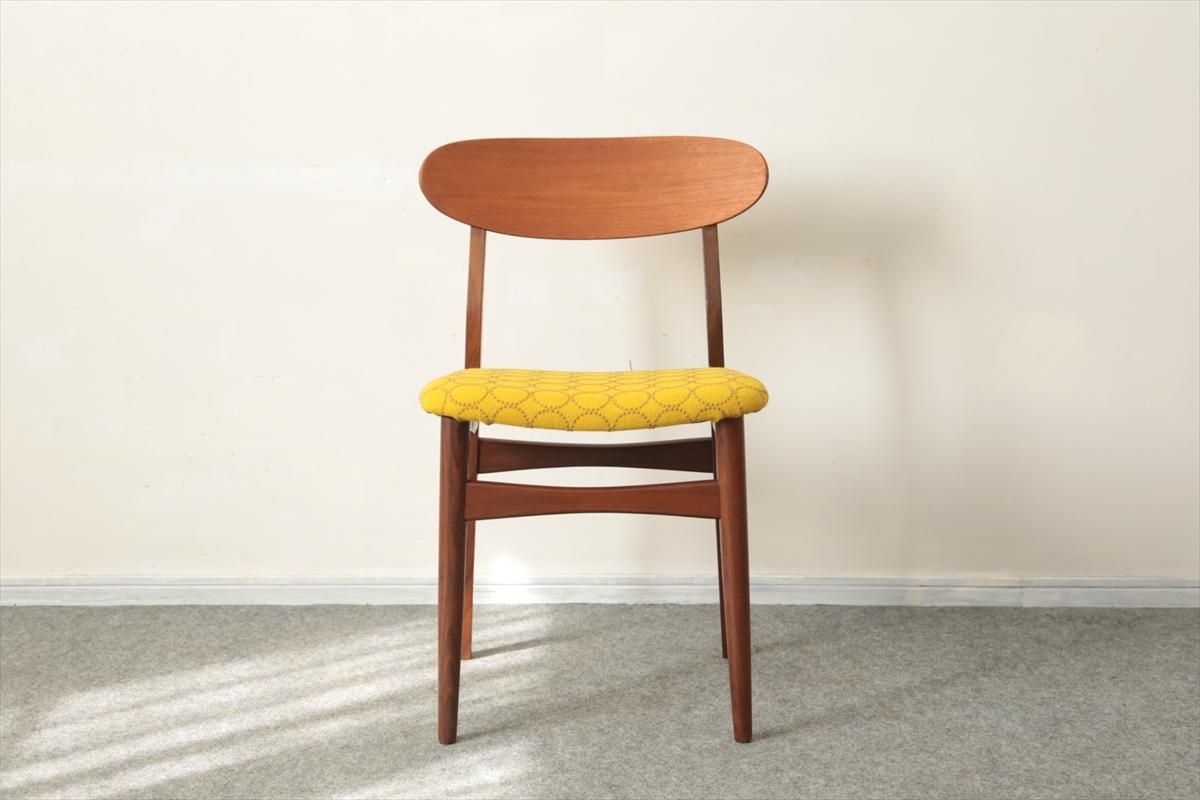 チークのダイニングチェアーです。 背もたれのフォルムがアクセントとなったシンプルなデザインです。 背もたれはチーク、脚はアフリカンチーク材です。 座面はデンマークのファブリックブランドKvadrat(クヴァドラ)の生地で、ファッションデザイナー皆川明氏デザインの「Tambourine Hallingdal」シリーズ(ウール70%・レーヨン30%)で張り替えました。 イエローの生地と明るいチークが可愛らしいチェアです。画像の様に背板に欠け補修の跡があるため、割引価格です。 その他細かいキズや凹みなど多少使用感はありますが、良いコンディションです。
