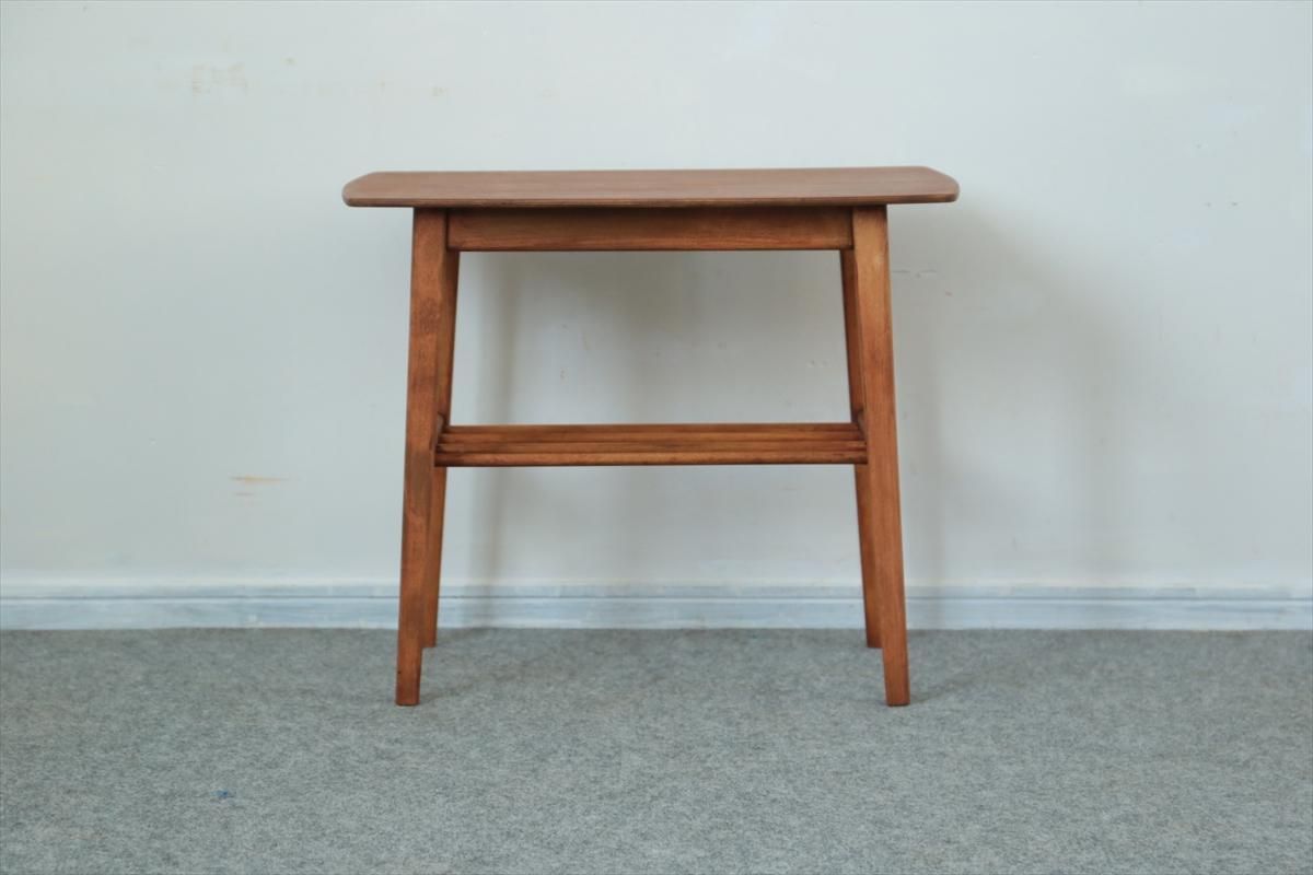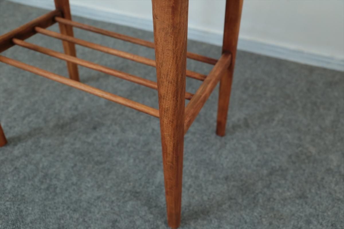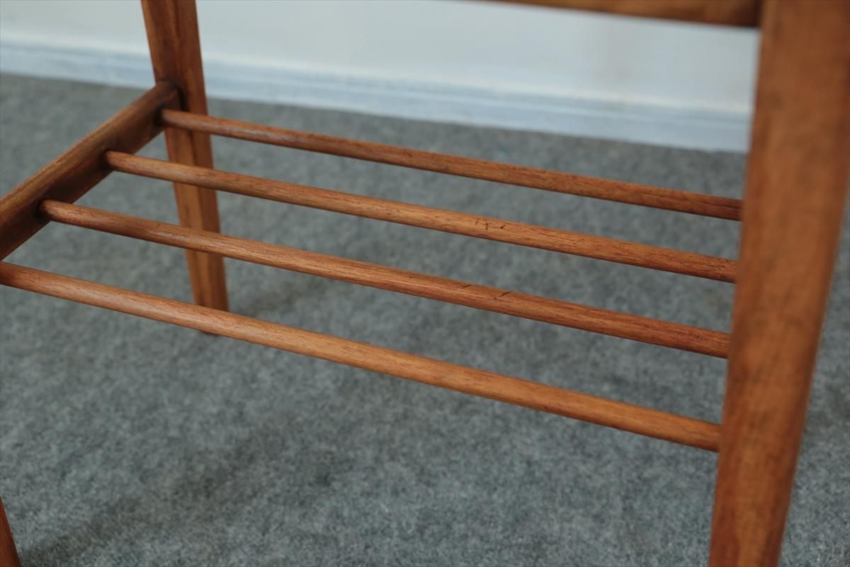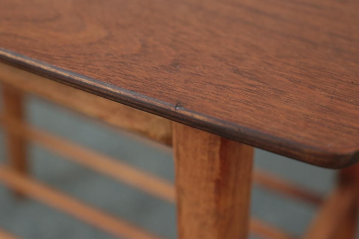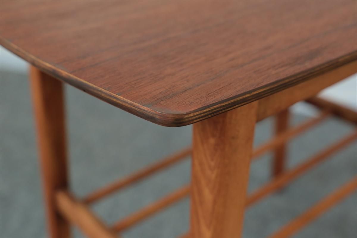 チーク×ビーチのサイドテーブルです。 ラック収納付きのコンパクトなサイズでベッドサイドなどのちょっとした空間のアクセントとなります。 ハノ字の脚がアクセントとなったすっきりとしたデザインです。 天板に突板のはがれを補修した箇所があります。その他、細かいキズや凹みなど多少使用感はありますが、良いコンディションです。