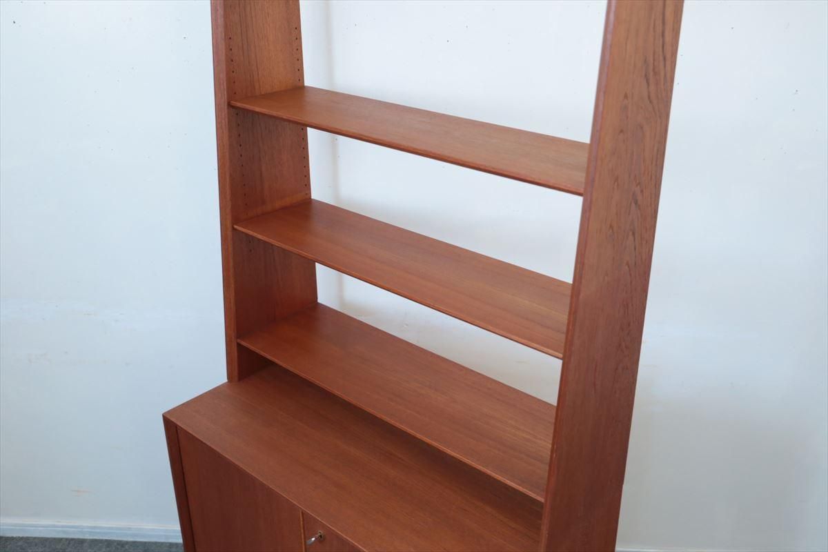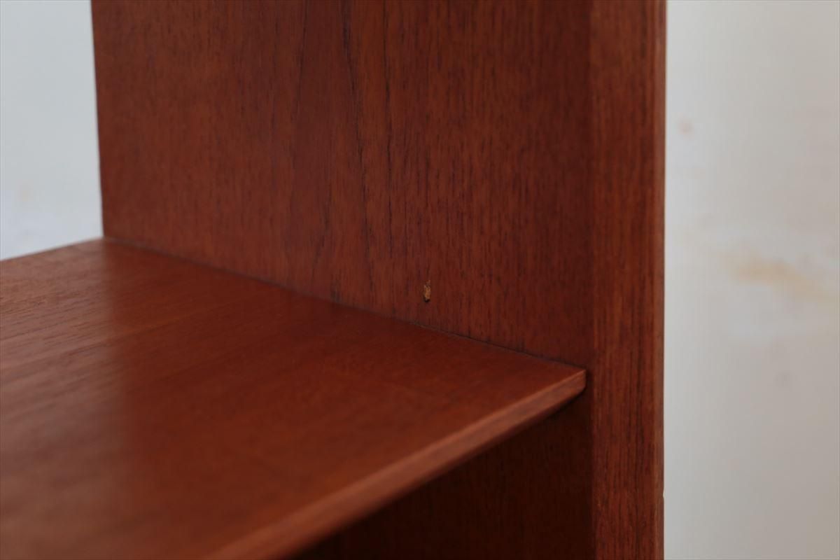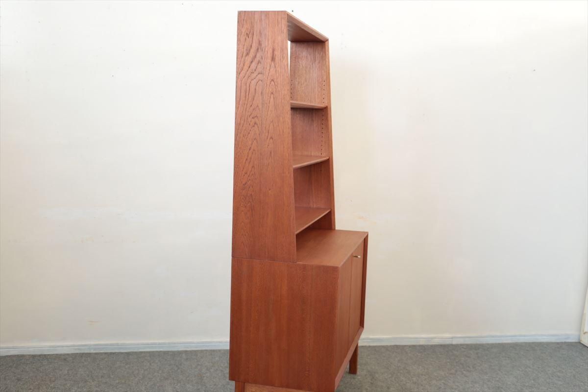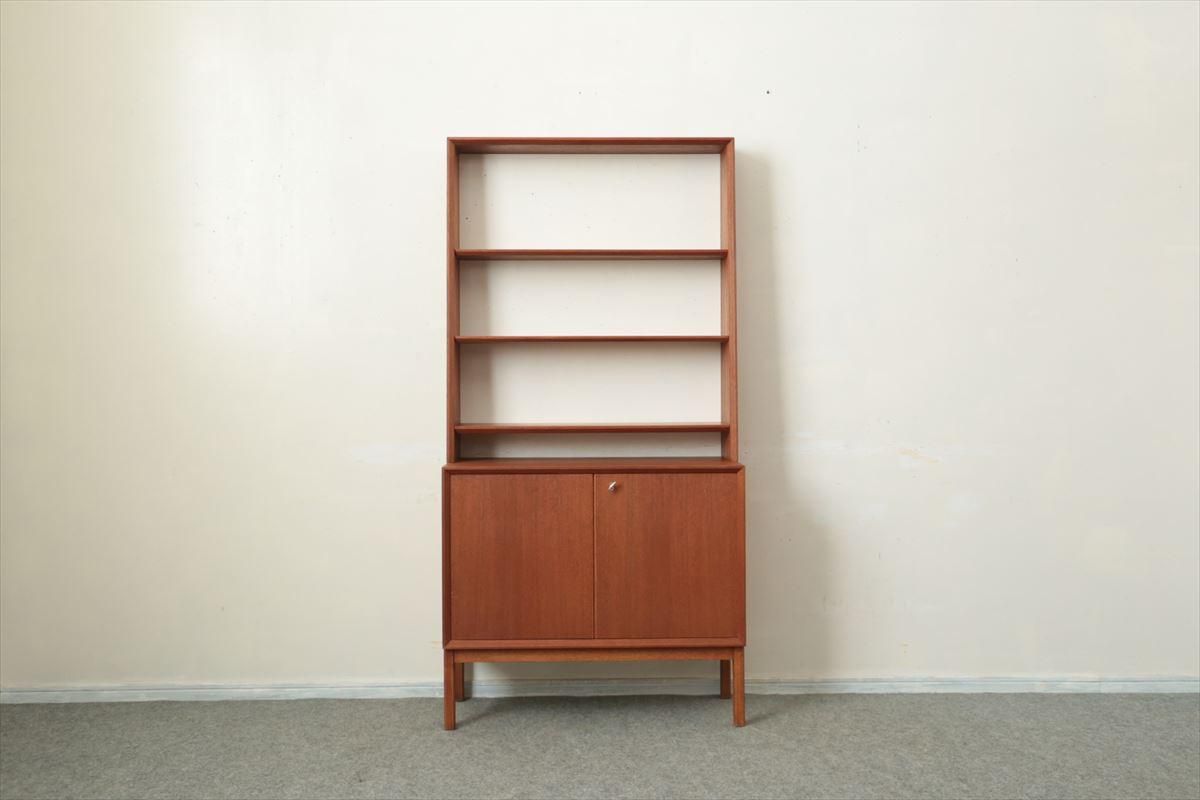スウェーデン製のチークのブックケースです。 背板のないオープンタイプのすっきりとしたシンプルなデザインで、コンパクトなサイズ感です。 本や小物、食器などお気に入りのものをディスプレイしながら、 リビングやキッチンなどで飾り棚や食器棚として様々に楽しめます。 上段の棚板は2枚のみ22段階の高さ調節が可能です。下段の扉は鍵を持ち手して開閉するタイプで、マグネットキャッチを取付けています。棚板は8段階に可動します。 画像のように右側面にやや目立つ色焼けがあります。 その他の細かいキズや凹みなど多少使用感はありますが、全体的には良いコンディションです。