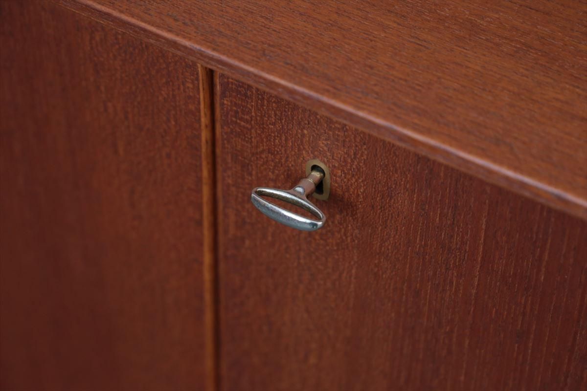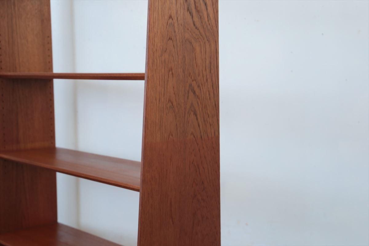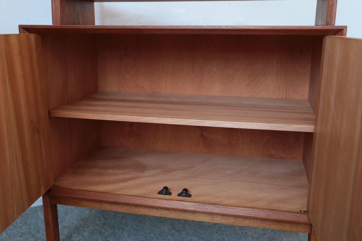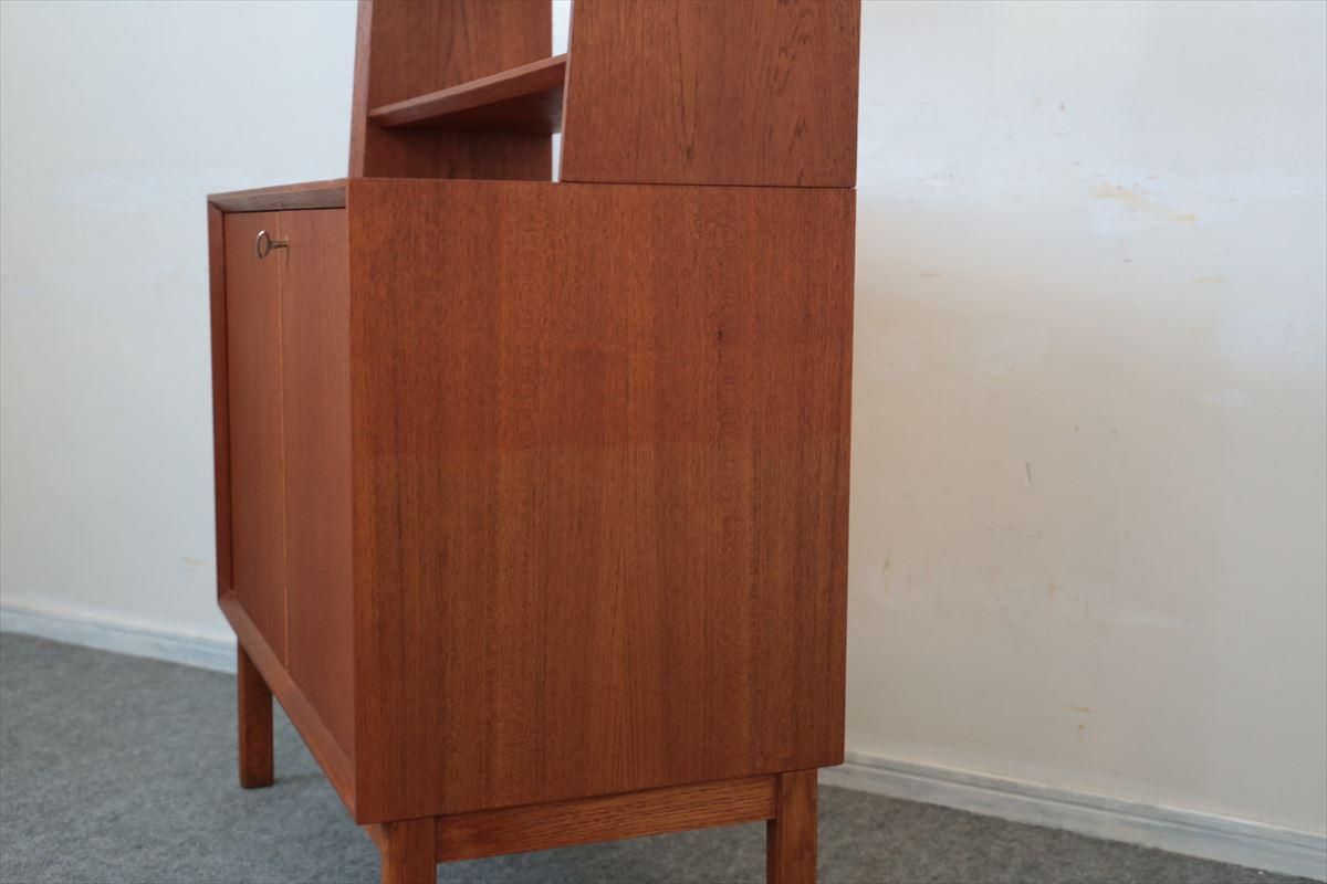 スウェーデン製のチークのブックケースです。 背板のないオープンタイプのすっきりとしたシンプルなデザインで、コンパクトなサイズ感です。 本や小物、食器などお気に入りのものをディスプレイしながら、 リビングやキッチンなどで飾り棚や食器棚として様々に楽しめます。 上段の棚板は2枚のみ22段階の高さ調節が可能です。下段の扉は鍵を持ち手して開閉するタイプで、マグネットキャッチを取付けています。棚板は8段階に可動します。 画像のように右側面にやや目立つ色焼けがあります。 その他の細かいキズや凹みなど多少使用感はありますが、全体的には良いコンディションです。