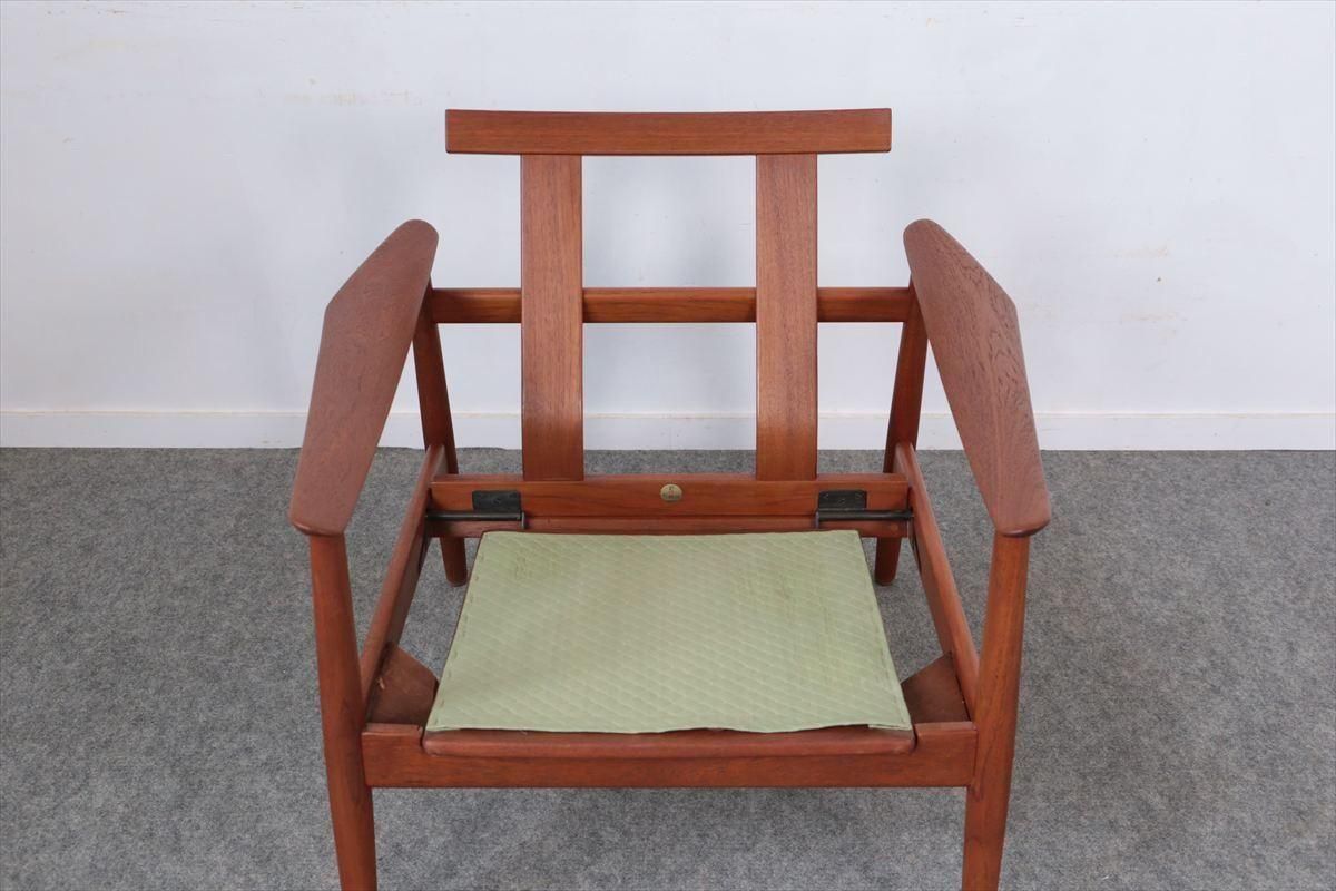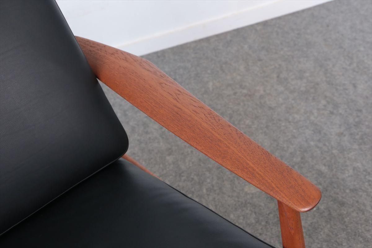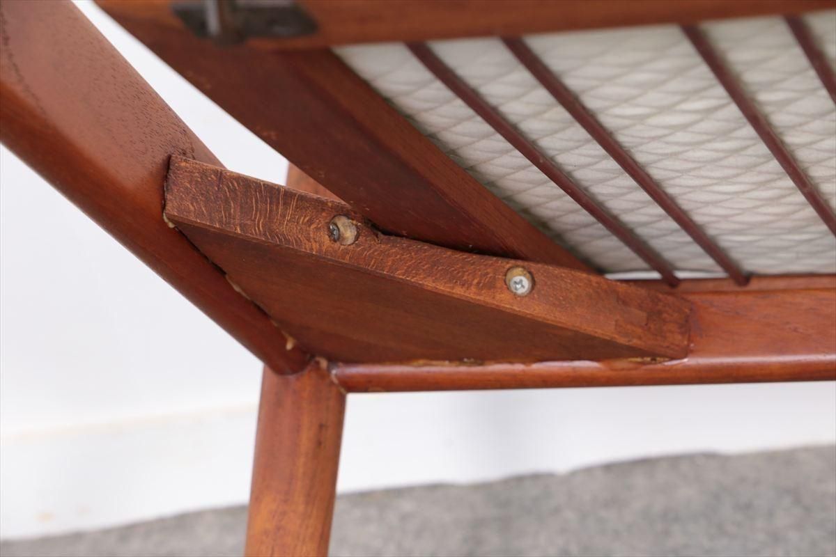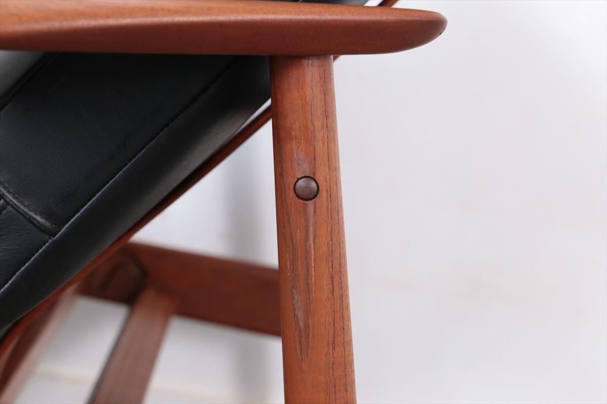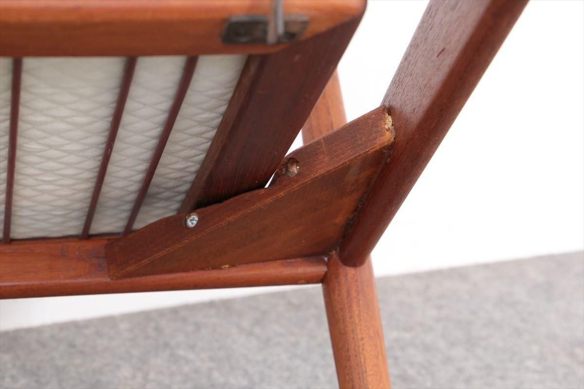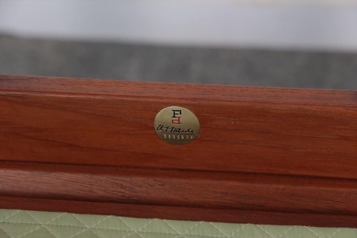 France&Daverkosen社で製造されていたArne Vodder(アルネ・ヴォッダー)デザインの「model164」リクライニングソファです。 アームの美しいフォルムと落ち着いたチークがとても良い雰囲気です。 こちらのソファは座面下に座面をスライドさせる金具と溝があり、背中の角度を3段階に調節することが出来ます。クッションはスプリングが内包されており、しっかりとした座り心地です。ウレタンは新しく交換しています。座面下のワイヤーベルトはとても良い状態でしたので、オリジナルをそのまま使用しております。ファブリックは新しいソフトレザーで張り替えてありましたが、わずかにキズやレザー特有のしわがあります。 アームの下のスポークに画像のような割れを補修した跡や、座面下に改めて補修が入った跡がりますが、強度に問題はありません。そのためこれらを考慮した価格です。 その他に木部に画像のような細かいキズや凹みなど、多少使用感はありますが、造りはしっかりとしております。