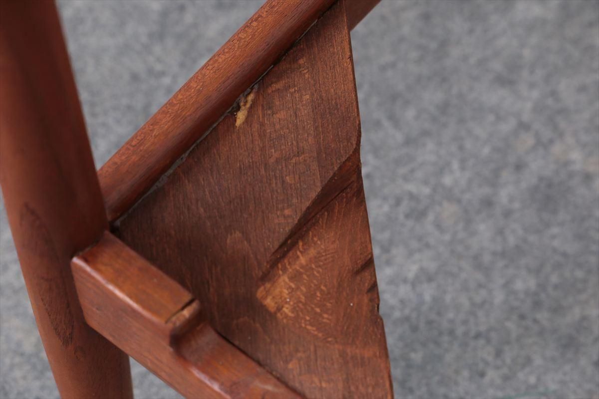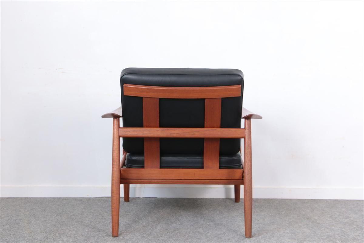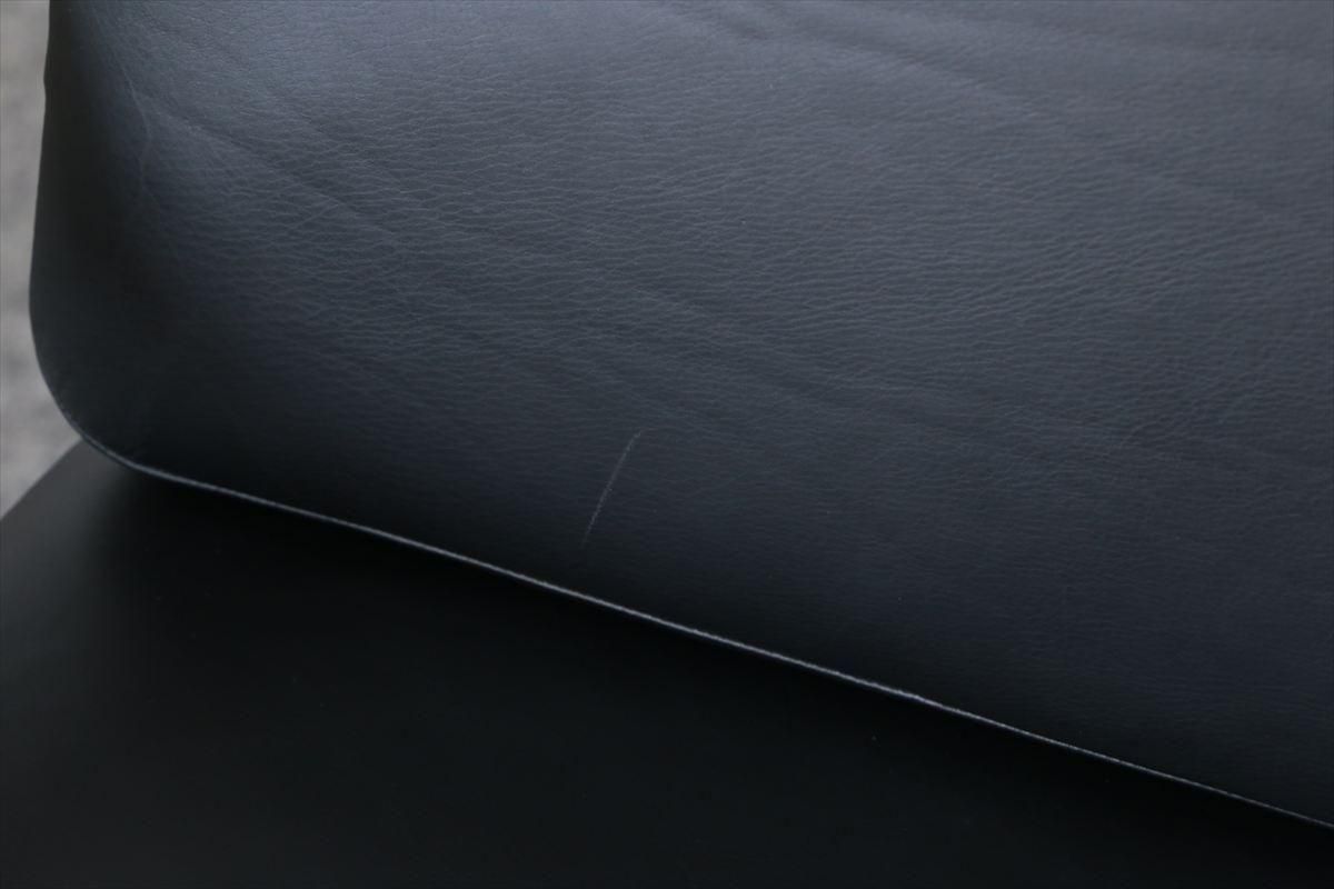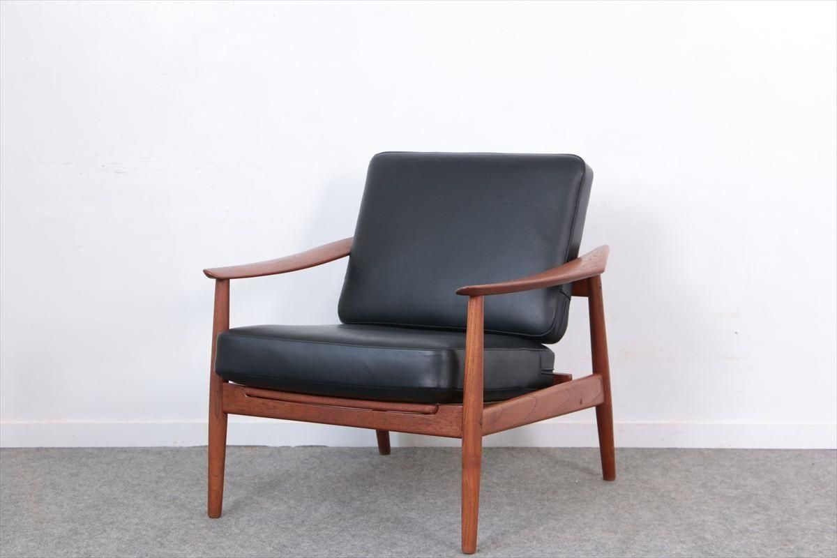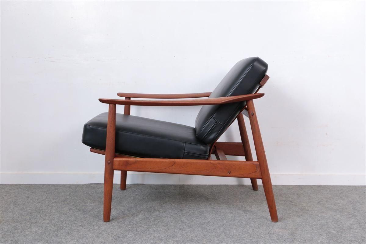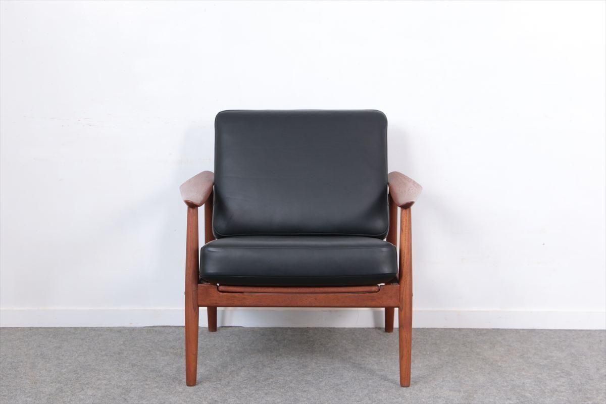 France&Daverkosen社で製造されていたArne Vodder(アルネ・ヴォッダー)デザインの「model164」リクライニングソファです。 アームの美しいフォルムと落ち着いたチークがとても良い雰囲気です。 こちらのソファは座面下に座面をスライドさせる金具と溝があり、背中の角度を3段階に調節することが出来ます。クッションはスプリングが内包されており、しっかりとした座り心地です。ウレタンは新しく交換しています。座面下のワイヤーベルトはとても良い状態でしたので、オリジナルをそのまま使用しております。ファブリックは新しいソフトレザーで張り替えてありましたが、わずかにキズやレザー特有のしわがあります。 アームの下のスポークに画像のような割れを補修した跡や、座面下に改めて補修が入った跡がりますが、強度に問題はありません。そのためこれらを考慮した価格です。 その他に木部に画像のような細かいキズや凹みなど、多少使用感はありますが、造りはしっかりとしております。