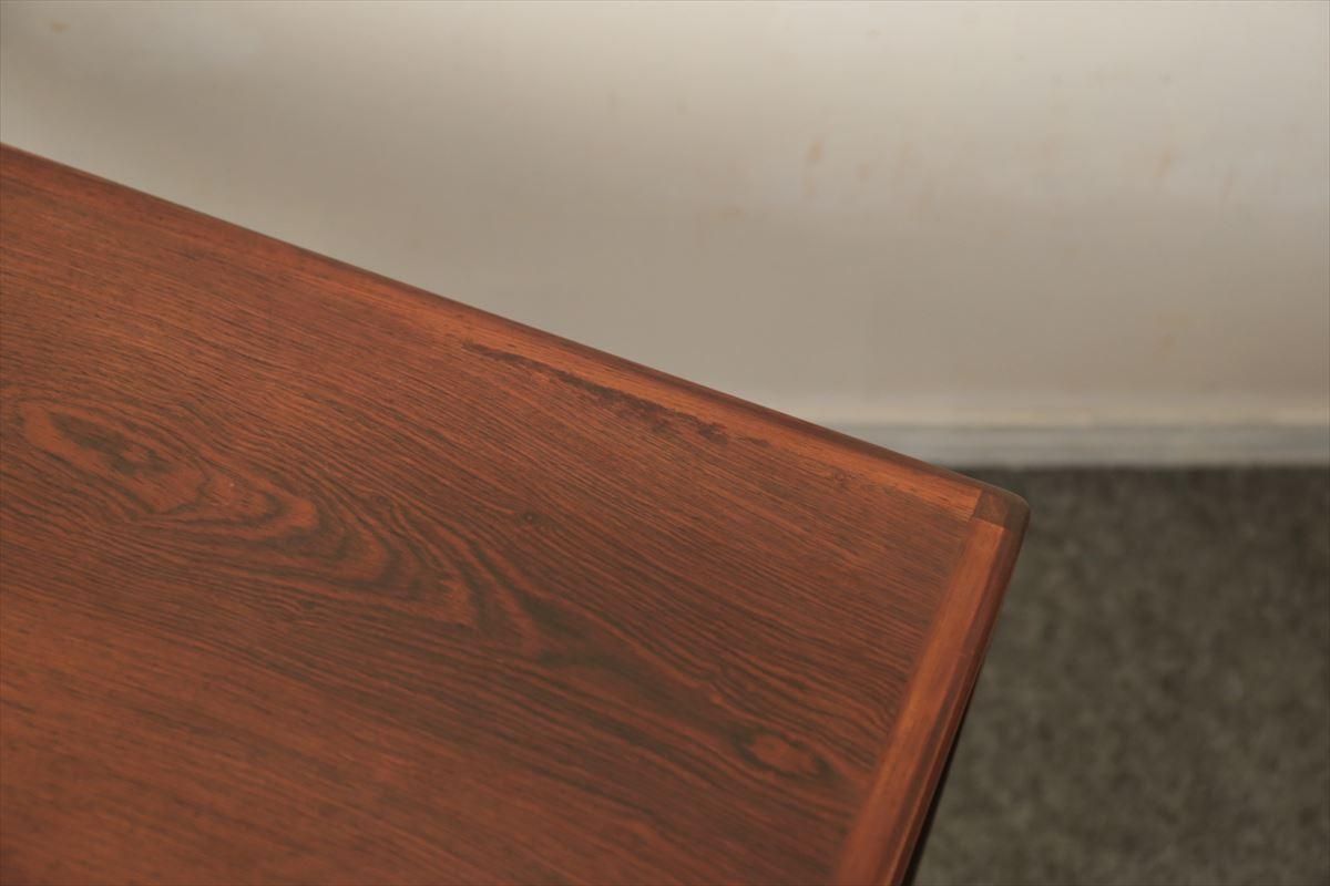 ローズウッドの正方形のコーヒーテーブルです。 シンプルで洗練された雰囲気のあるすっきりとしたデザインです。 ローズウッドの美しい木目と脚のデザインがアクセントとなっています。 コンパクトなサイズ感で様々な空間で活躍します。 天板の端に突板の剥がれを補修した箇所があります。 多少使用感はありますが、全体的には良いコンディションです。