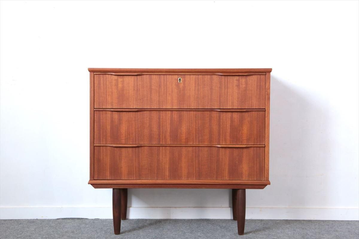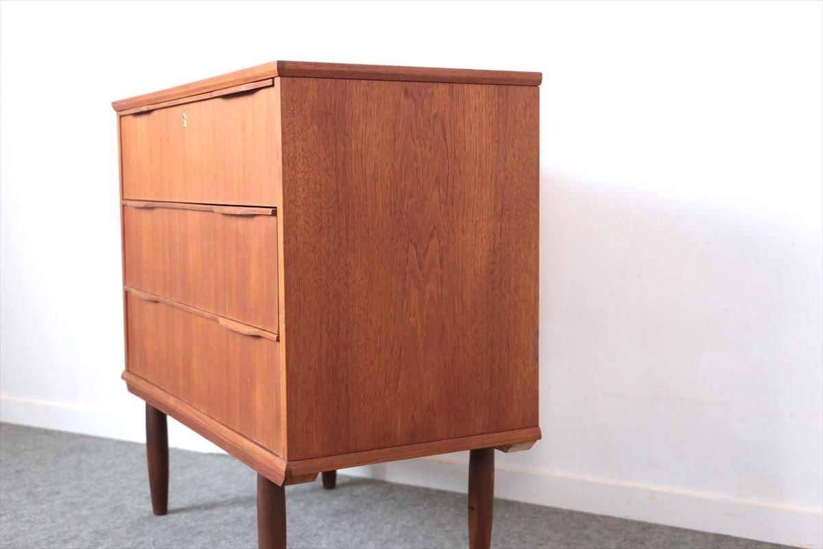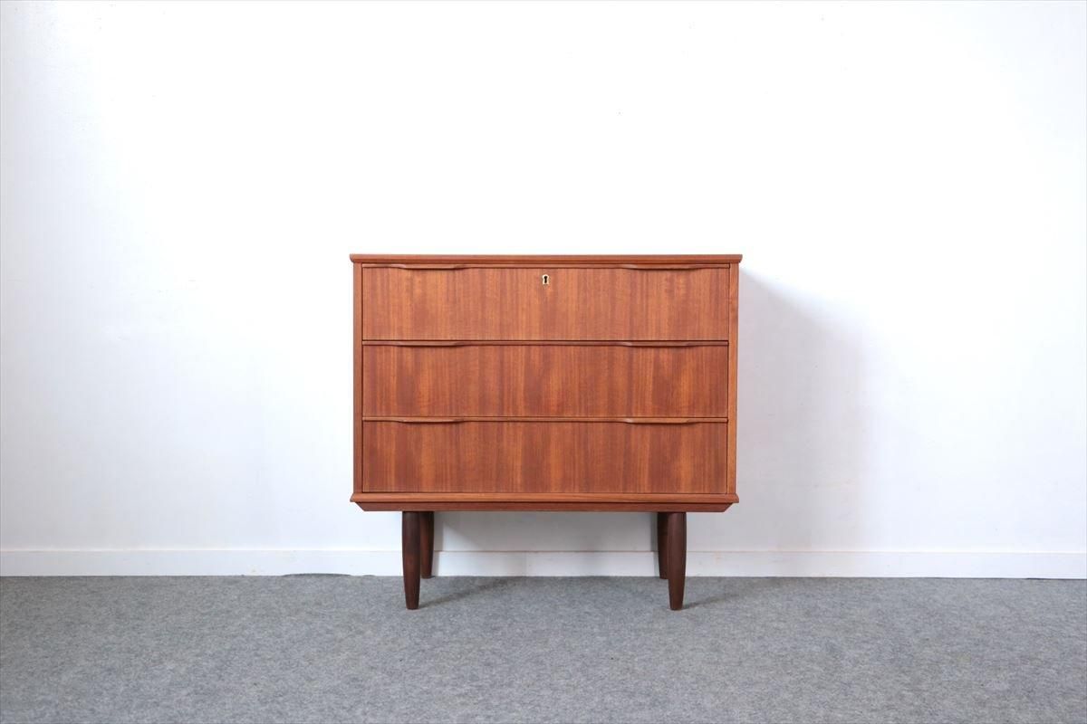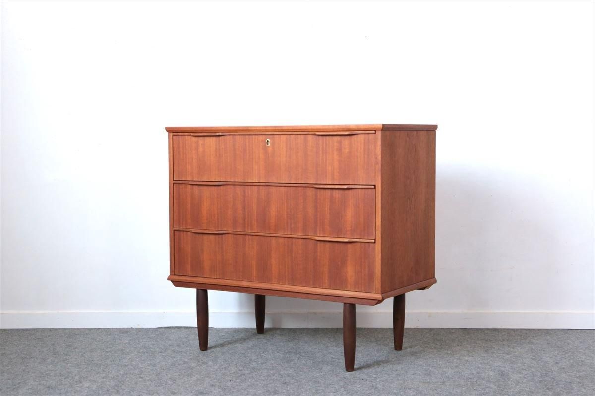 デンマークのチークの3段チェストです。 引き出しが深めでお気に入りのものをディスプレイしながら、衣類や身の回りの小物などの収納に便利です。 持ち手や脚の形がヴィンテージらしいデザインです。 高さが78cmと物を置いたり飾りやすい高さです。 引き出し内部に小さな欠けや再接着の跡がありますが、強度には問題が無いことを確認済みです。 その他に縁や脚に細かいキズや小さなキズなど多少使用感はありますが、良いコンディションです。