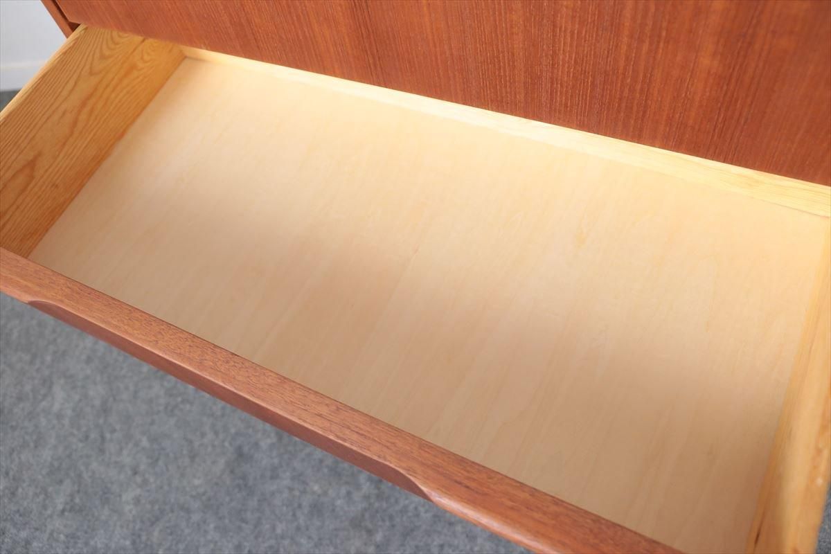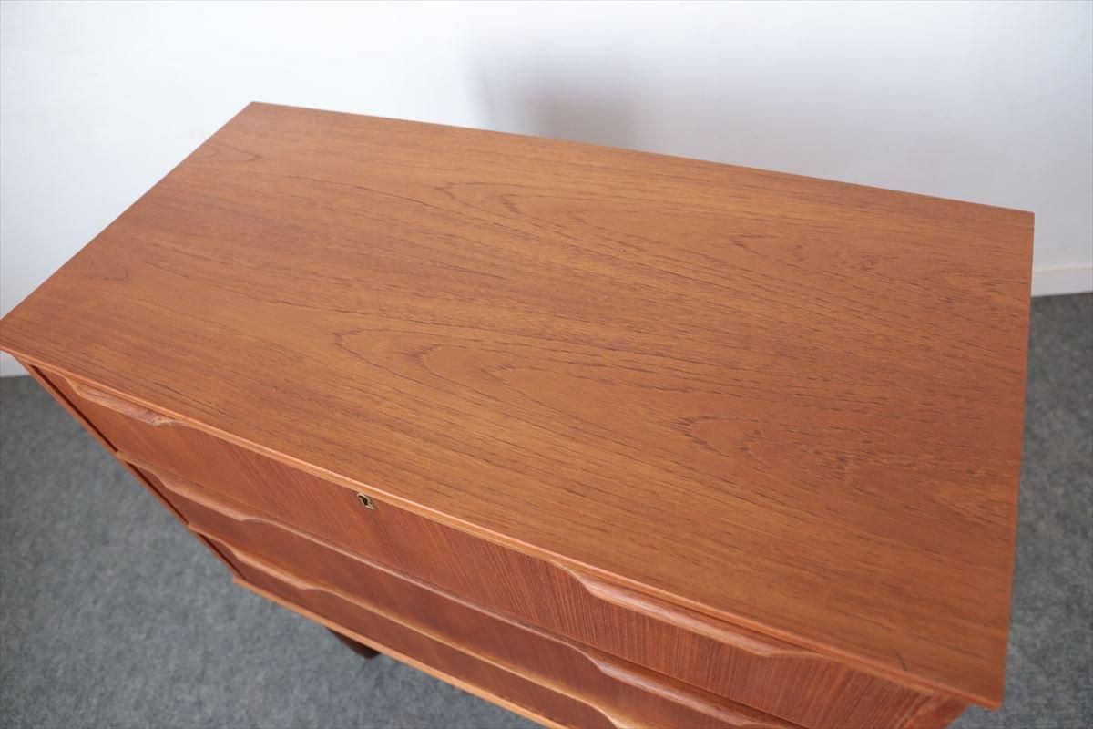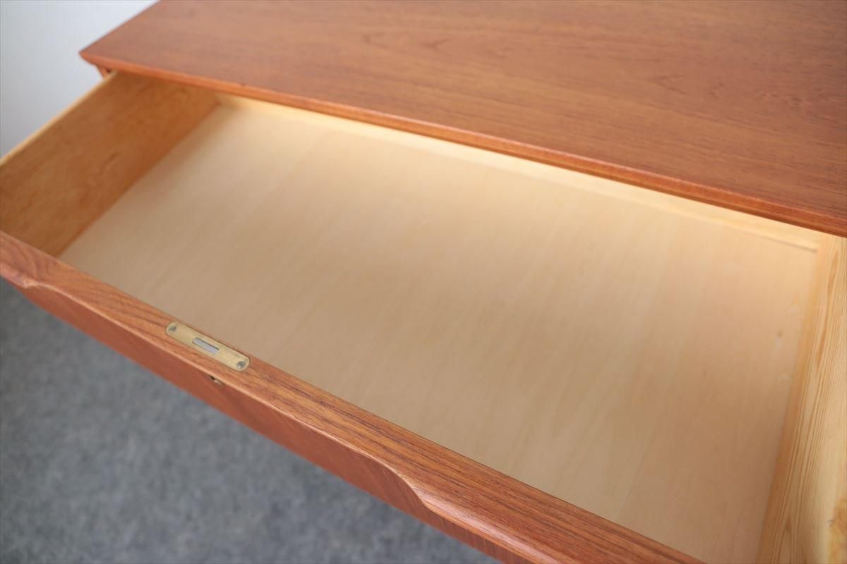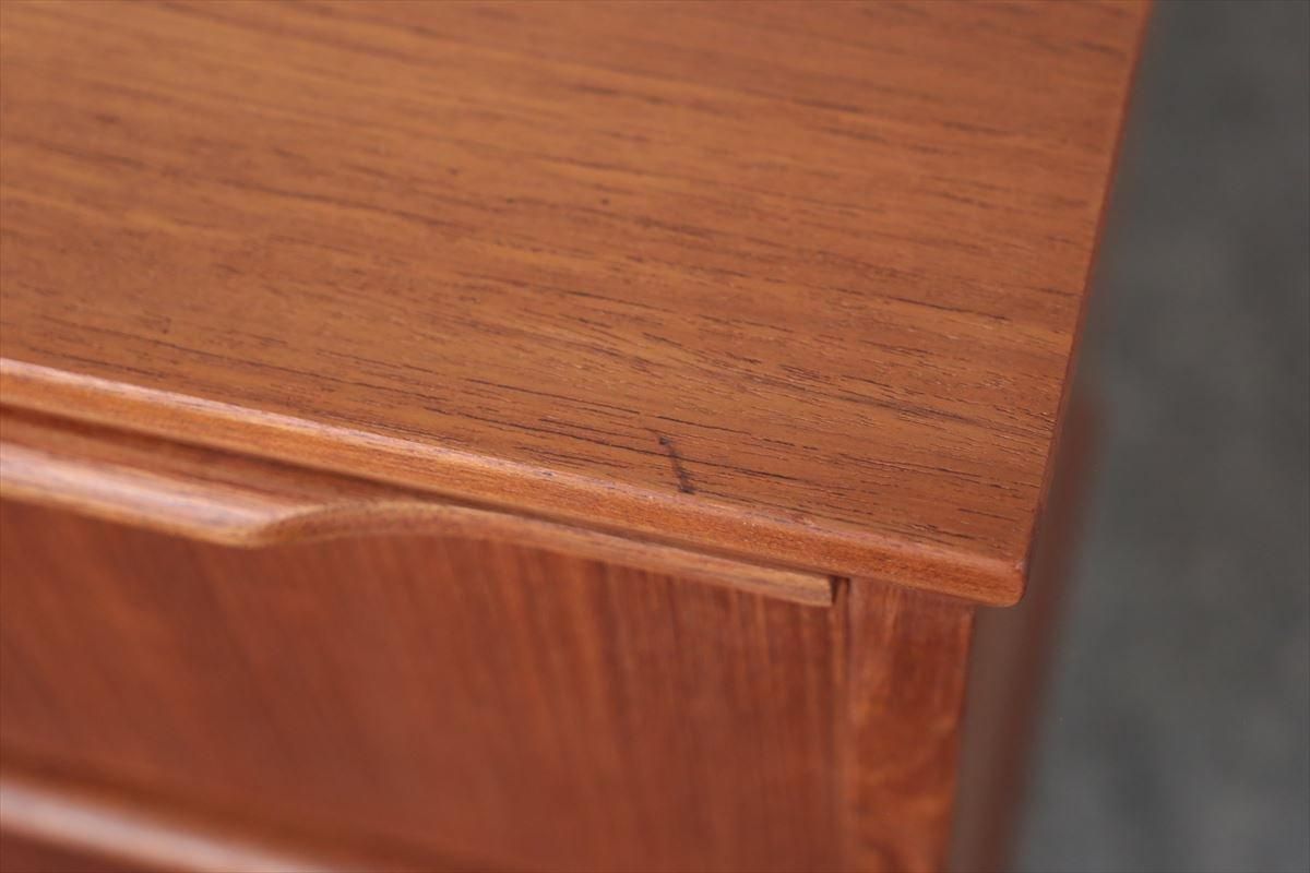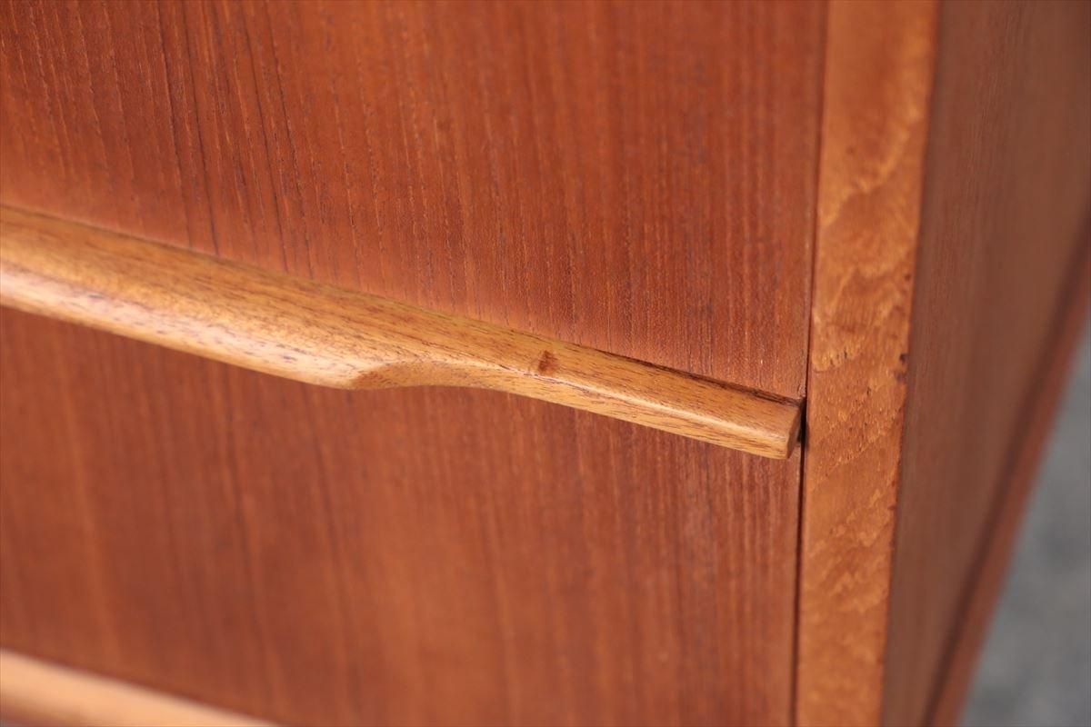 デンマークのチークの3段チェストです。 引き出しが深めでお気に入りのものをディスプレイしながら、衣類や身の回りの小物などの収納に便利です。 持ち手や脚の形がヴィンテージらしいデザインです。 高さが78cmと物を置いたり飾りやすい高さです。 引き出し内部に小さな欠けや再接着の跡がありますが、強度には問題が無いことを確認済みです。 その他に縁や脚に細かいキズや小さなキズなど多少使用感はありますが、良いコンディションです。