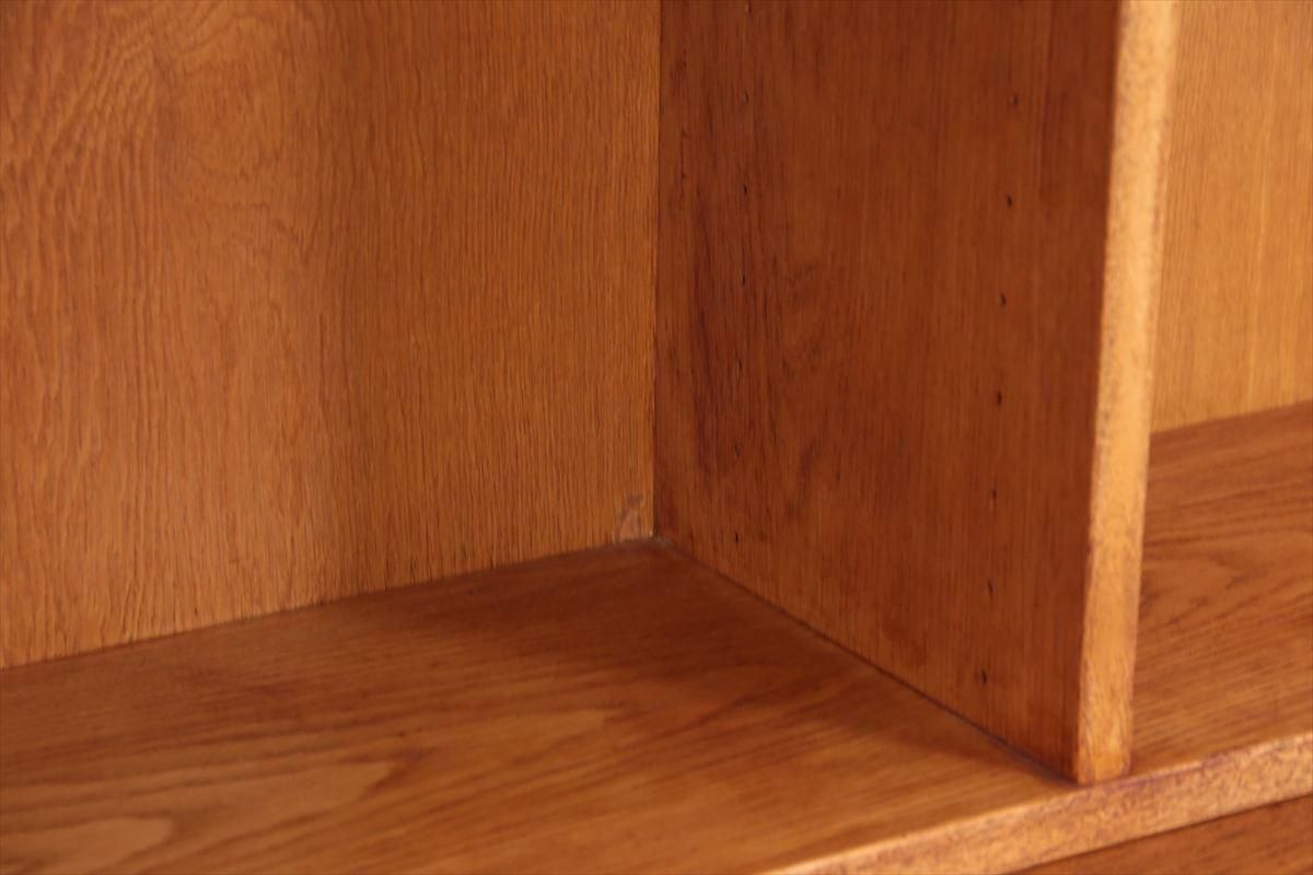 Borge Mogensen(ボーエ・モーエンセン) デザインのブックケースです。シンプルで温かみのあるデザインはモーエンセンならではです。 こちらはスウェーデンの家具メーカーKarl Andersson'sで製作されたもので、 '60年代当時は同じ幅で様々な組み合わせが出来る家具シリーズとしてとても人気がありました。扉のみチークでその他はオーク材で構成されています。 キッチンやリビングで飾り棚や食器棚として様々に活躍してくれます。 上部はシンプルなオープン棚で棚板を34段階の高さ調節が可能です。下段は引戸タイプで隠したいものもすっきりと収納できます。 棚板は15段階の高さ調節が可能です。 引き戸の中にはイエローに可愛く塗装された箱引き出しが1つ付いていました。 画像の様に背板の表面の突板がひび割れた跡や、割れを埋めて補修した箇所がいくつかありますがご使用や強度には問題はございません。また、全体に日焼けによる色の差や色むらがあります。下段の扉内の背板に小さな穴や輪ジミがあります。 その他の細かいキズ、凹みなど多少使用感はありますが、造りはしっかりとしておりヴィンテージ家具の風合いをお楽しみいただけます。