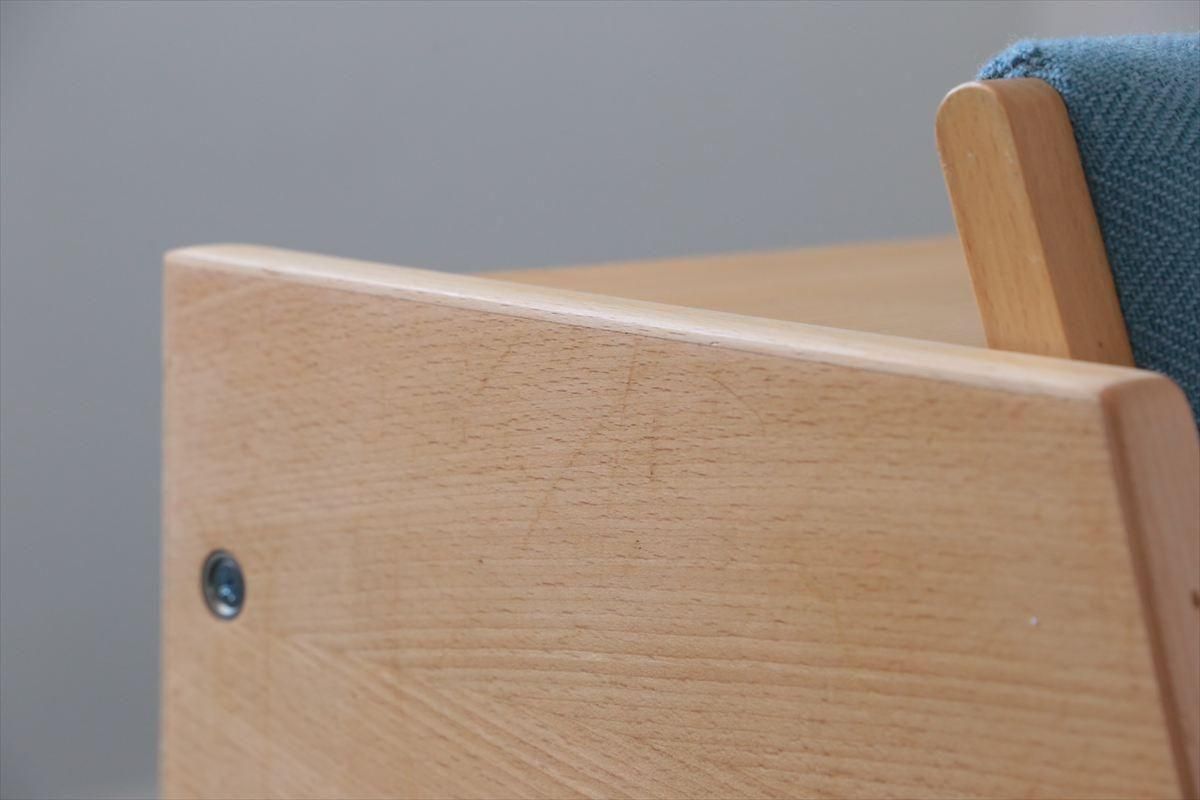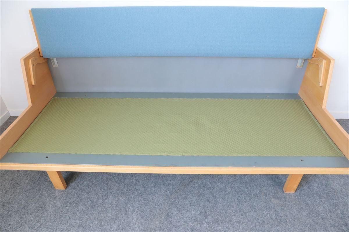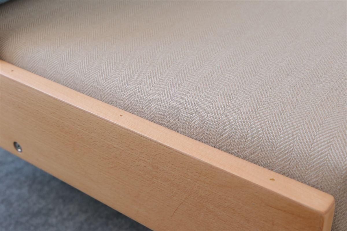 Hans J .Wegner(ハンスJウェグナー)のディベッドソファ「GE258」です。 こちらはビーチの角脚のタイプで、GETAMA社で製造されていたものです。通常はソファとして、背もたれを上にスライドさせ持ち上げるとベッドとして使用できます。 来客用のベッドや、お昼寝などにもいいですね。ゆったりとくつろげます。 ソファ時には背もたれ内部に枕やブランケットなどを収納することも出来ます。 ファブリックはRIBACO社のTRシリーズ(素材:ウール30%、アクリル70%)で張り替えました。 背は淡いブルー、座面はベージュのツートンカラーです。 座面はウレタンのみのタイプで硬めの座り心地です。 フレームにGETAMAの刻印は入っていませんが、シートはGETAMAのロゴが入ったものが張られていました。現在は新しいキルティングに交換しています。当時は公共の施設でも使用されており、数多く生産されていたシリーズです。そのため刻印が無いことが多く、後期はGETAMAのシールが貼られていました。 側面の板に穴や欠けを埋めた跡が数か所あります。 また、横板の縁にも小さなビス穴の跡がありましたが こちらもなるべく目立たない様に補修と着色をしています。 その他にも脚の土台付近にひび割れの補修跡や細かいキズがある為、これらを考慮した割引価格です。強度やご使用には問題はありませんのでご安心ください。