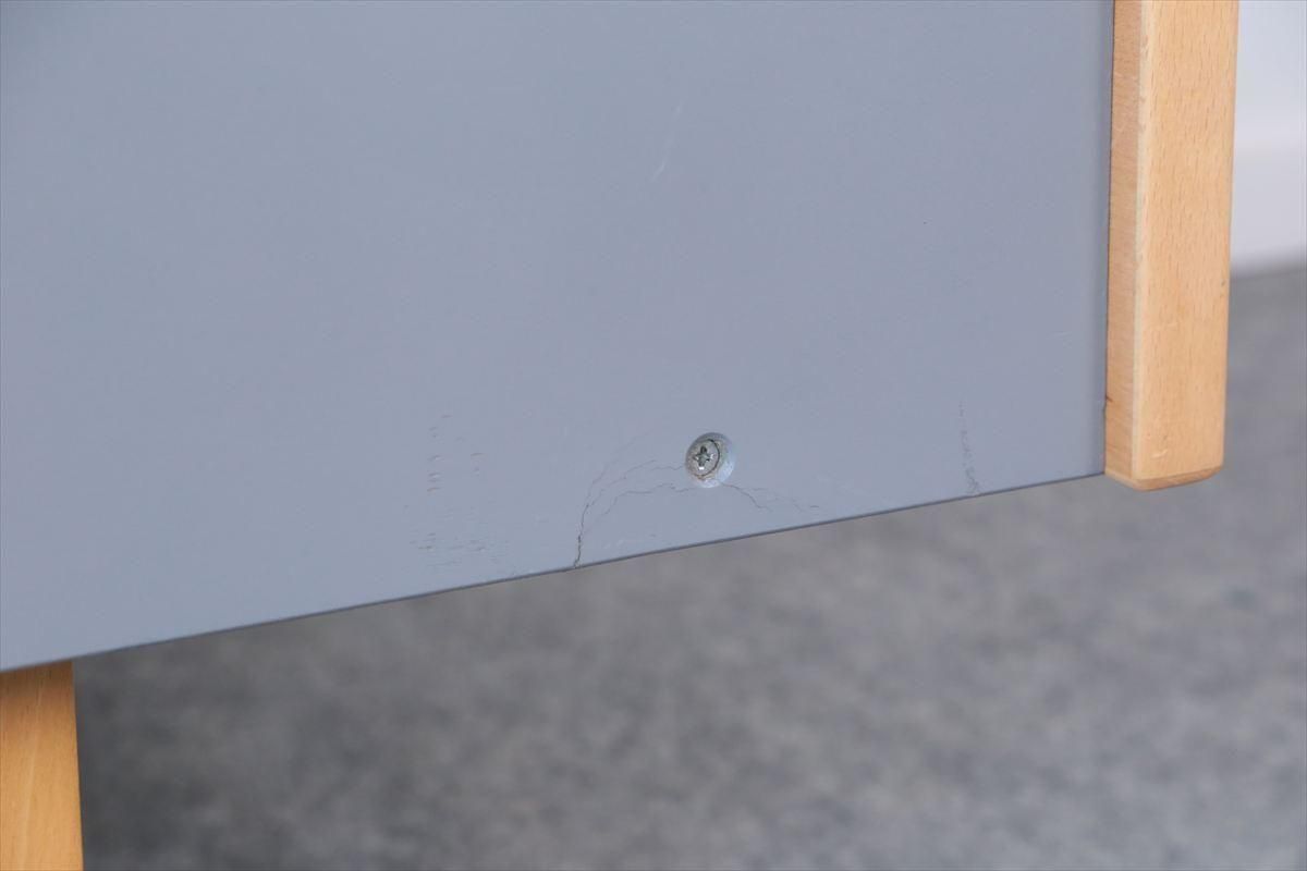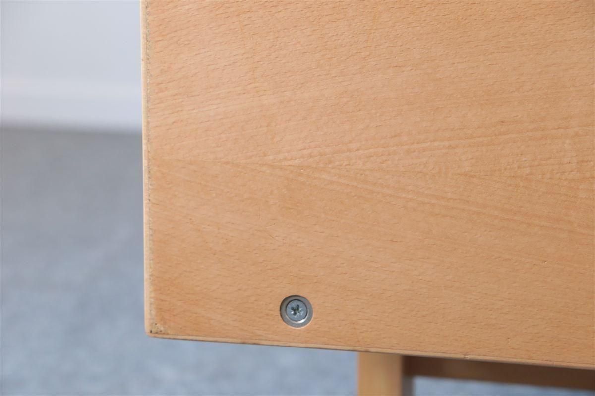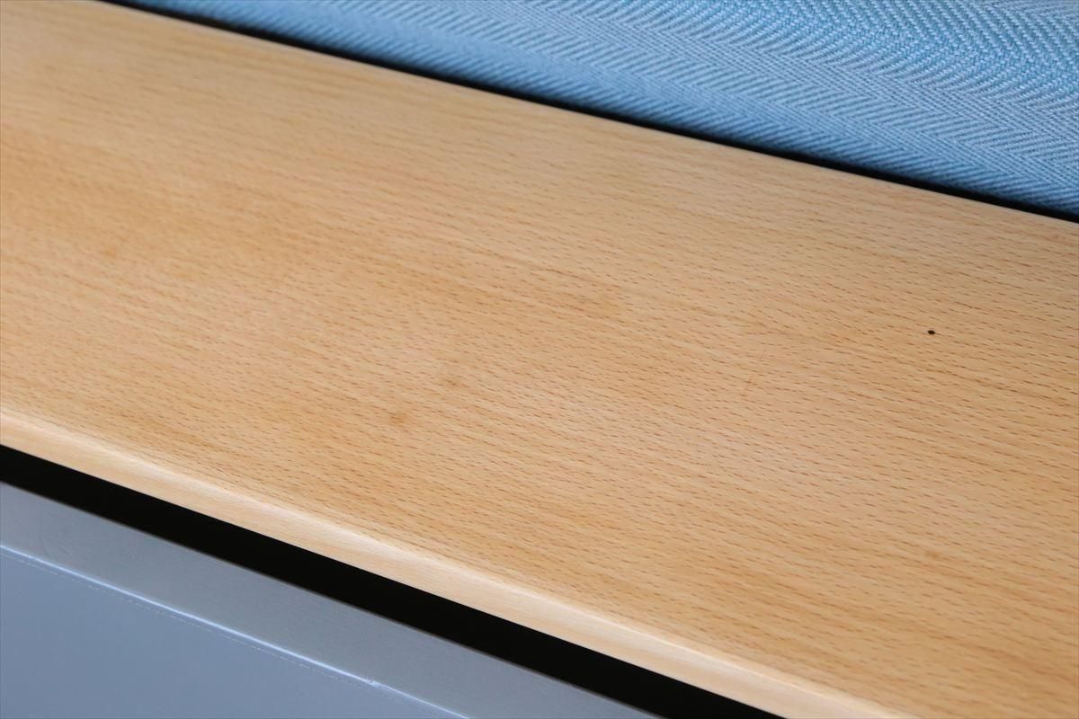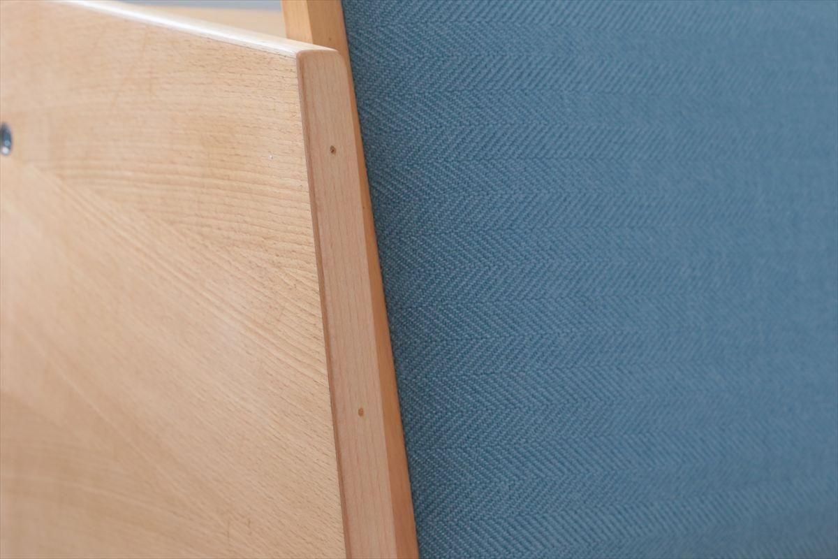 Hans J .Wegner(ハンスJウェグナー)のディベッドソファ「GE258」です。 こちらはビーチの角脚のタイプで、GETAMA社で製造されていたものです。通常はソファとして、背もたれを上にスライドさせ持ち上げるとベッドとして使用できます。 来客用のベッドや、お昼寝などにもいいですね。ゆったりとくつろげます。 ソファ時には背もたれ内部に枕やブランケットなどを収納することも出来ます。 ファブリックはRIBACO社のTRシリーズ(素材:ウール30%、アクリル70%)で張り替えました。 背は淡いブルー、座面はベージュのツートンカラーです。 座面はウレタンのみのタイプで硬めの座り心地です。 フレームにGETAMAの刻印は入っていませんが、シートはGETAMAのロゴが入ったものが張られていました。現在は新しいキルティングに交換しています。当時は公共の施設でも使用されており、数多く生産されていたシリーズです。そのため刻印が無いことが多く、後期はGETAMAのシールが貼られていました。 側面の板に穴や欠けを埋めた跡が数か所あります。 また、横板の縁にも小さなビス穴の跡がありましたが こちらもなるべく目立たない様に補修と着色をしています。 その他にも脚の土台付近にひび割れの補修跡や細かいキズがある為、これらを考慮した割引価格です。強度やご使用には問題はありませんのでご安心ください。