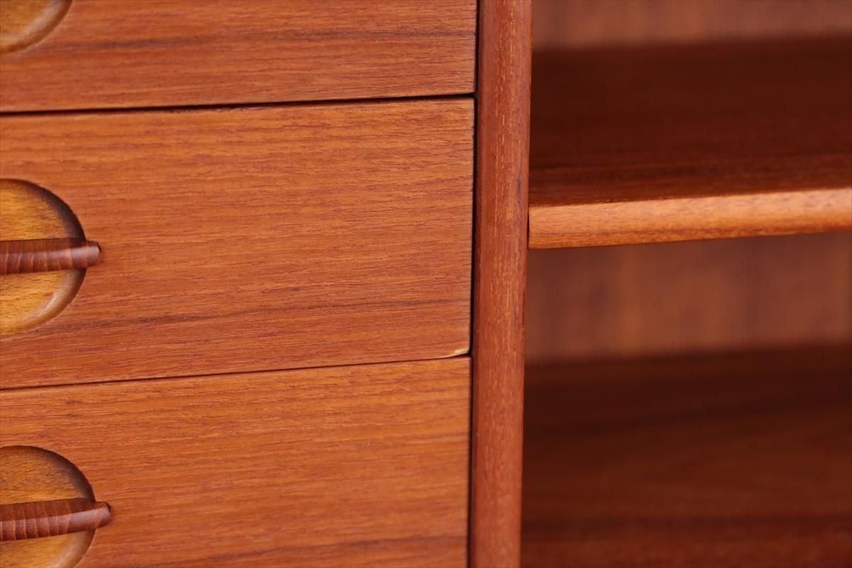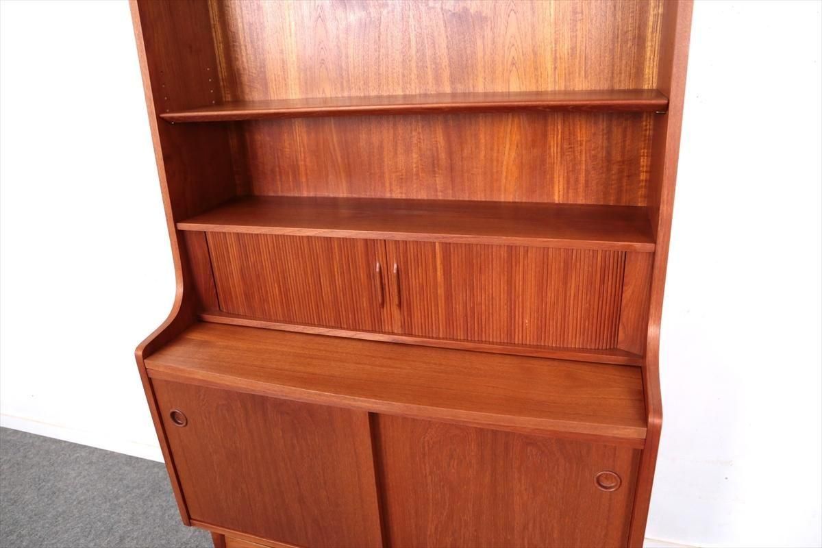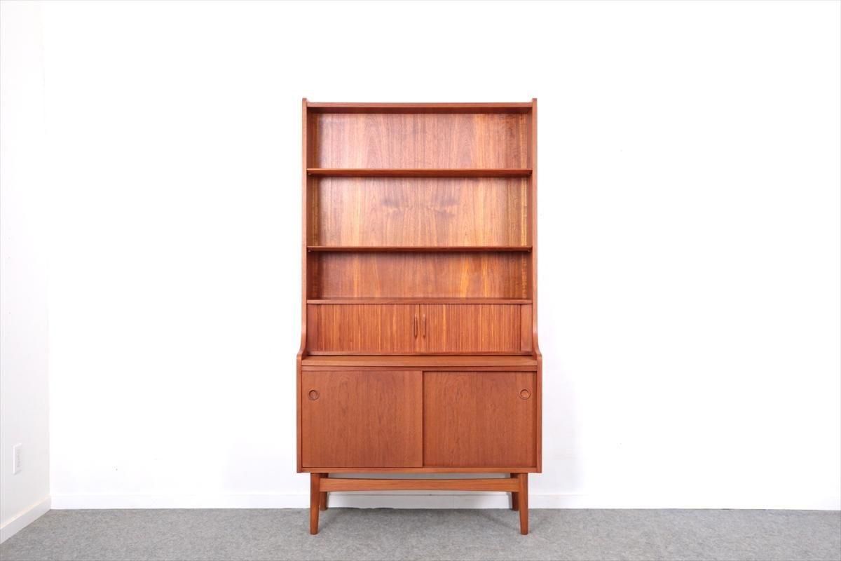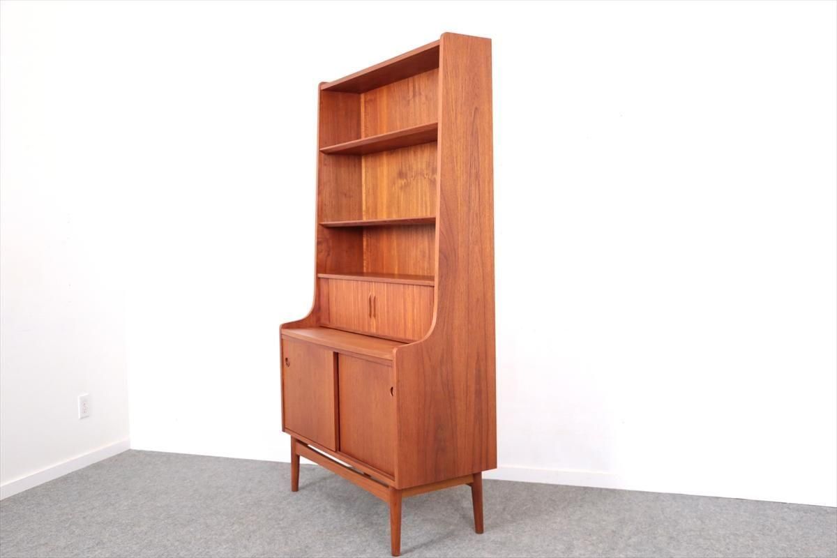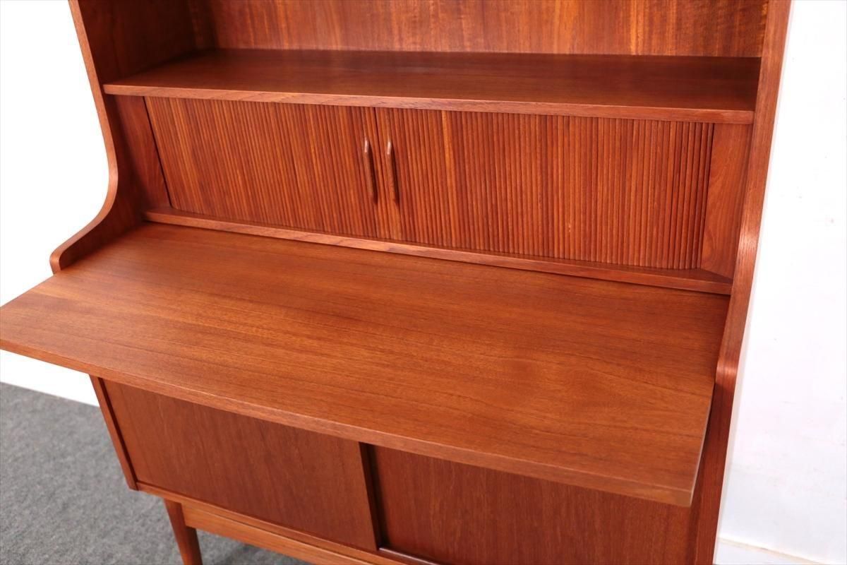 デンマークの家具メーカーBornholms Mobelfabrik社製のJohannes Sorth(ヨハネス・ソース)によるデザインのチークの蛇腹のブックビューローです。 本や小物、食器などお気に入りのものをディスプレイしながら、 リビングやキッチンなどで飾り棚や食器棚として様々に楽しめます。 天板はスライド式で簡単に引き出すことができ、必要な時にデスクとして使用できます。 蛇腹は細い木を裏から布テープで張り合わせて作られ、 小引き出しや持ち手のデザインなど小さな部分も手の込んだ作りになっています。棚板は5段階の高さ調節が可能です。 画像のような細かいキズや小さな欠けなど 多少使用感はありますが、がたつきなどはなく良いコンディションです。