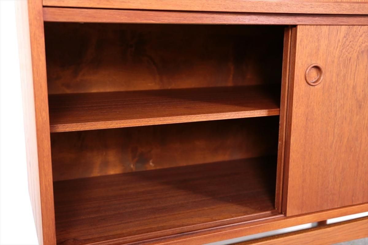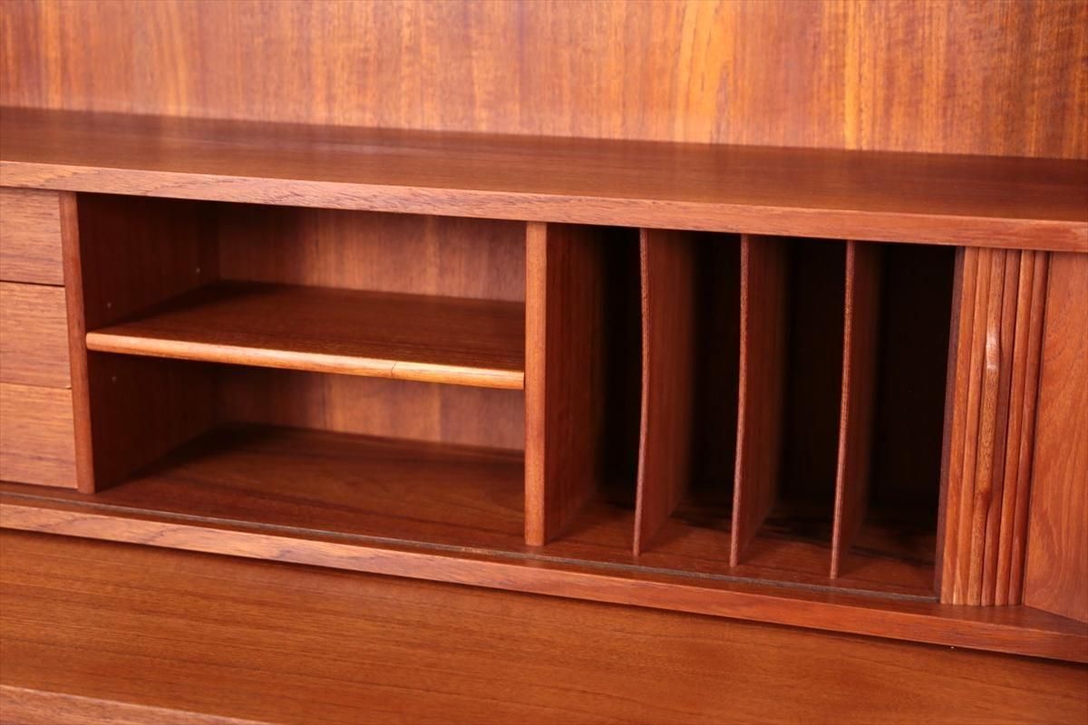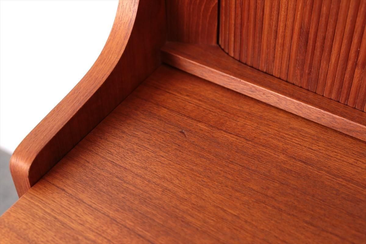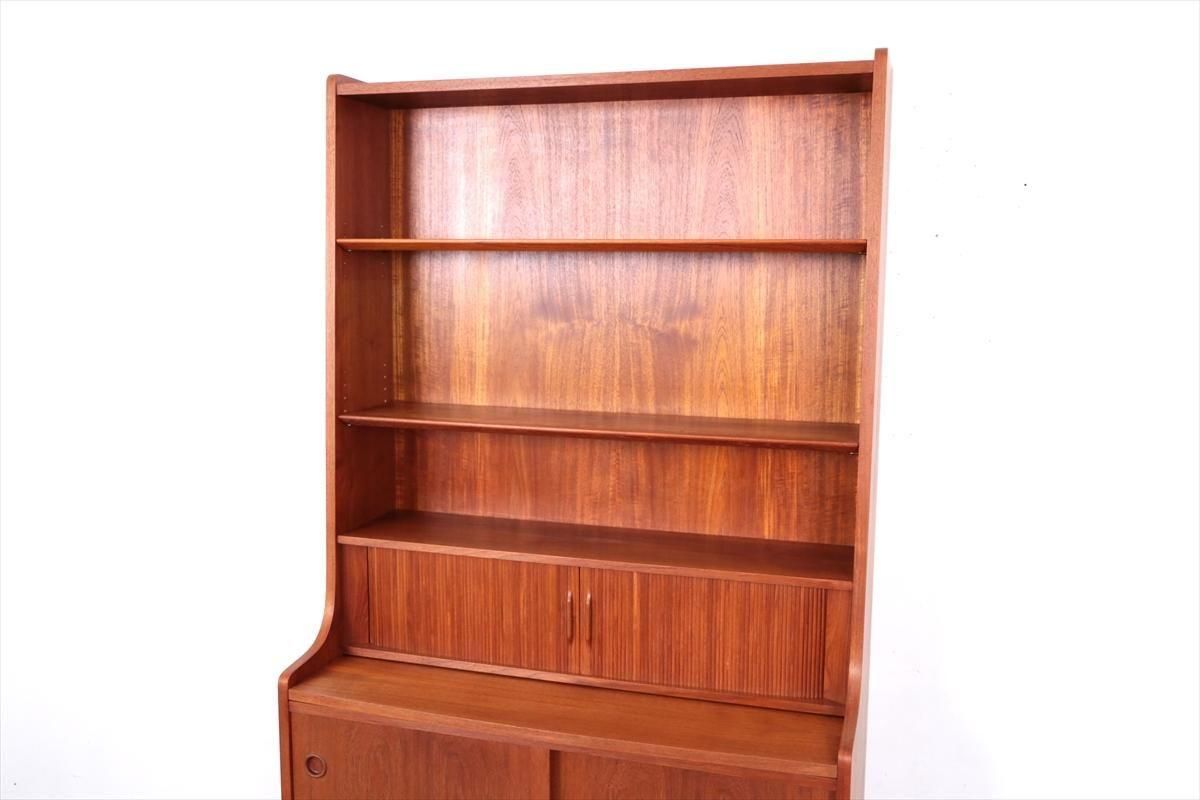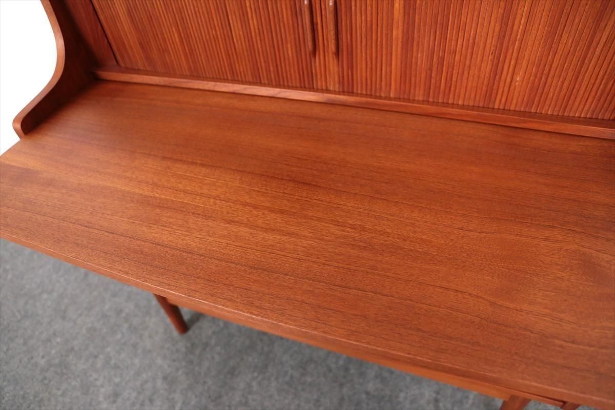 デンマークの家具メーカーBornholms Mobelfabrik社製のJohannes Sorth(ヨハネス・ソース)によるデザインのチークの蛇腹のブックビューローです。 本や小物、食器などお気に入りのものをディスプレイしながら、 リビングやキッチンなどで飾り棚や食器棚として様々に楽しめます。 天板はスライド式で簡単に引き出すことができ、必要な時にデスクとして使用できます。 蛇腹は細い木を裏から布テープで張り合わせて作られ、 小引き出しや持ち手のデザインなど小さな部分も手の込んだ作りになっています。棚板は5段階の高さ調節が可能です。 画像のような細かいキズや小さな欠けなど 多少使用感はありますが、がたつきなどはなく良いコンディションです。