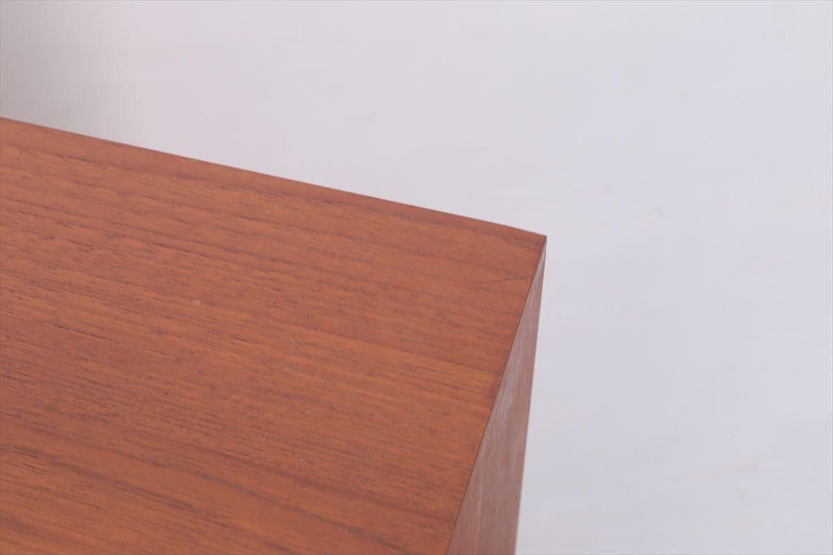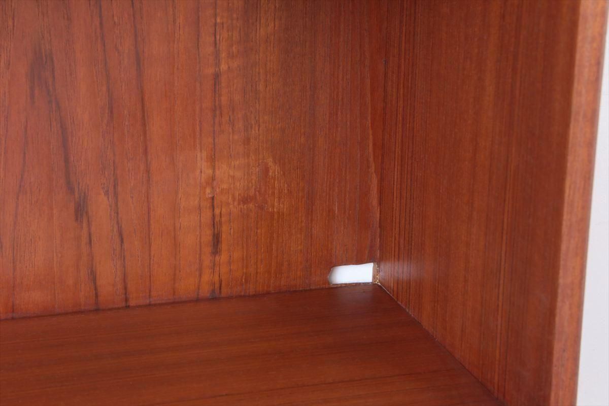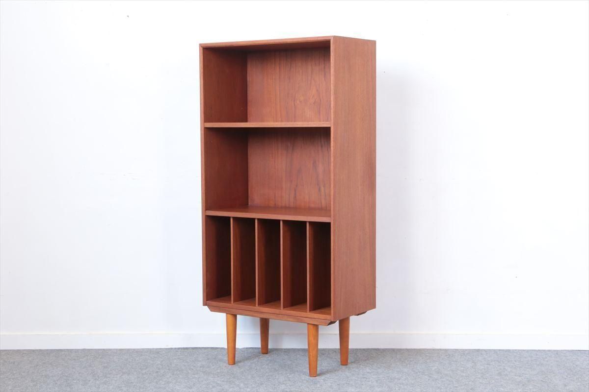 デンマークのチークのオープンブックケースです。 棚のみのシンプルなデザインで、上の棚板は5段階の高さ調節ができます。 また、一番下の縦の仕切り板も動かすことが出来ます。こちらは当時レコードと収納していたのではないでしょうか。 当時の本棚にはよく見られる仕様で、棚板側面に溝があり、その溝にワイヤーを添わせて棚板を固定する構造ならではの面白いつくりです。 画像の様に背板に小さな四角の穴が開いています。 その他に小さなキズや穴を埋めた跡など多少使用感はありますが、良いコンディションです