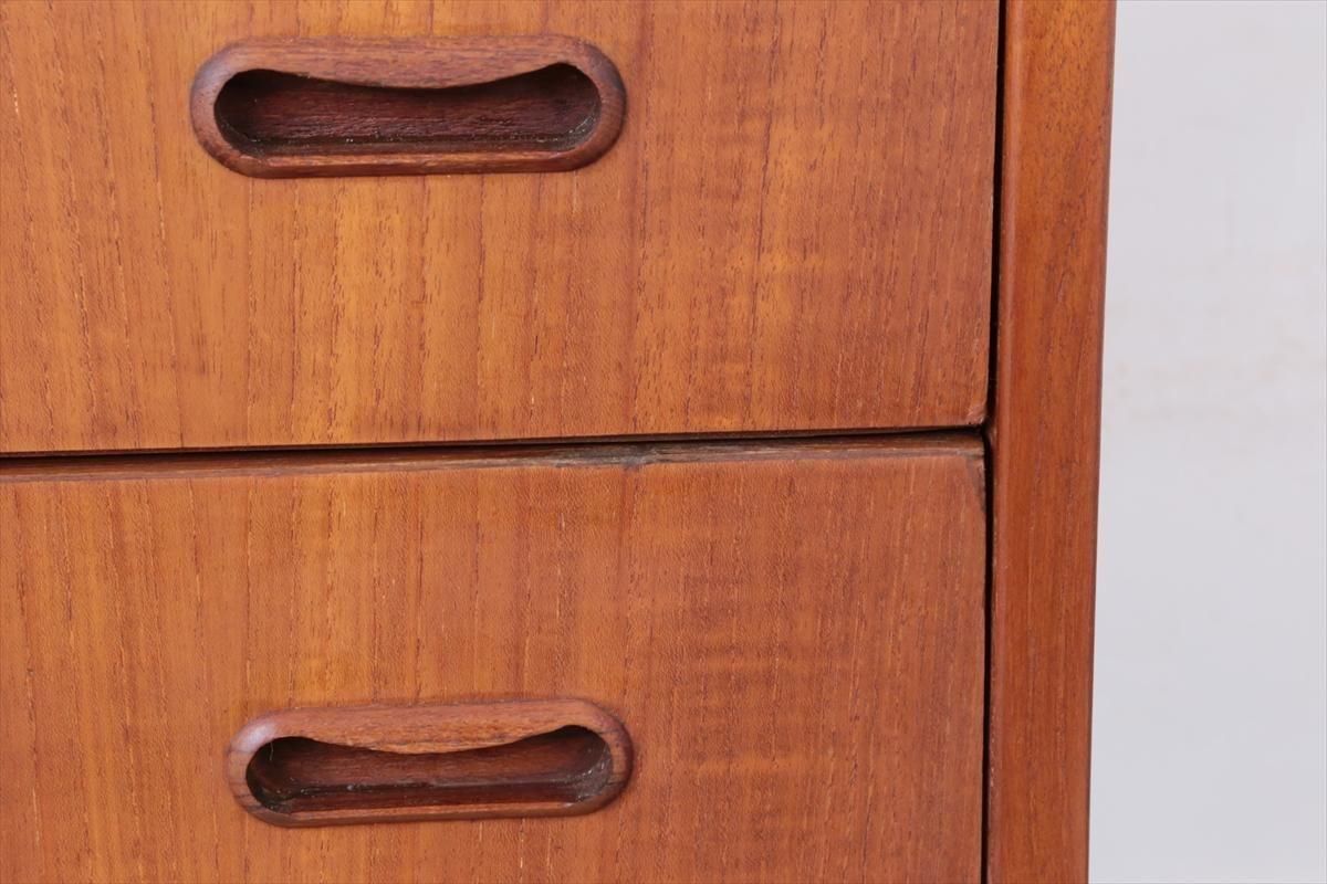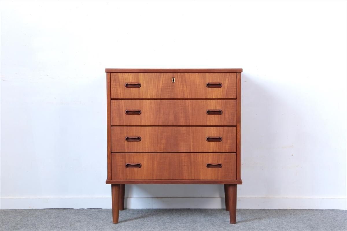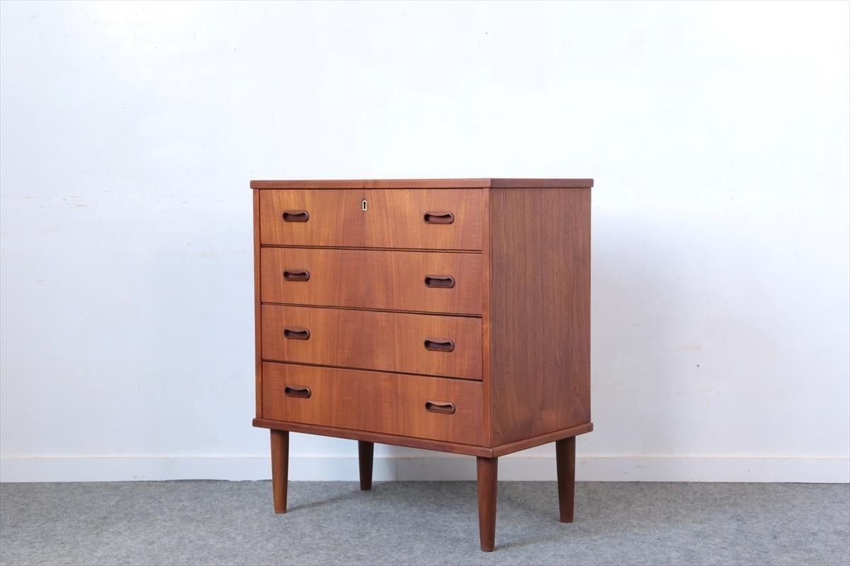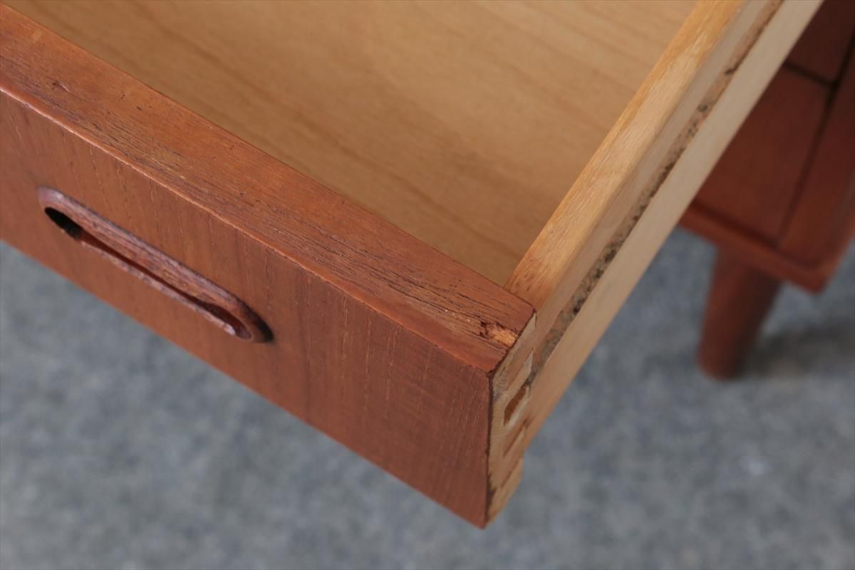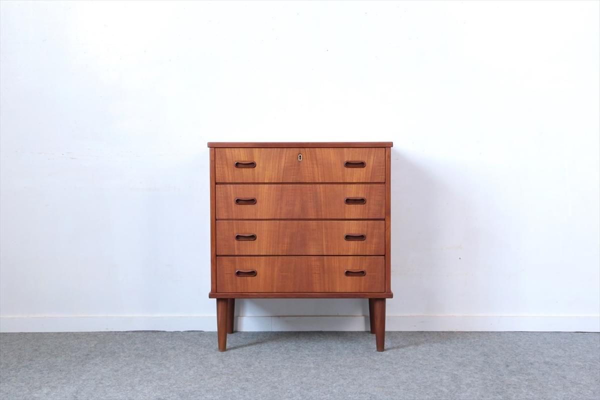 デンマークのチークの4段チェストです。 持ち手の形が可愛らしく、デンマークヴィンテージらしいデザインです。 幅が66cmとスリムなサイズで、高さも76cmと低めで上に物を置きやすい高さです。 お気に入りのものをディスプレイしながら、衣類や身の回りの小物などの収納に便利です。 横面の突板が薄くなった所をペイント補修しています。 また、引き出しの縁に突板が欠けた跡が2箇所あります。 その他に天板や縁に細かなキズなや、引き出しの内部にわずかなシミなど多少使用感はありますが、 がたつきなど無く良いコンディションです。
