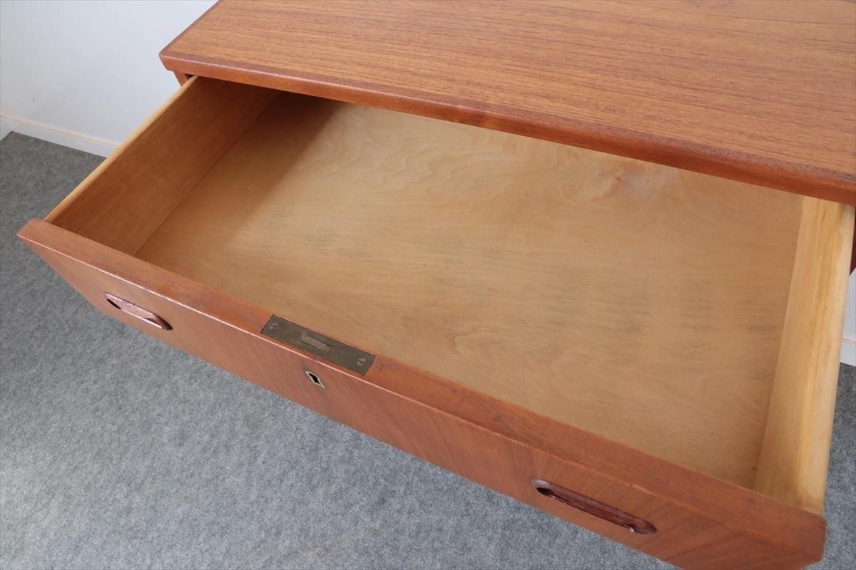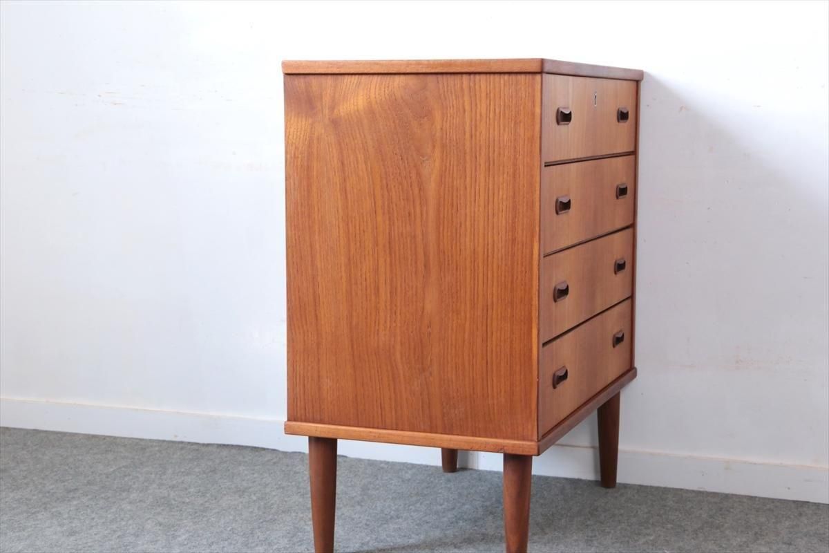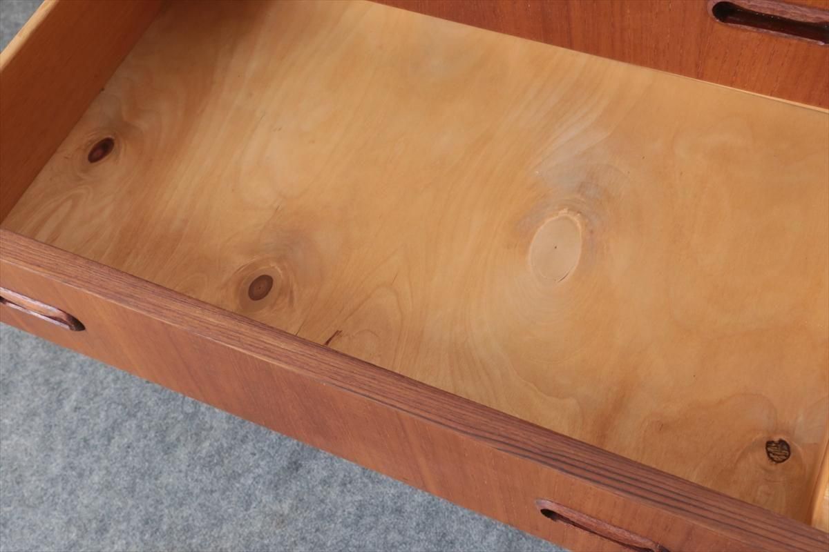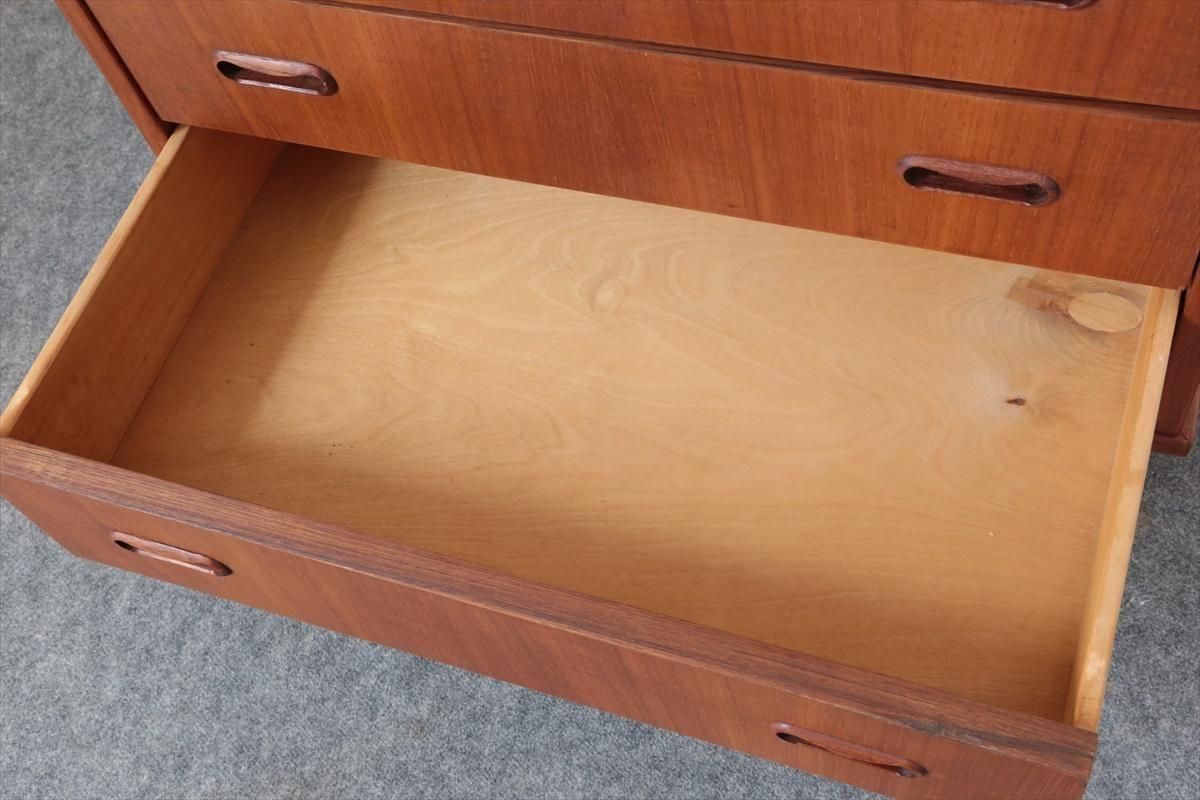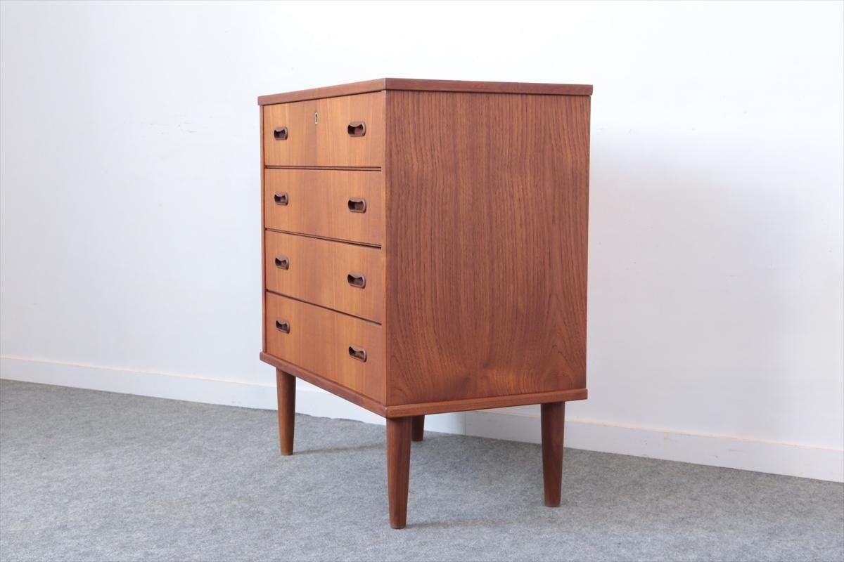 デンマークのチークの4段チェストです。 持ち手の形が可愛らしく、デンマークヴィンテージらしいデザインです。 幅が66cmとスリムなサイズで、高さも76cmと低めで上に物を置きやすい高さです。 お気に入りのものをディスプレイしながら、衣類や身の回りの小物などの収納に便利です。 横面の突板が薄くなった所をペイント補修しています。 また、引き出しの縁に突板が欠けた跡が2箇所あります。 その他に天板や縁に細かなキズなや、引き出しの内部にわずかなシミなど多少使用感はありますが、 がたつきなど無く良いコンディションです。
