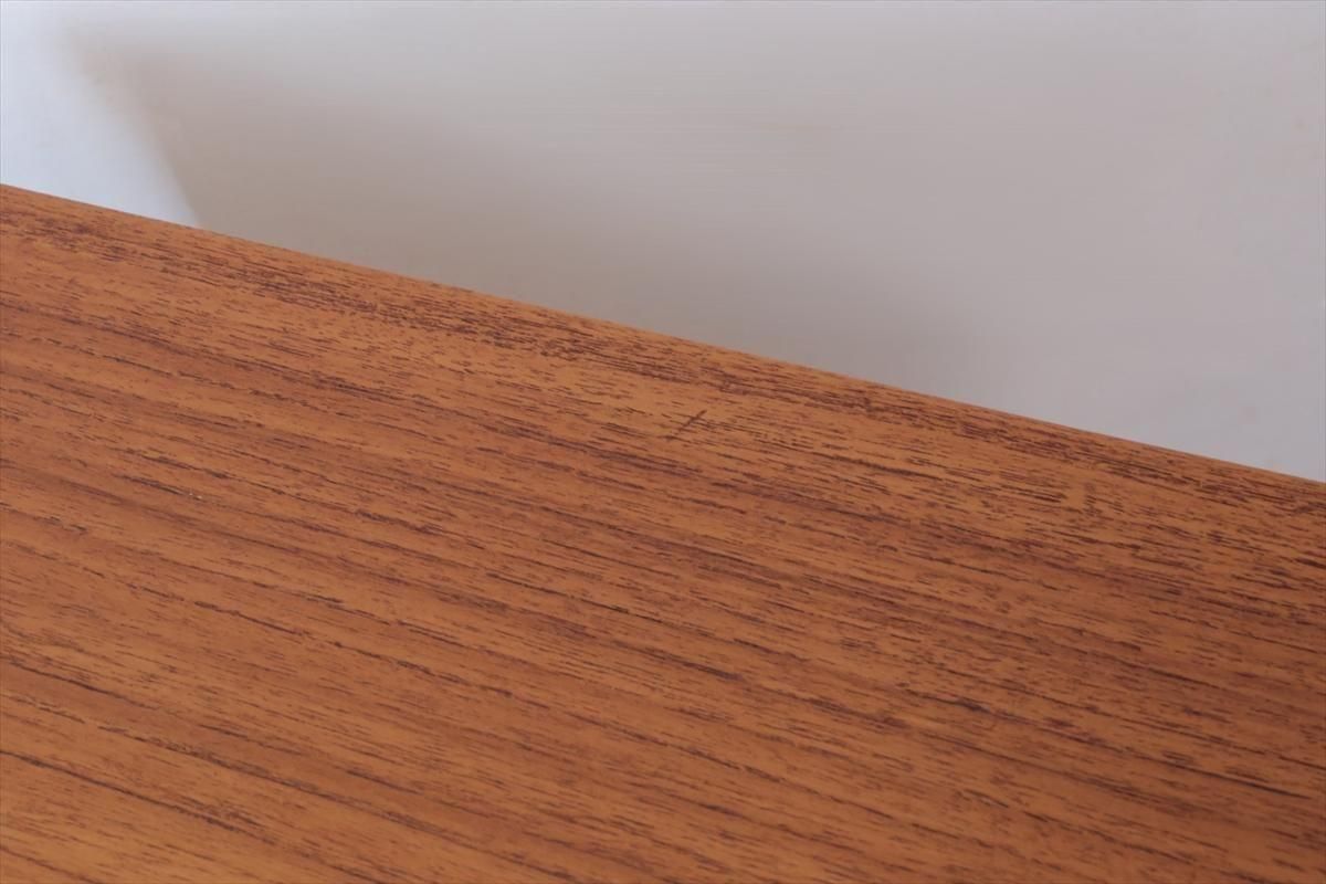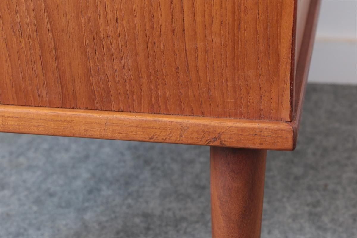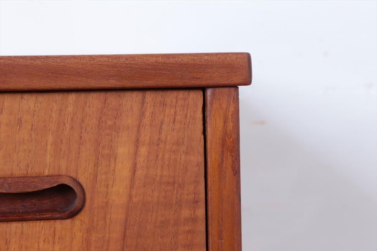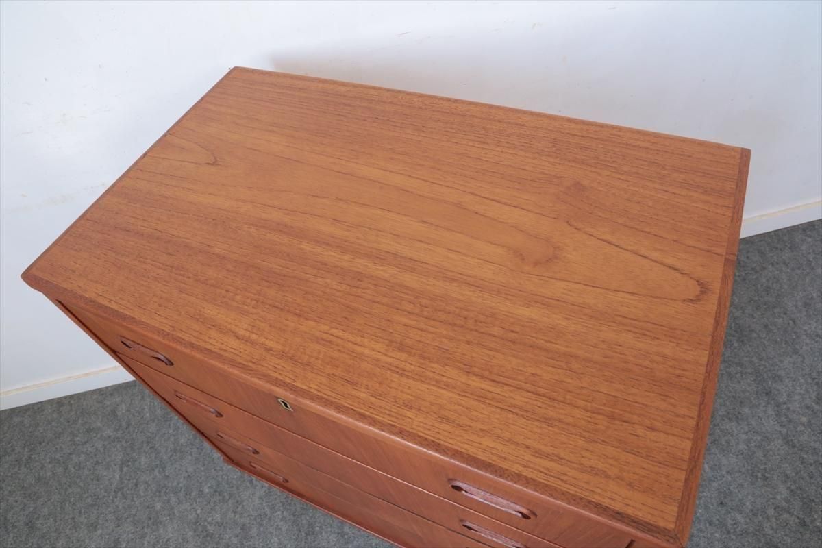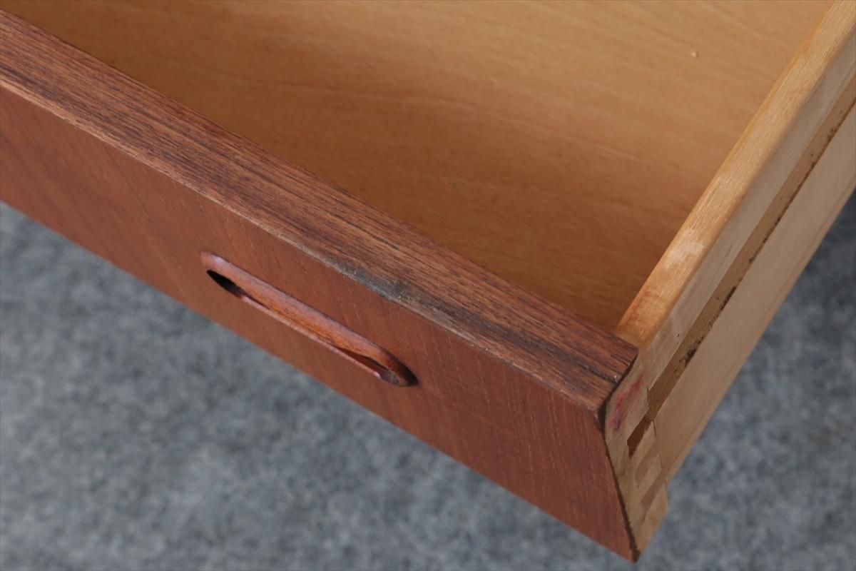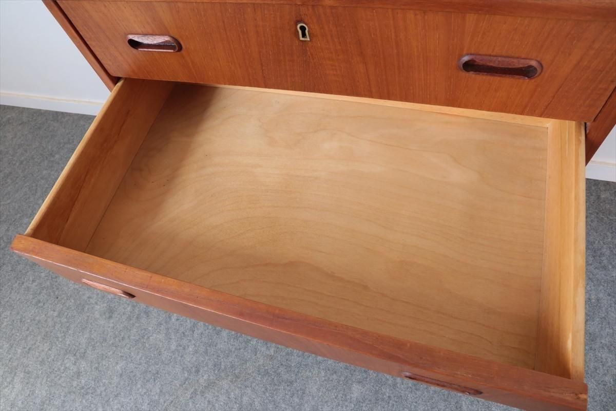 デンマークのチークの4段チェストです。 持ち手の形が可愛らしく、デンマークヴィンテージらしいデザインです。 幅が66cmとスリムなサイズで、高さも76cmと低めで上に物を置きやすい高さです。 お気に入りのものをディスプレイしながら、衣類や身の回りの小物などの収納に便利です。 横面の突板が薄くなった所をペイント補修しています。 また、引き出しの縁に突板が欠けた跡が2箇所あります。 その他に天板や縁に細かなキズなや、引き出しの内部にわずかなシミなど多少使用感はありますが、 がたつきなど無く良いコンディションです。