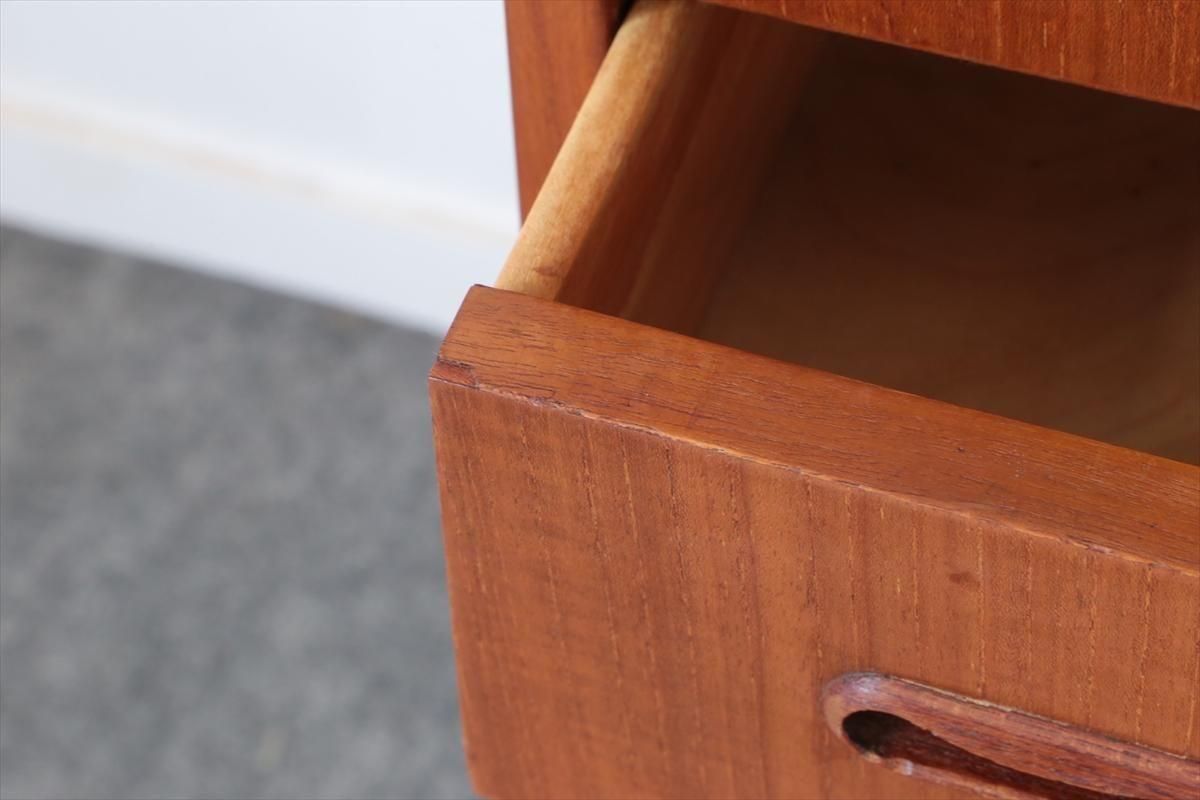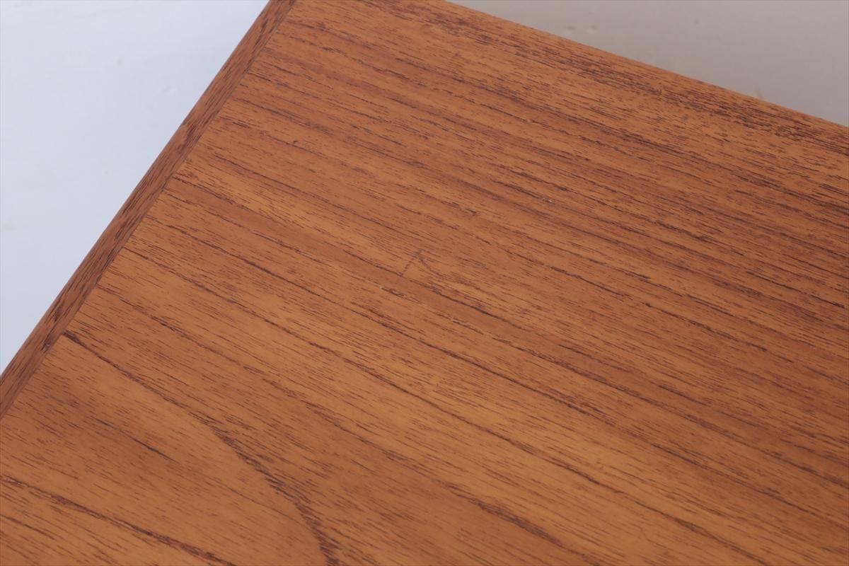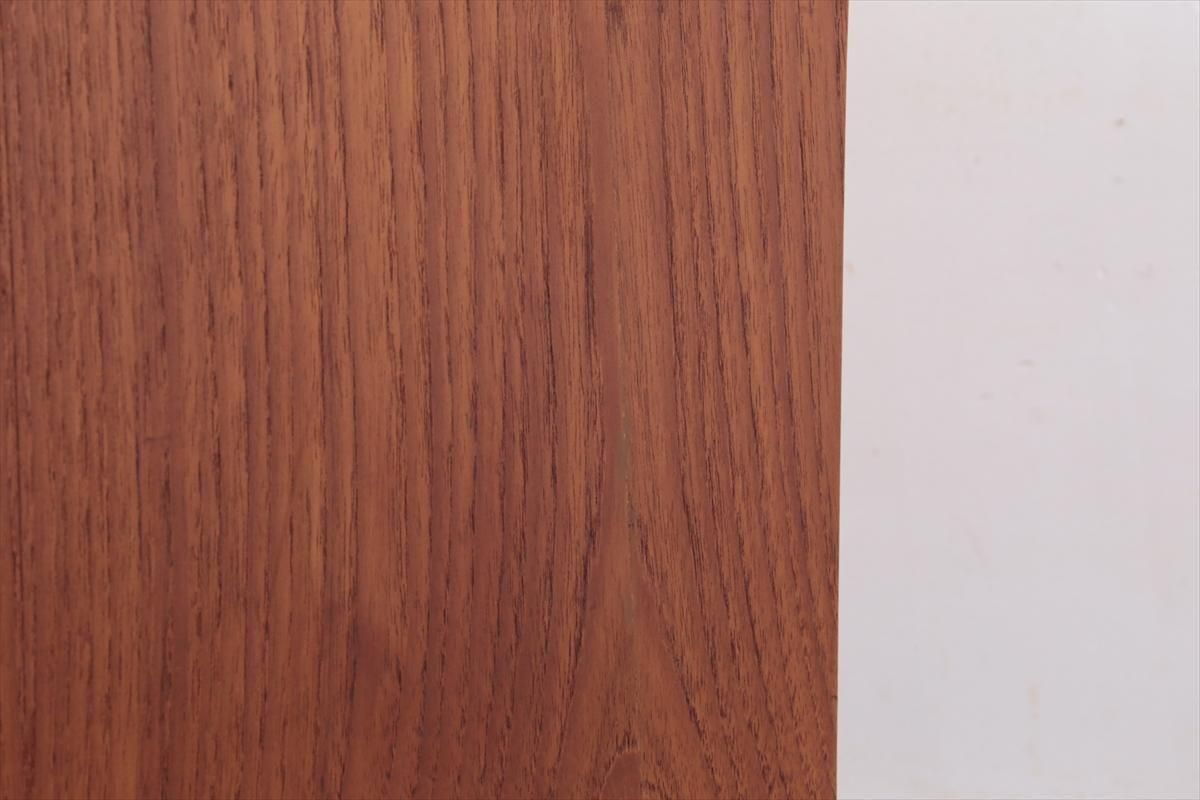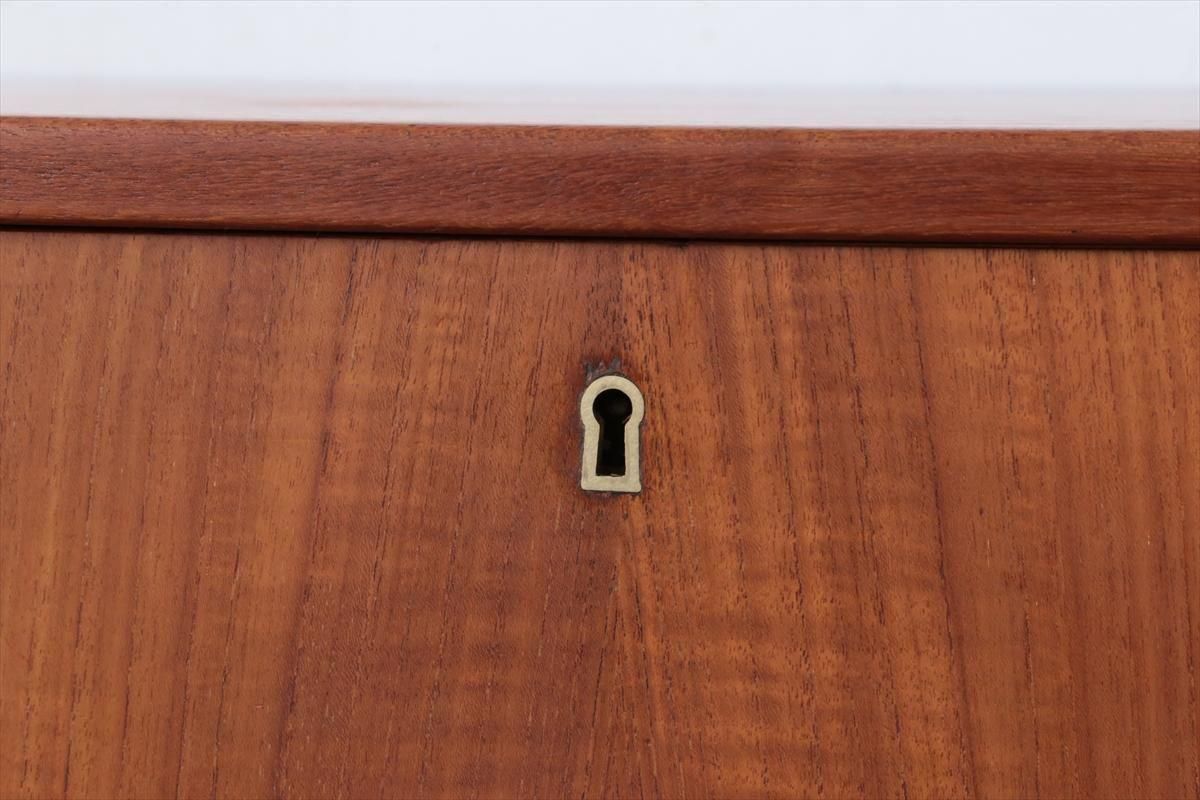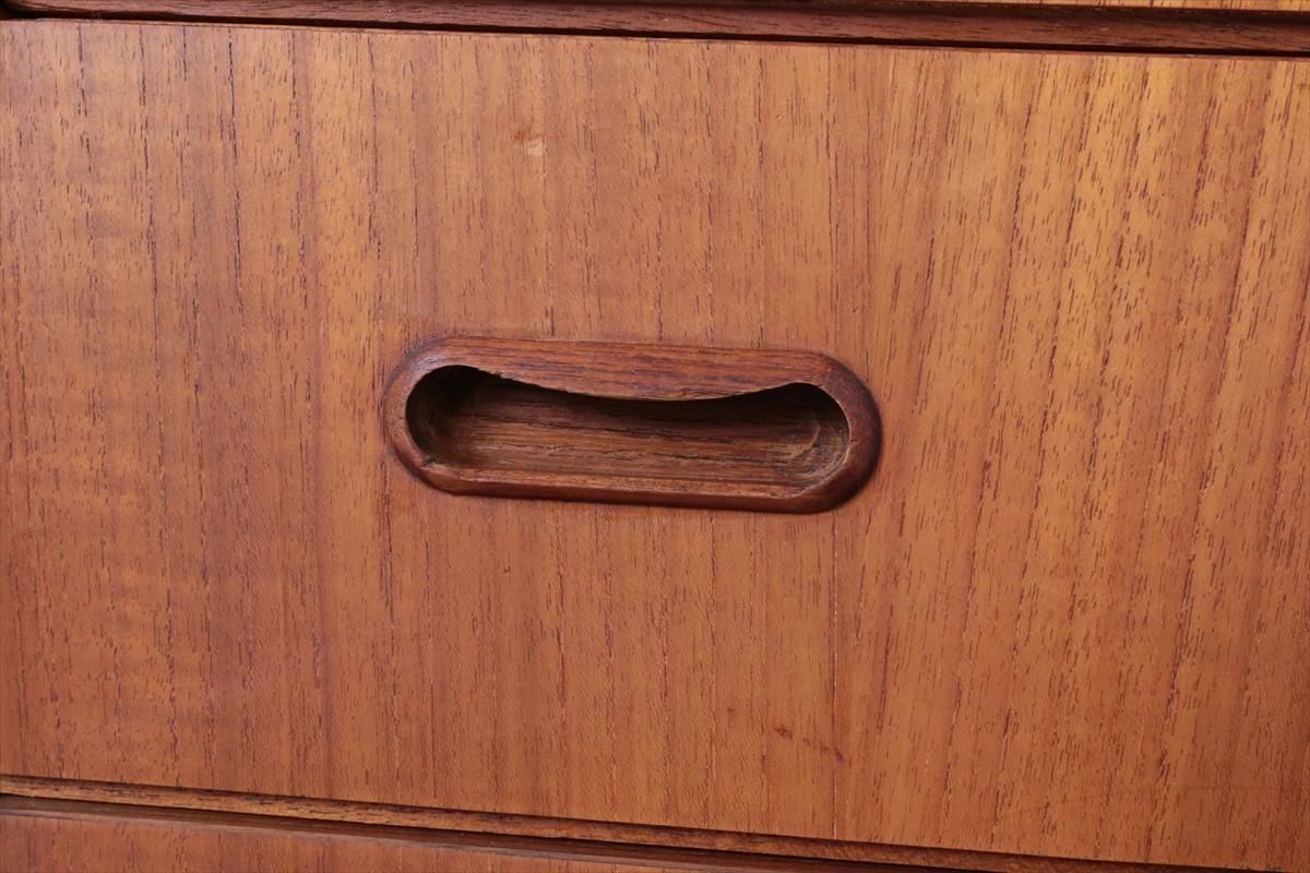 デンマークのチークの4段チェストです。 持ち手の形が可愛らしく、デンマークヴィンテージらしいデザインです。 幅が66cmとスリムなサイズで、高さも76cmと低めで上に物を置きやすい高さです。 お気に入りのものをディスプレイしながら、衣類や身の回りの小物などの収納に便利です。 横面の突板が薄くなった所をペイント補修しています。 また、引き出しの縁に突板が欠けた跡が2箇所あります。 その他に天板や縁に細かなキズなや、引き出しの内部にわずかなシミなど多少使用感はありますが、 がたつきなど無く良いコンディションです。