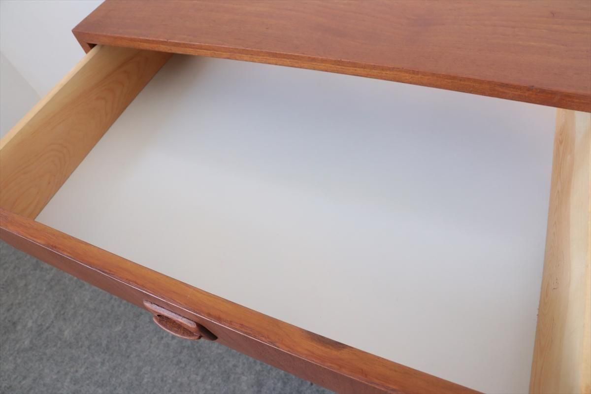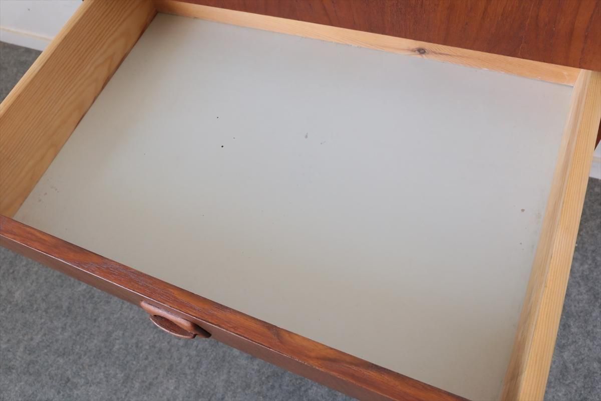 コンパクトなサイズのチークの5段チェストです。 中央に付いた持ち手のデザインがアクセントとなった、かわいらしく懐かしい雰囲気のデザインです。 お気に入りのものをディスプレイしたり、身の回りの小物などをすっきり収納できそうです。 幅が60cmとスリムでちょっとしたスペースにも置くことができます。 1段目の引き出しの底板のみ後から白い光沢のあるペンキで再塗装されているようです。 天板や縁に画像のような小さなキズや凹みキズがあります。 また、引き出しの底板にわずかなシミなど多少使用感がありますが、がたつきなどは無く、良いコンディションです。