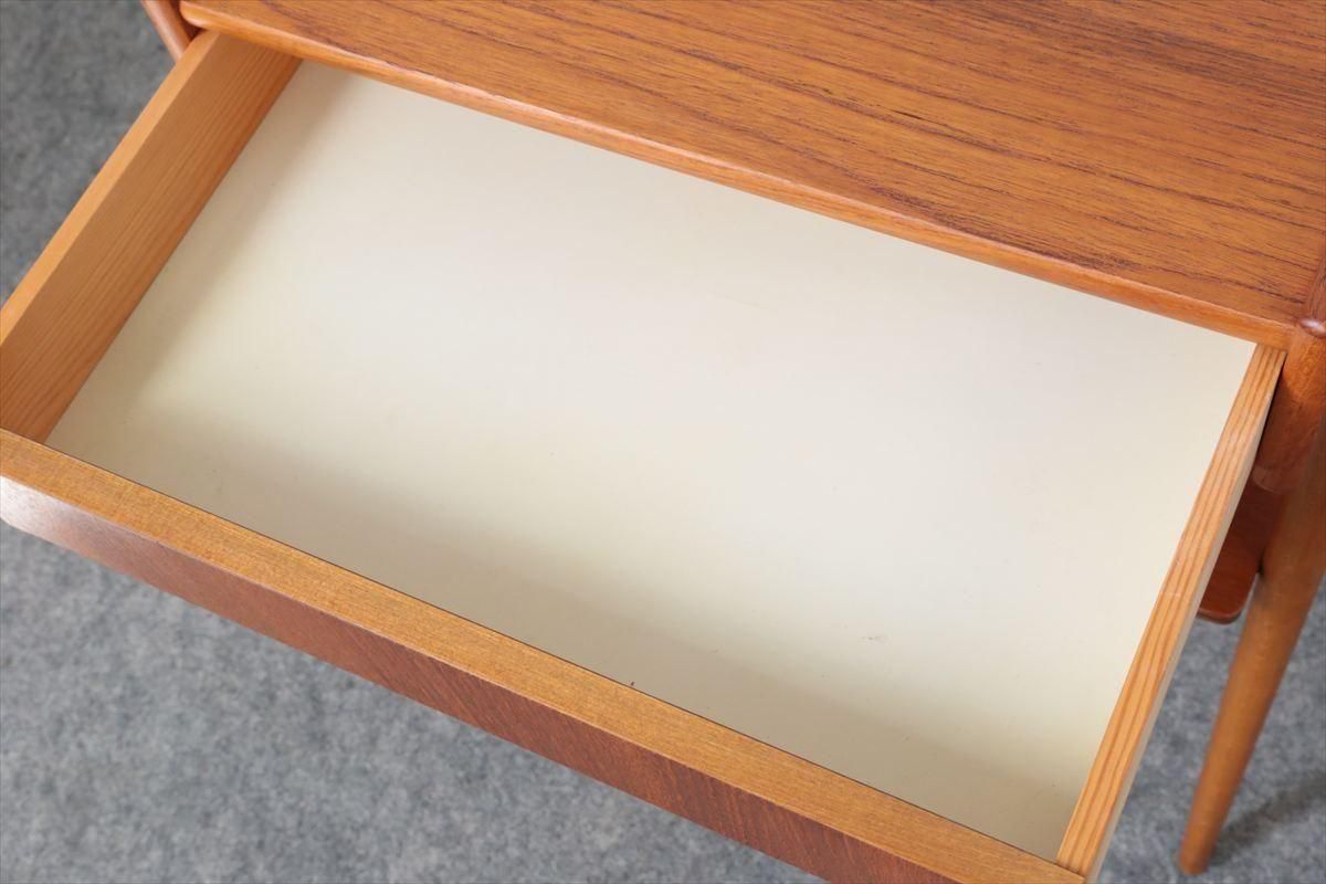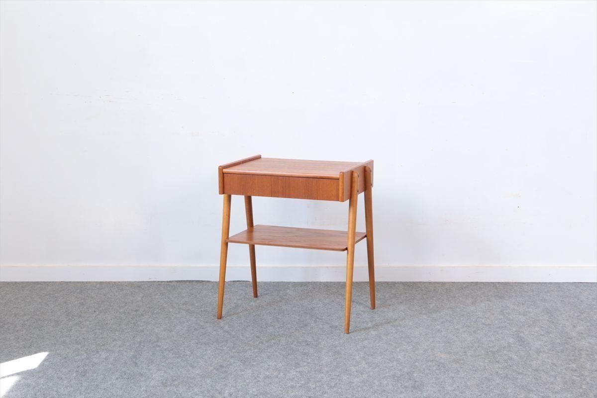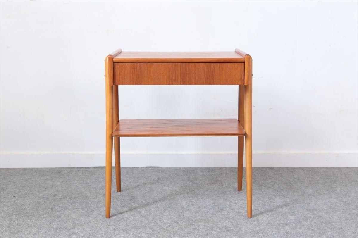 スウェーデンのCarlstrom&Co社製のチークのサイドテーブルです。 明るめのチークに細身のシルエットがアクセントなったスウェーデンらしい軽やかなデザインです。 引き出しが1段とラック付きで、小物の収納に便利です。 ベッドサイドや玄関先、ちょっとしたスペースにアクセントとして置いてみるのも素敵です。 細かいキズなど多少使用感はありますが、良いコンディションです。