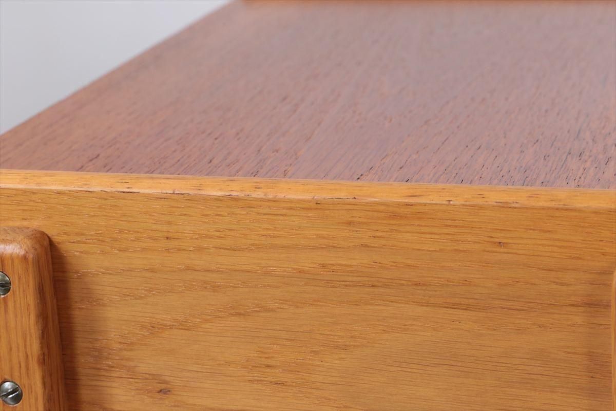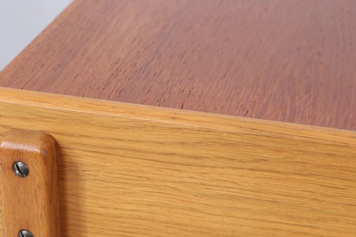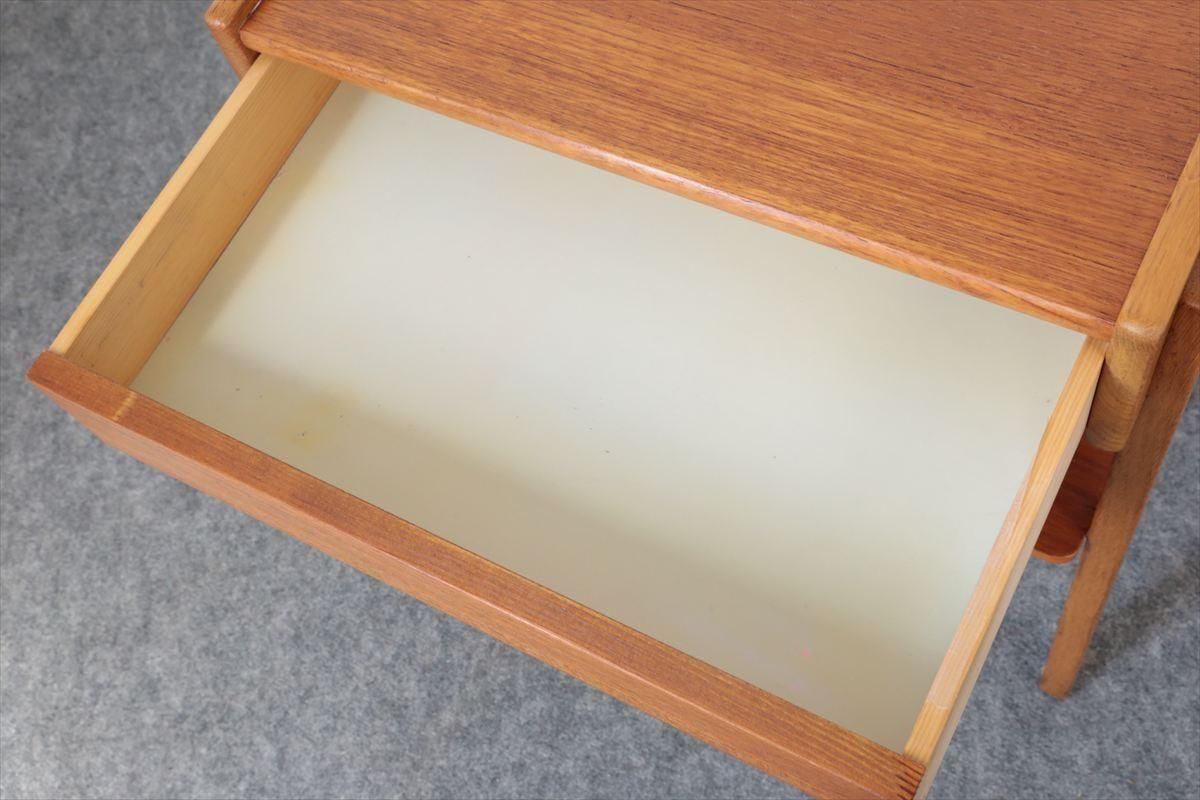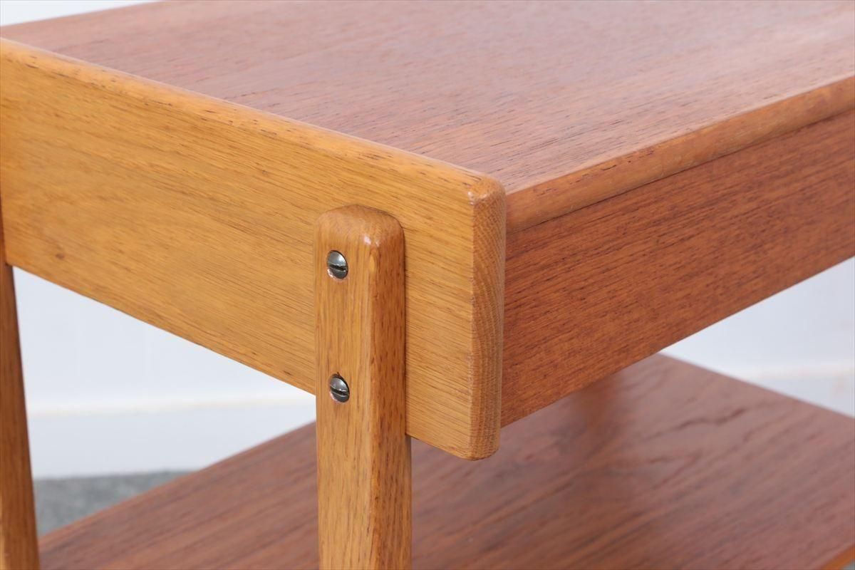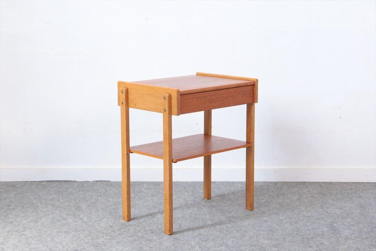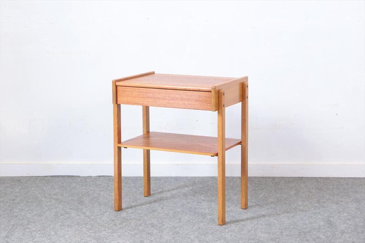 スウェーデンので買い付けたチークのサイドテーブルです。 チーク×オークがアクセントとなった、 スウェーデンらしい軽やかなデザインです。 引き出しが1段とラック付きで、小物の収納に便利です。 ベッドサイドや玄関先、ちょっとしたスペースにアクセントとして置いてみるのも素敵です。 細かいキズや凹みなど多少使用感はありますが、良いコンディションです。