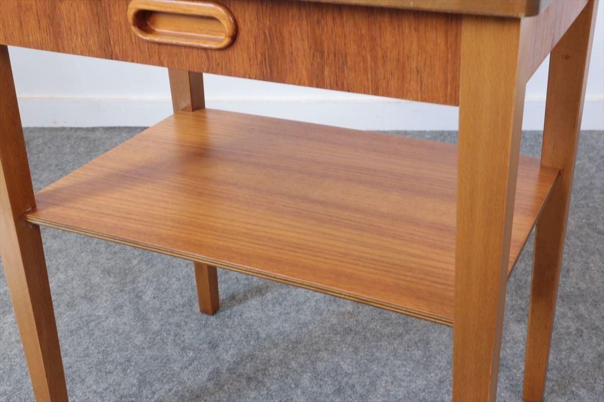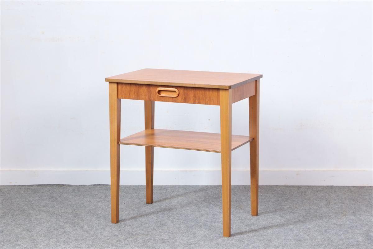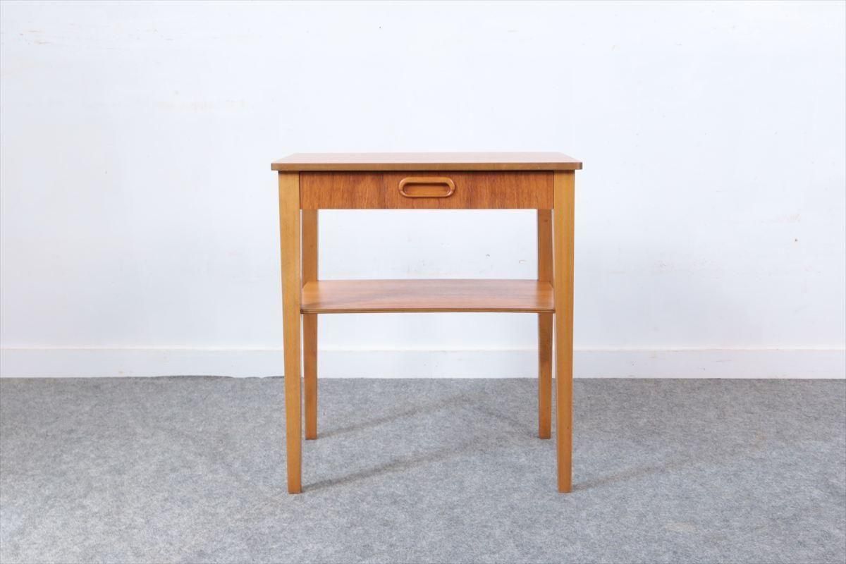 スウェーデンで買い付けたチークのサイドテーブルです。 チーク×ビーチを組み合わせたスウェーデンらしい軽やかなデザインです。 引き出しが1段とラック付きで、小物の収納に便利です。 ベッドサイドや玄関先、ちょっとしたスペースにアクセントとして置いてみるのも素敵です。 天板はチーク、脚はビーチです。また、背面もきれいな仕上げです。 細かいキズや凹みなど多少使用感はありますが、良いコンディションです。