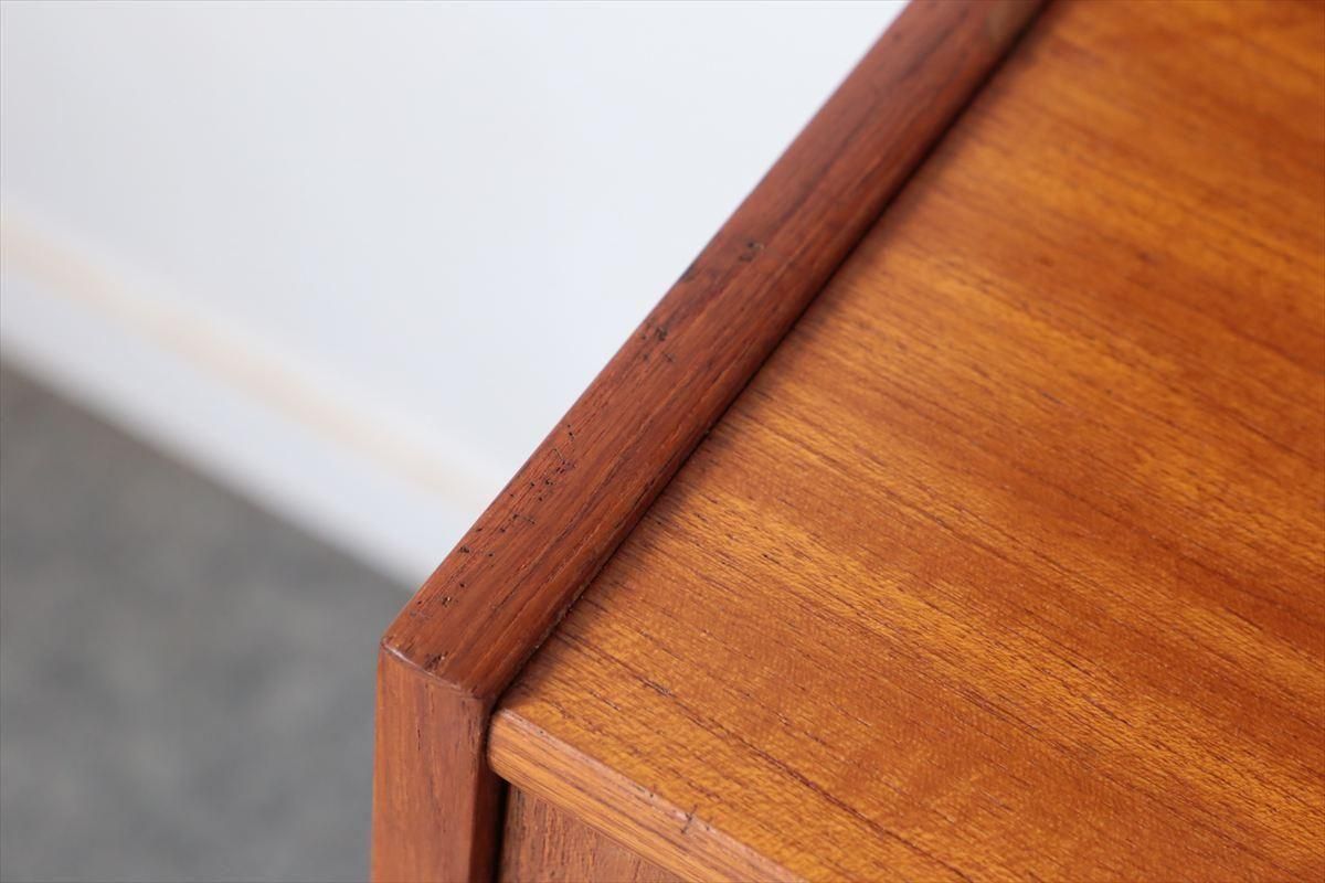 スウェーデンの家具メーカーBodaforsのチークのブックケースです。 スウェーデンの建築家、家具デザイナーのBertil Fridhagenによるデザインです。 こちらのシリーズはデザインの違うタイプを組み合わせて連結したり、上下を別で使用できるように販売されていた家具のようです。 こちらはオープンタイプの棚と引き出しの組合せで、ディスプレイを楽しみながら収納できます。 アーチ型の持ち手のデザインがアクセントとなっています。 上段の棚は3cm間隔で24段階の高さ調節が可能です。 同シリーズを並べて使用するのも素敵ですね。 画像のように上段角に欠けを木で補修した箇所や、持ち手の一部にひび割れが見られます。 こちらは強度に問題のないようにメンテナンスしております。 また、左側の縁部分に打痕跡や細かいキズが数か所あります。 その他の細かいキズや凹みなど多少使用感はありますが、がたつきなどはなく良いコンディションです。