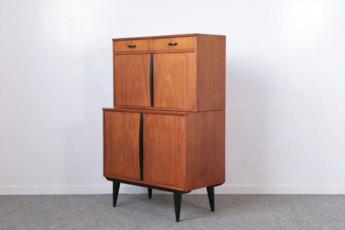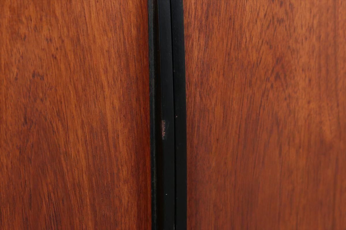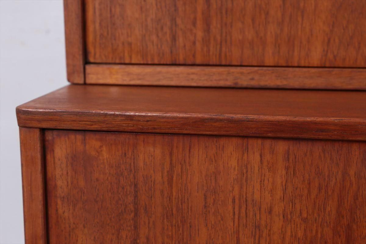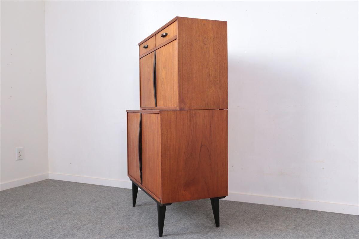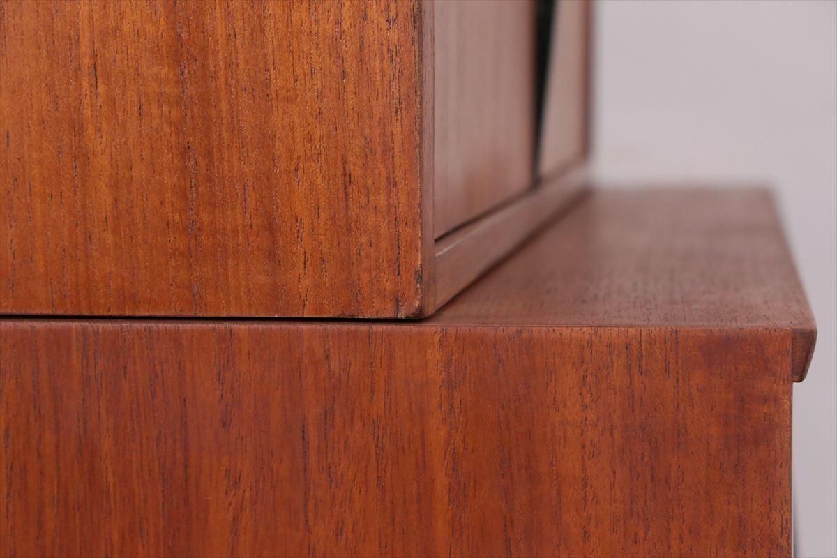 スウェーデンの家具メーカーBrantorps社のチークのブックケースです。 脚やフレームの一部が黒くペイントされたデザインがアクセントとなったコンパクトなデザインです。 当時こちらの「Nybro」シリーズはデザインの違うタイプを組み合わせたり、上下を別で使用できるように販売されていた家具のようです。 こちらは上と下も開き扉の組み合わせです。上段には引き出しも2つあるので、細々した物や隠したい物の収納に便利です。背も高くないので圧迫感が無く、上に物を飾ったりして楽しむことができます。 上段と下段の棚は11段階の高さ調節が可能です。 画像のように天板やフレームに小さなキズや、小さな凹みがあります。 上段と下段の間にわずかな隙間がありますが、これは経年で底板がわずかに膨らんでいるためで、建付けなどご使用に問題のないようにメンテナンスしております。 その他の細かいキズや凹みなど多少使用感はありますが、がたつきなどはなく良いコンディションです。