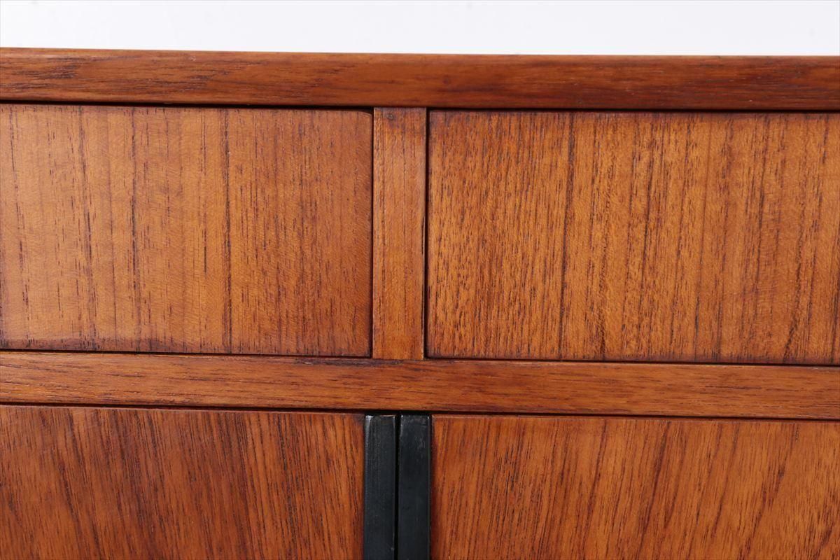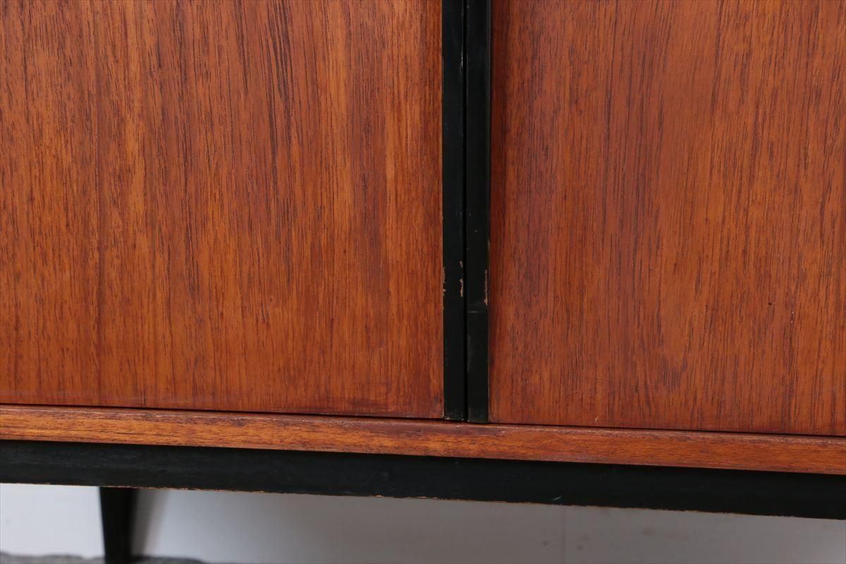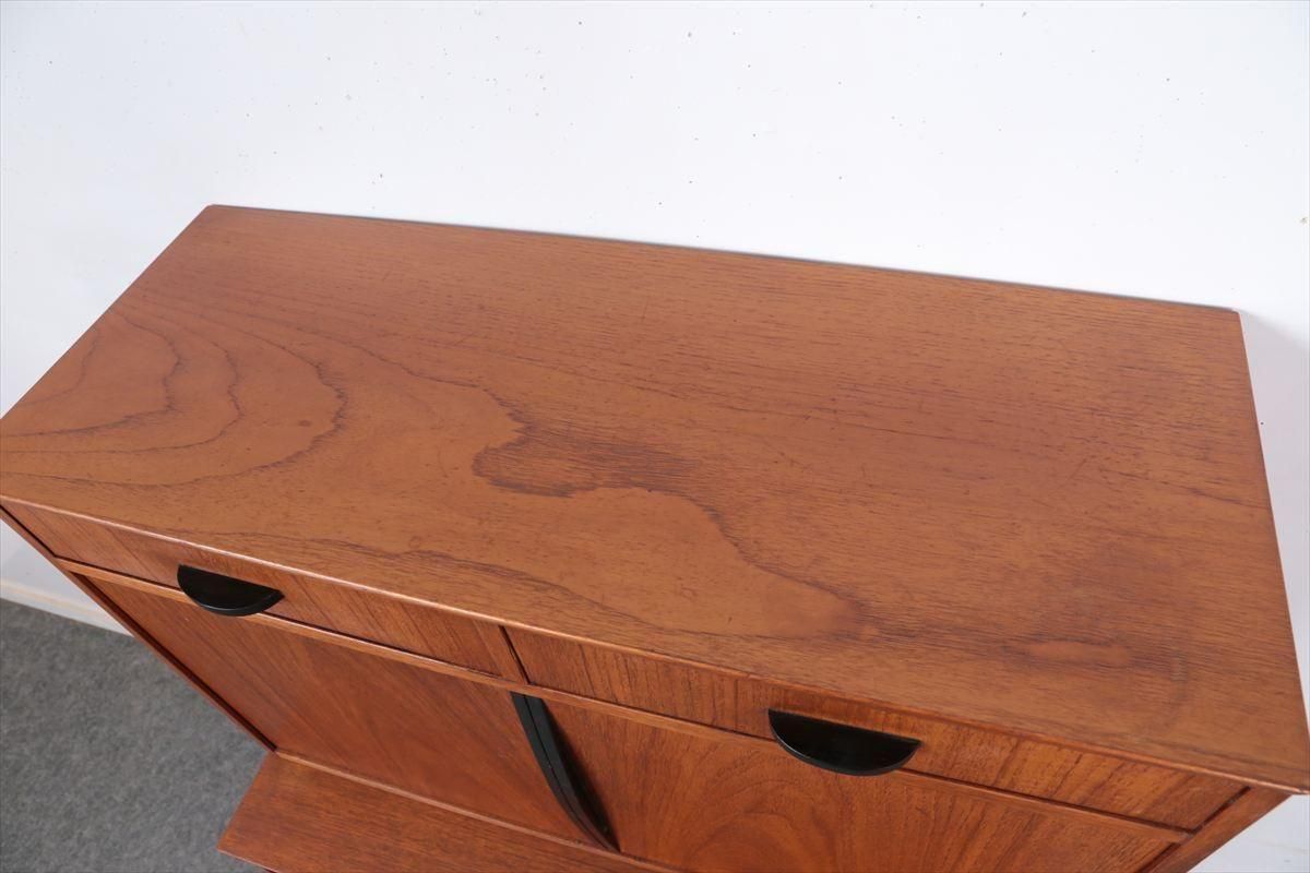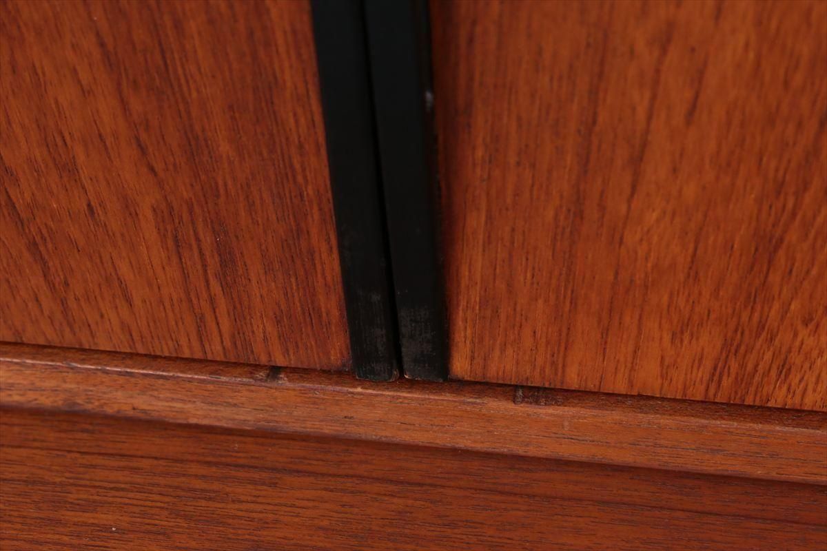 スウェーデンの家具メーカーBrantorps社のチークのブックケースです。 脚やフレームの一部が黒くペイントされたデザインがアクセントとなったコンパクトなデザインです。 当時こちらの「Nybro」シリーズはデザインの違うタイプを組み合わせたり、上下を別で使用できるように販売されていた家具のようです。 こちらは上と下も開き扉の組み合わせです。上段には引き出しも2つあるので、細々した物や隠したい物の収納に便利です。背も高くないので圧迫感が無く、上に物を飾ったりして楽しむことができます。 上段と下段の棚は11段階の高さ調節が可能です。 画像のように天板やフレームに小さなキズや、小さな凹みがあります。 上段と下段の間にわずかな隙間がありますが、これは経年で底板がわずかに膨らんでいるためで、建付けなどご使用に問題のないようにメンテナンスしております。 その他の細かいキズや凹みなど多少使用感はありますが、がたつきなどはなく良いコンディションです。