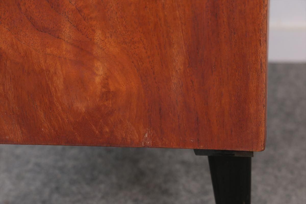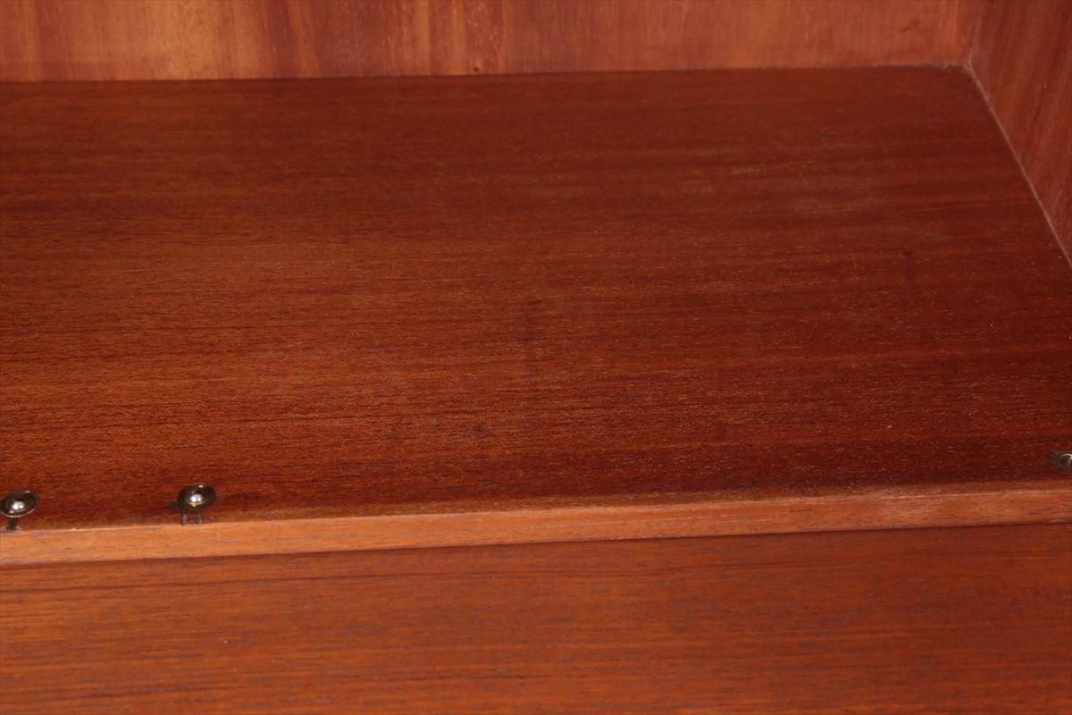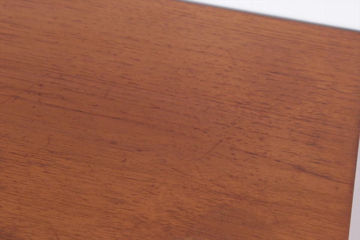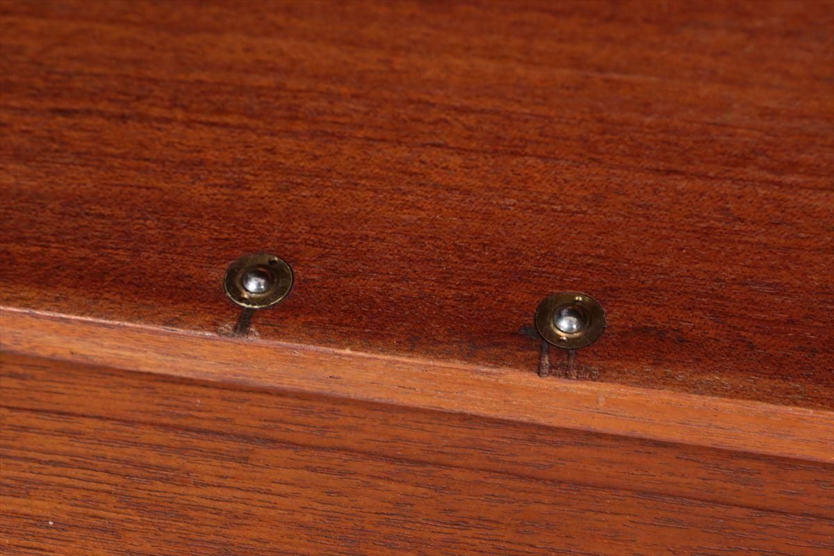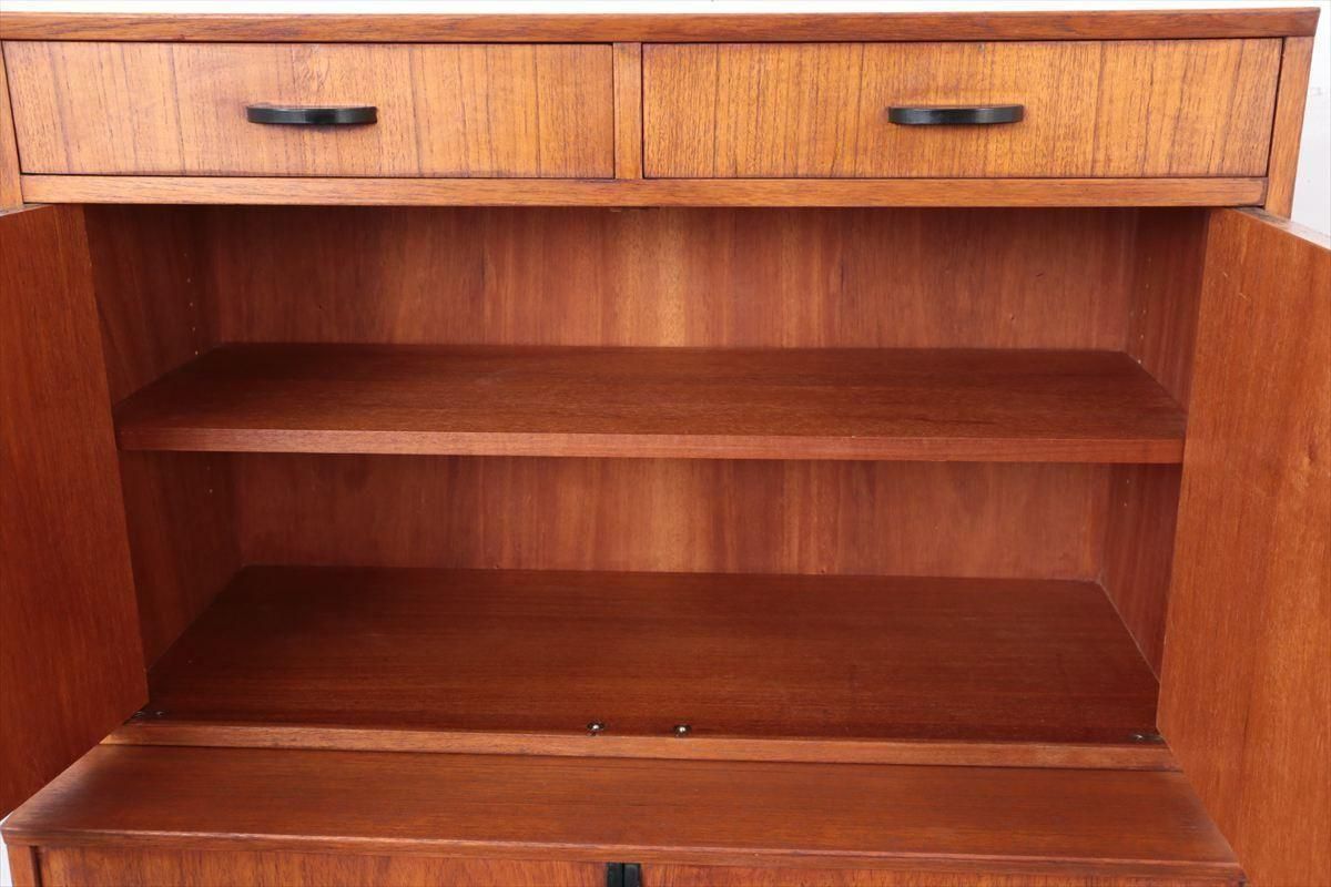 スウェーデンの家具メーカーBrantorps社のチークのブックケースです。 脚やフレームの一部が黒くペイントされたデザインがアクセントとなったコンパクトなデザインです。 当時こちらの「Nybro」シリーズはデザインの違うタイプを組み合わせたり、上下を別で使用できるように販売されていた家具のようです。 こちらは上と下も開き扉の組み合わせです。上段には引き出しも2つあるので、細々した物や隠したい物の収納に便利です。背も高くないので圧迫感が無く、上に物を飾ったりして楽しむことができます。 上段と下段の棚は11段階の高さ調節が可能です。 画像のように天板やフレームに小さなキズや、小さな凹みがあります。 上段と下段の間にわずかな隙間がありますが、これは経年で底板がわずかに膨らんでいるためで、建付けなどご使用に問題のないようにメンテナンスしております。 その他の細かいキズや凹みなど多少使用感はありますが、がたつきなどはなく良いコンディションです。