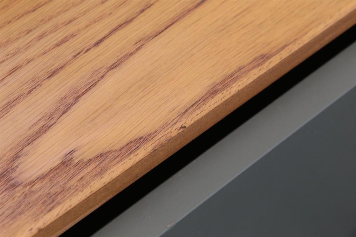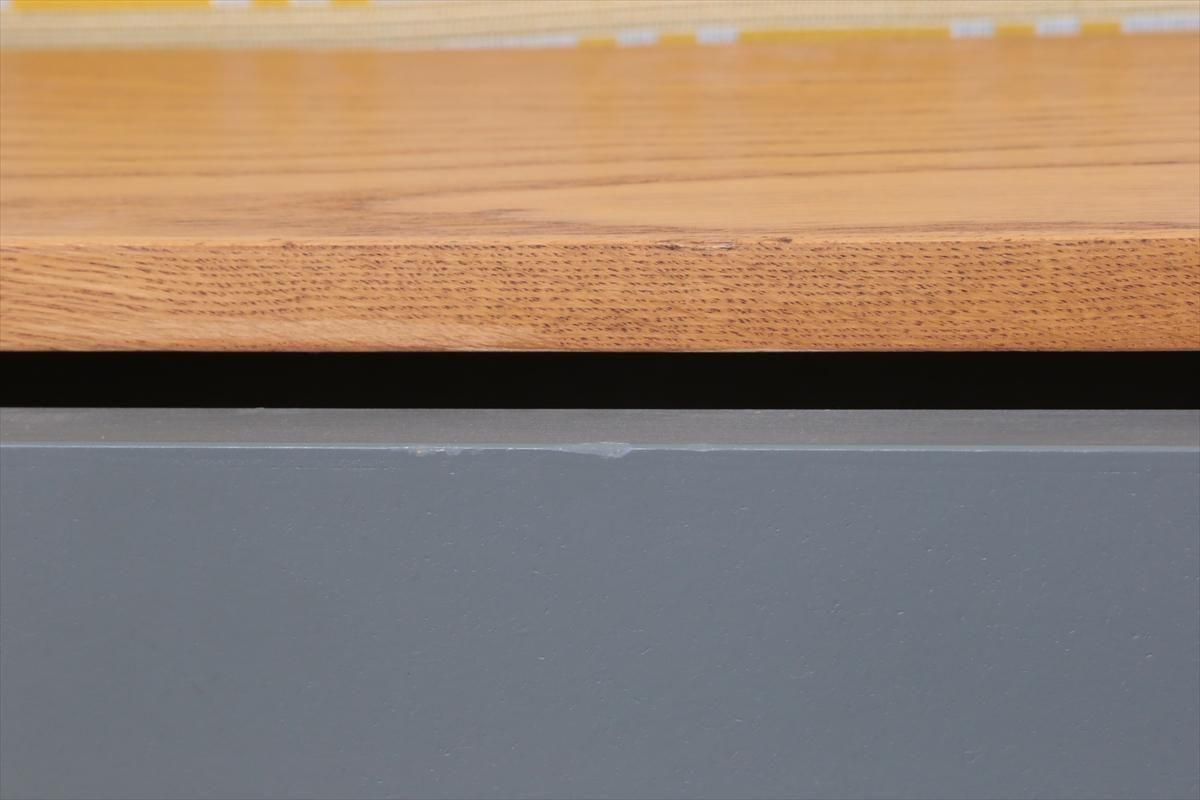 画像のように横板に突板の剥がれを補修した箇所や、細かい凹みキズがあります。また背面に塗料の付着や剥がれ、細かい欠けやキズが数か所にあります。