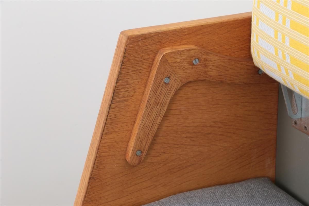 背もたれは、フィンランドのテキスタイルブランドJohanna Gullichsen(ヨハンナ・グリクセン)の「Tithonus/ティトナス(YE)」(綿100%)で張替ました。グラフィックパターンを織りで表現したテキスタイルは、奥行のあるしっかりとした素材で、色合いも美しく、季節を通してお楽しみいただけます。 座面はおなじみのRIBACO(リバコ)のNCシリーズ/126(素材:ウール30%・アクリル70%)を使用しています。 座面はスプリング内包タイプで弾力のある座り心地です。 フレームにGETAMAの刻印は入っていませんが、シートはGETAMAのロゴが入ったものです。こちらは新しいキルティングに交換する予定です。当時は公共の施設でも使用されており、数多く生産されていたシリーズです。そのため刻印が無いことが多く、後期はGETAMAのシールが貼られていました。