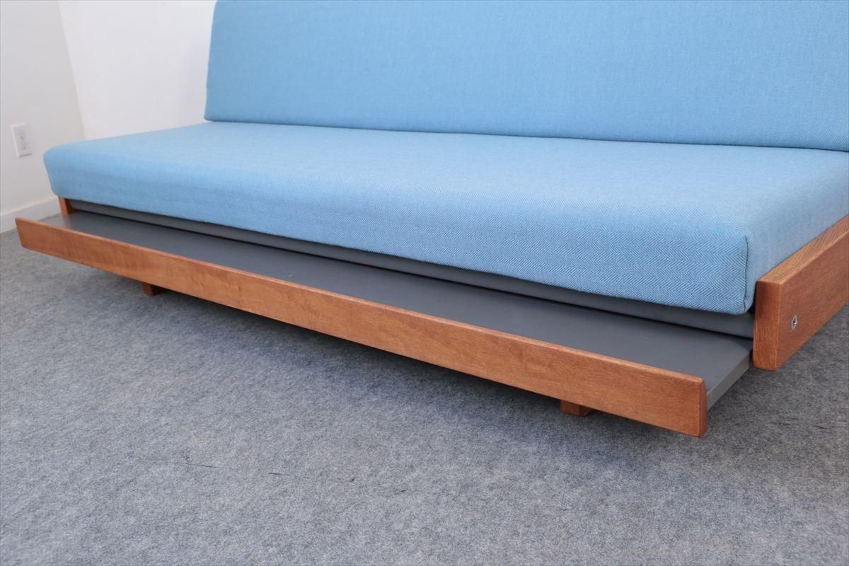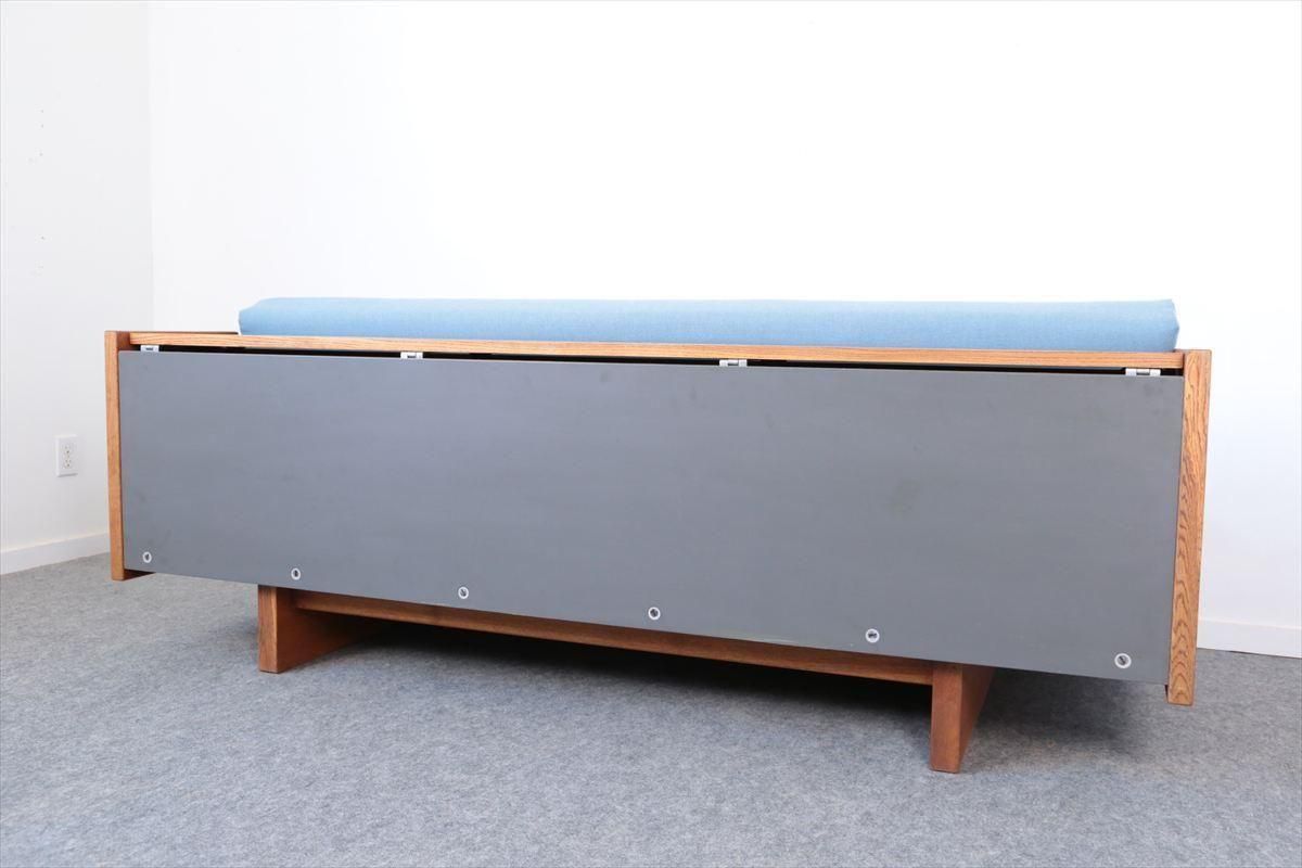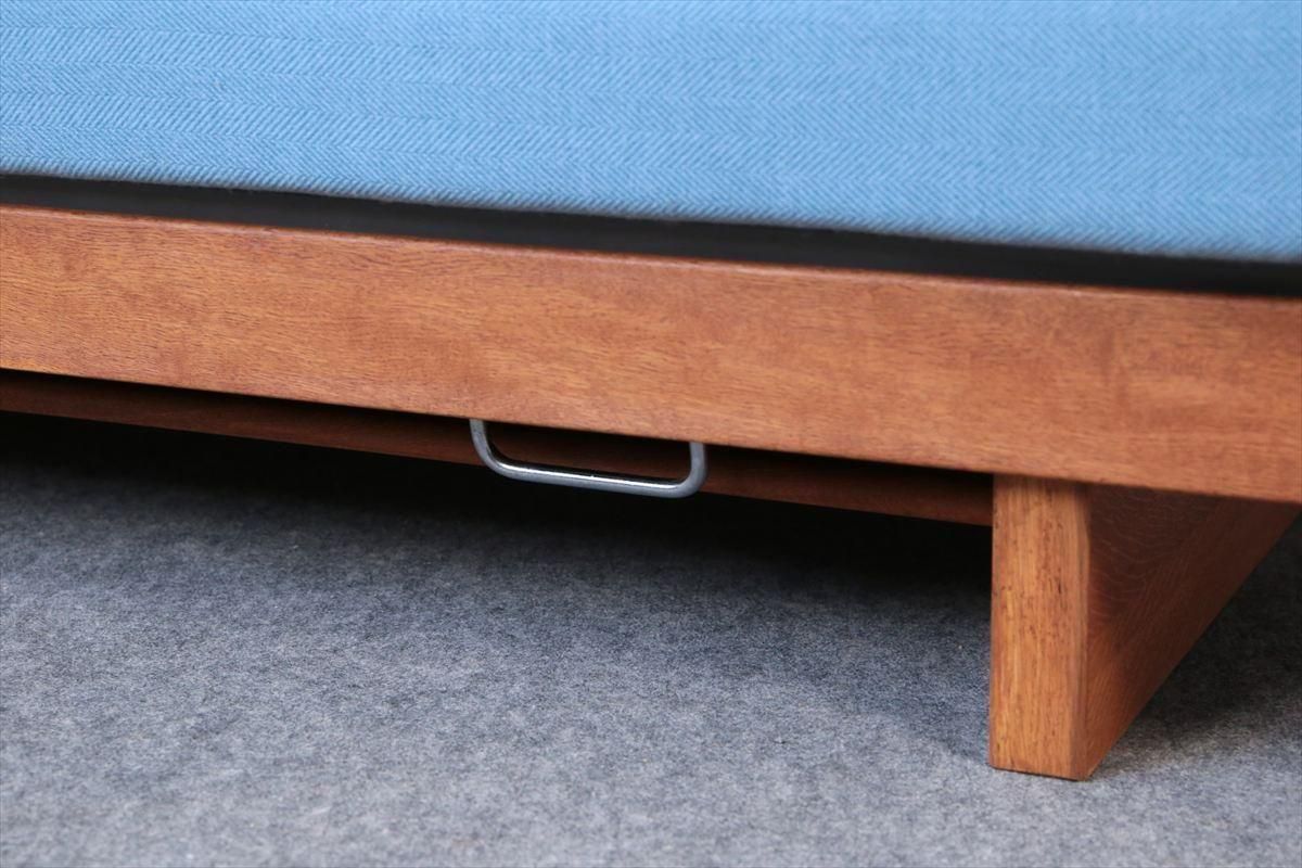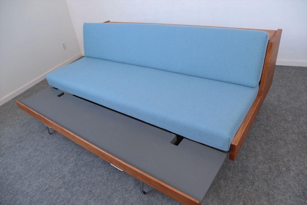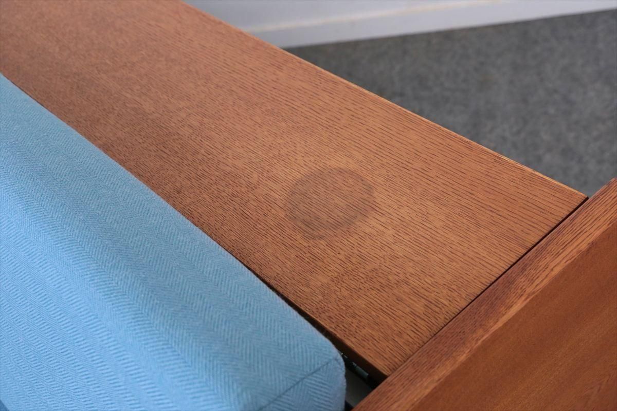 Hans J.Wegner(ハンス・J・ウェグナー) のデイベッド「GE77」です。通常のデイベッドはソファからシングルサイズのベッドに変化しますが、こちらはダブルベッドサイズに変化します。 座面の下から奥行き35cm程の追加のフレームが出る仕組みで、そこに背中のクッションをはめ込むことで奥行きが35cmプラスされてマットレスがダブルベッドサイズ(190cm×140cm)に変化します。追加フレームは手前に引くと下がりながら出てきますが、スチール製の脚を立てると座面と同じ高さまで上がります。ファブリックはRIBACO(リバコ)のTRシリーズ/(素材:ウール30%、アクリル70%)で張替ています。 座面はスプリング内包タイプで弾力のある座り心地です。 画像のように天板に輪ジミが残っています。その他にも木部のキズや塗装の剥がれ、スチール製の脚のメッキの剥がれなど多少使用感はありますが全体的には良いコンディションです。