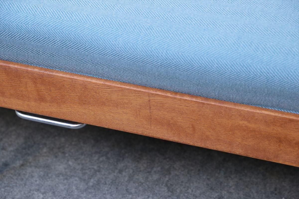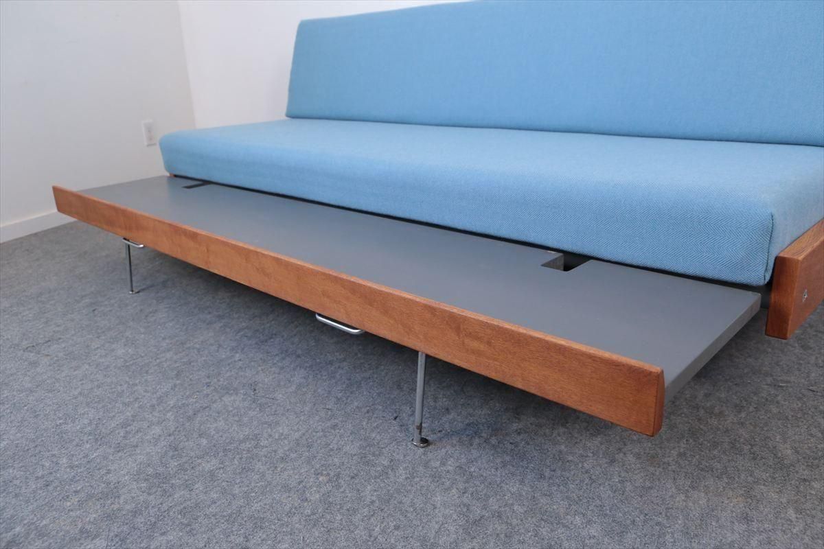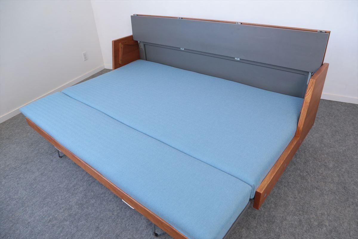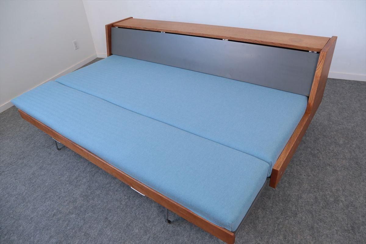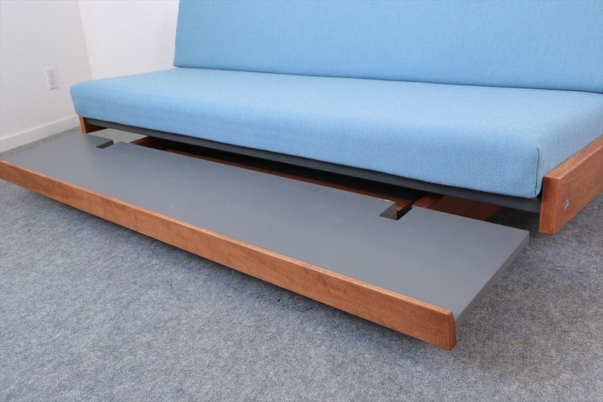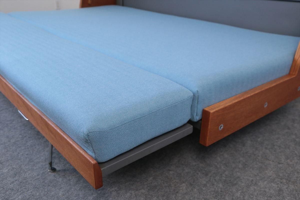 Hans J.Wegner(ハンス・J・ウェグナー) のデイベッド「GE77」です。通常のデイベッドはソファからシングルサイズのベッドに変化しますが、こちらはダブルベッドサイズに変化します。 座面の下から奥行き35cm程の追加のフレームが出る仕組みで、そこに背中のクッションをはめ込むことで奥行きが35cmプラスされてマットレスがダブルベッドサイズ(190cm×140cm)に変化します。追加フレームは手前に引くと下がりながら出てきますが、スチール製の脚を立てると座面と同じ高さまで上がります。ファブリックはRIBACO(リバコ)のTRシリーズ/(素材:ウール30%、アクリル70%)で張替ています。 座面はスプリング内包タイプで弾力のある座り心地です。 画像のように天板に輪ジミが残っています。その他にも木部のキズや塗装の剥がれ、スチール製の脚のメッキの剥がれなど多少使用感はありますが全体的には良いコンディションです。