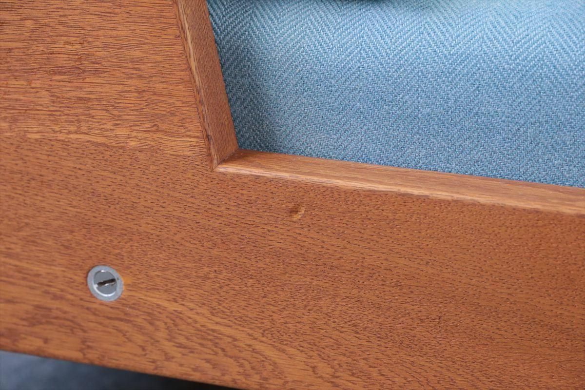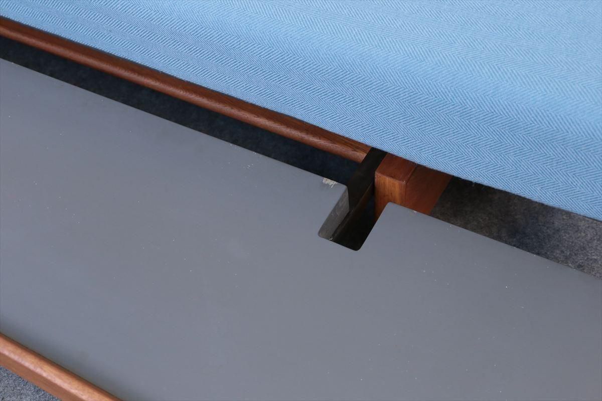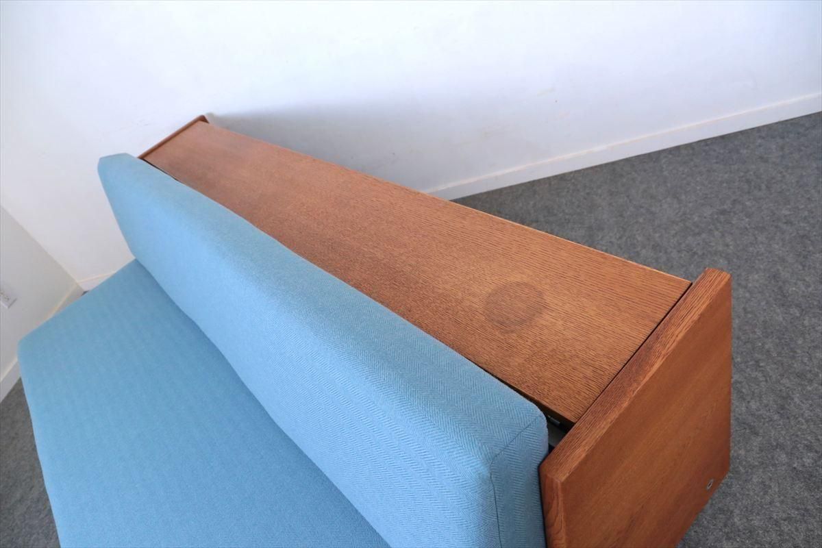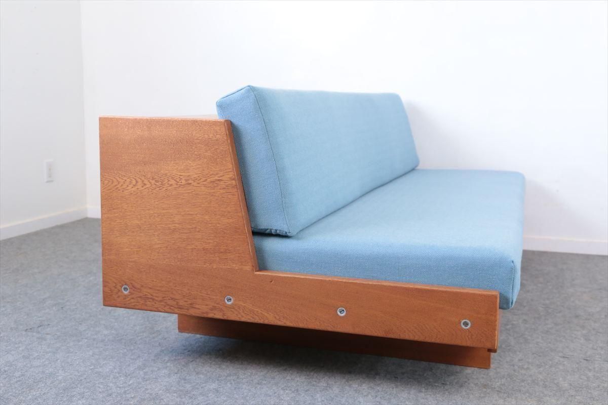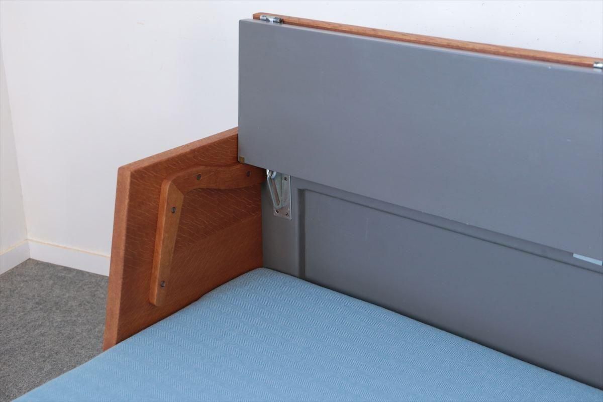 Hans J.Wegner(ハンス・J・ウェグナー) のデイベッド「GE77」です。通常のデイベッドはソファからシングルサイズのベッドに変化しますが、こちらはダブルベッドサイズに変化します。 座面の下から奥行き35cm程の追加のフレームが出る仕組みで、そこに背中のクッションをはめ込むことで奥行きが35cmプラスされてマットレスがダブルベッドサイズ(190cm×140cm)に変化します。追加フレームは手前に引くと下がりながら出てきますが、スチール製の脚を立てると座面と同じ高さまで上がります。ファブリックはRIBACO(リバコ)のTRシリーズ/(素材:ウール30%、アクリル70%)で張替ています。 座面はスプリング内包タイプで弾力のある座り心地です。 画像のように天板に輪ジミが残っています。その他にも木部のキズや塗装の剥がれ、スチール製の脚のメッキの剥がれなど多少使用感はありますが全体的には良いコンディションです。