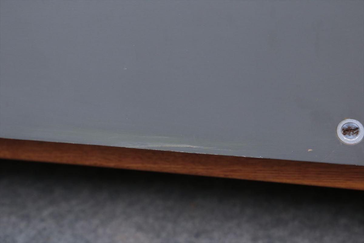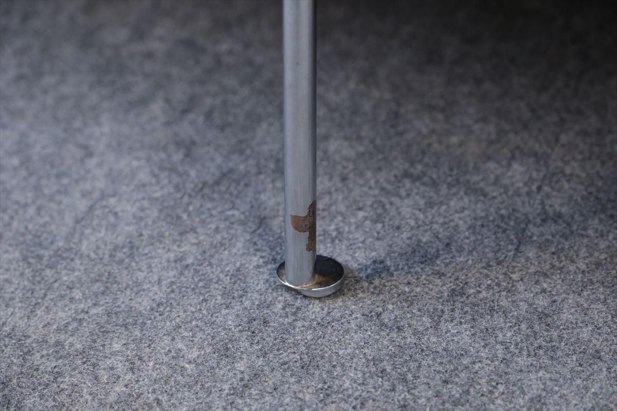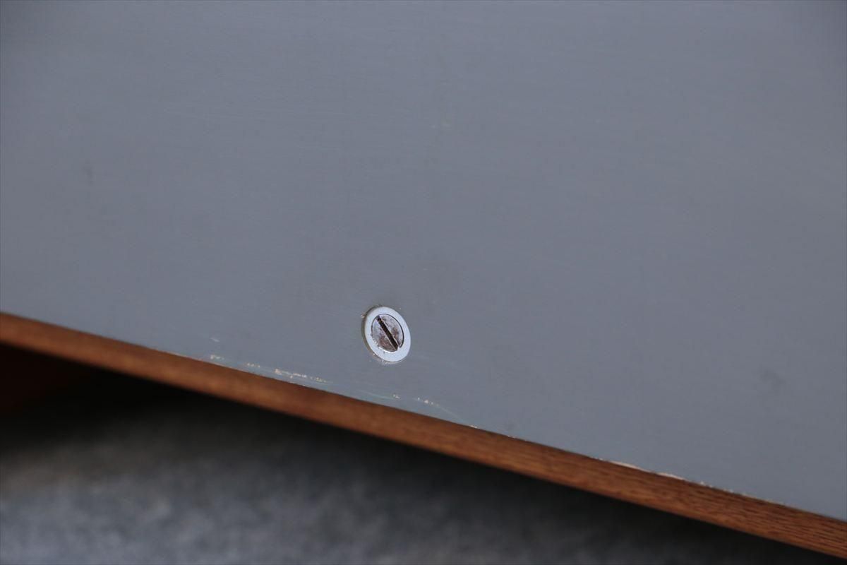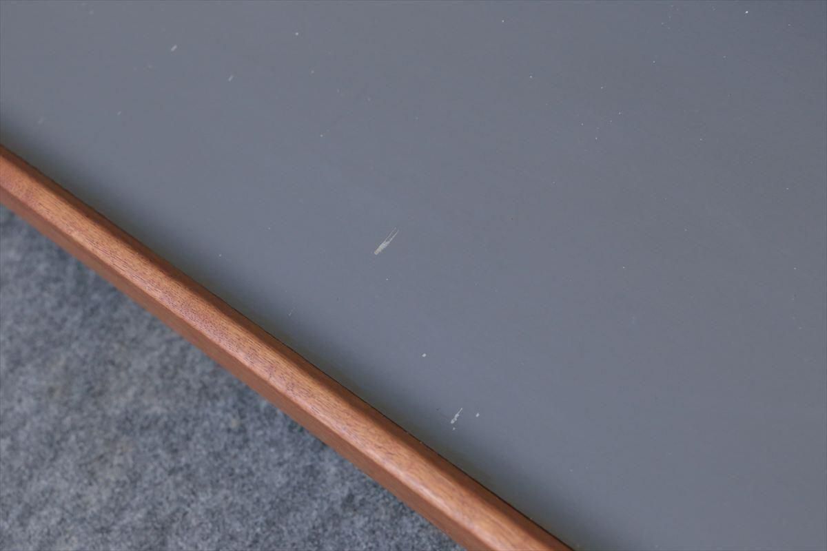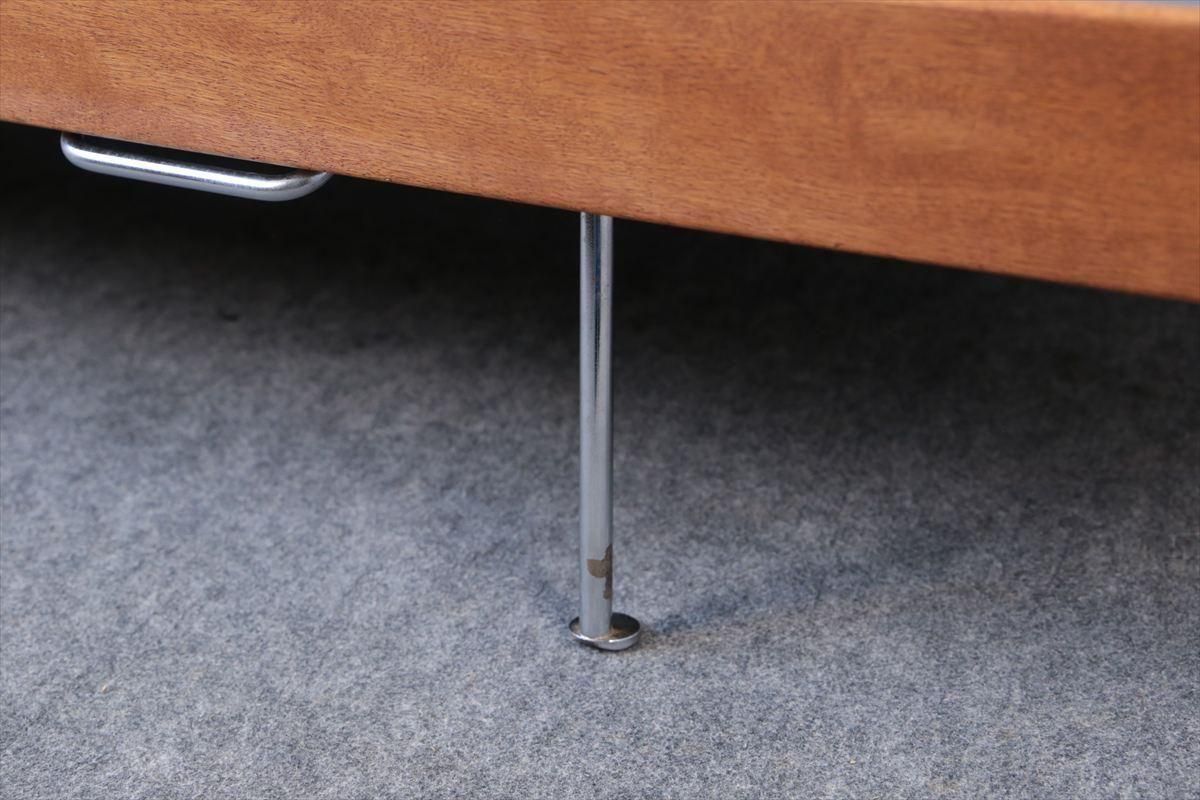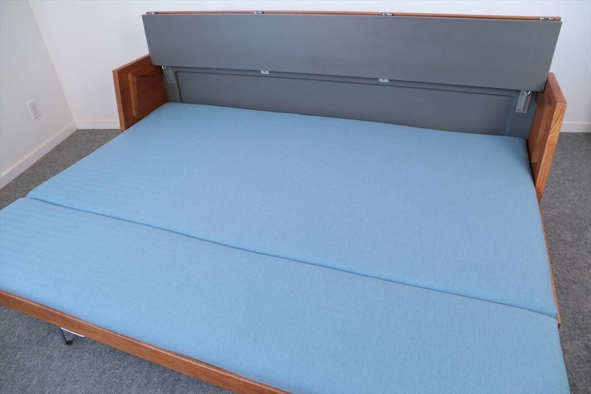 Hans J.Wegner(ハンス・J・ウェグナー) のデイベッド「GE77」です。通常のデイベッドはソファからシングルサイズのベッドに変化しますが、こちらはダブルベッドサイズに変化します。 座面の下から奥行き35cm程の追加のフレームが出る仕組みで、そこに背中のクッションをはめ込むことで奥行きが35cmプラスされてマットレスがダブルベッドサイズ(190cm×140cm)に変化します。追加フレームは手前に引くと下がりながら出てきますが、スチール製の脚を立てると座面と同じ高さまで上がります。ファブリックはRIBACO(リバコ)のTRシリーズ/(素材:ウール30%、アクリル70%)で張替ています。 座面はスプリング内包タイプで弾力のある座り心地です。 画像のように天板に輪ジミが残っています。その他にも木部のキズや塗装の剥がれ、スチール製の脚のメッキの剥がれなど多少使用感はありますが全体的には良いコンディションです。