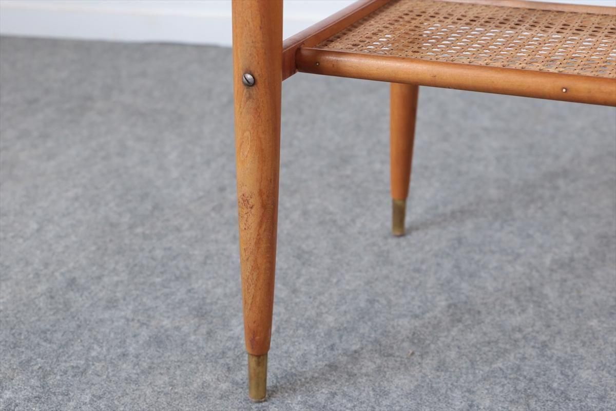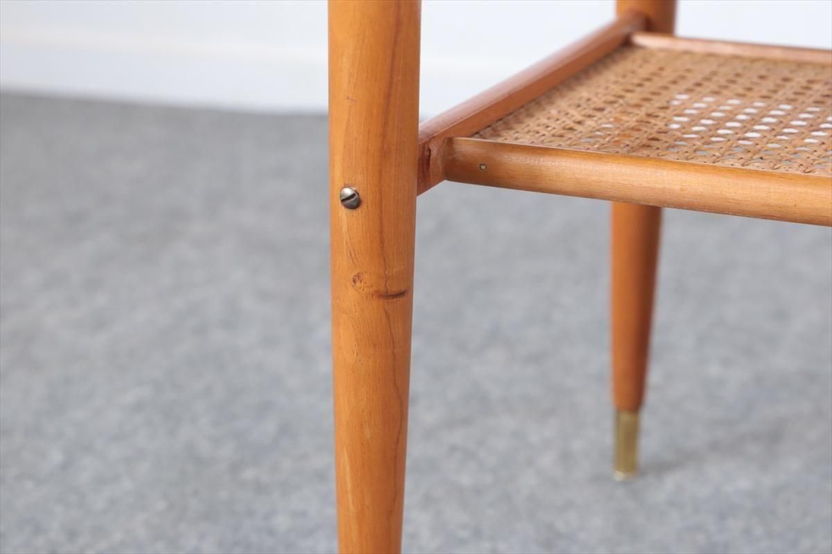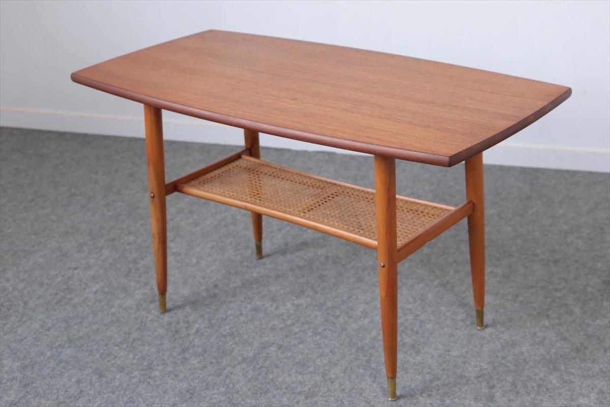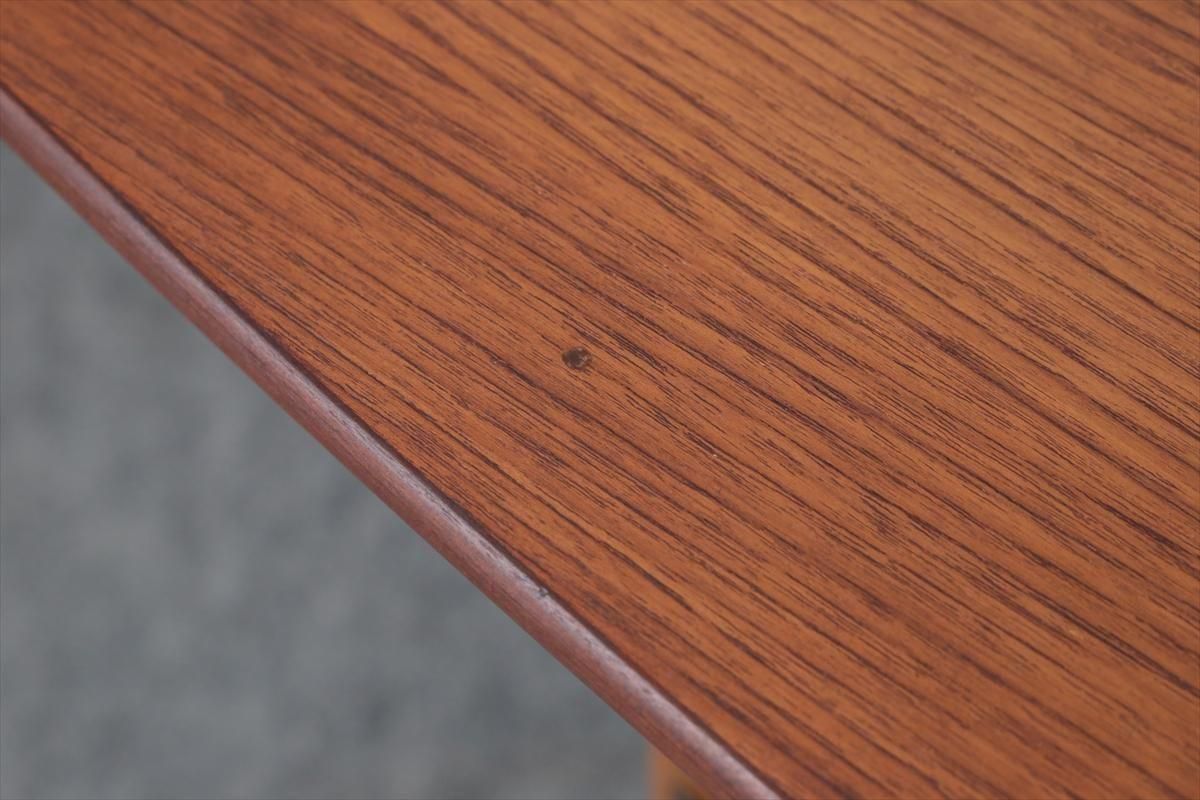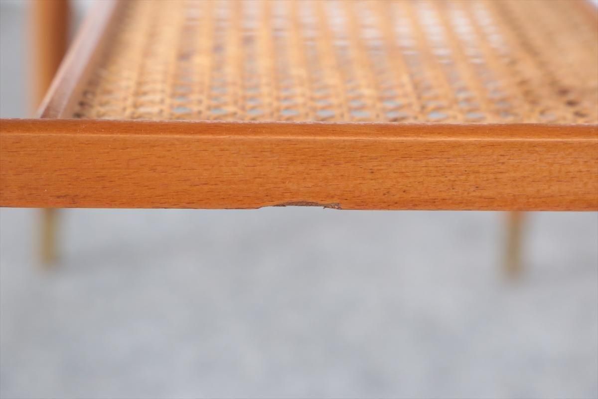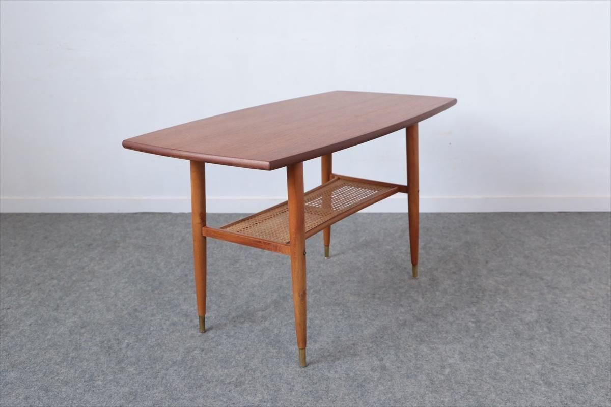 スウェーデンのチーク×オークのコーヒーテーブルです。 チーク×オークのコントラストや脚先のデザインがアクセントとなったデザインです。 天板下は籐のラック付きで、雑誌や本などを収納出来ます。 幅100cmのコンパクトなサイズで2シーターソファにちょうど良いサイズです。 天板に画像のようなシミや凹み、ラック部分に欠けがあります。 その他の細かいキズや凹み、脚の色むらなど多少使用感はありますが、良いコンディションです。