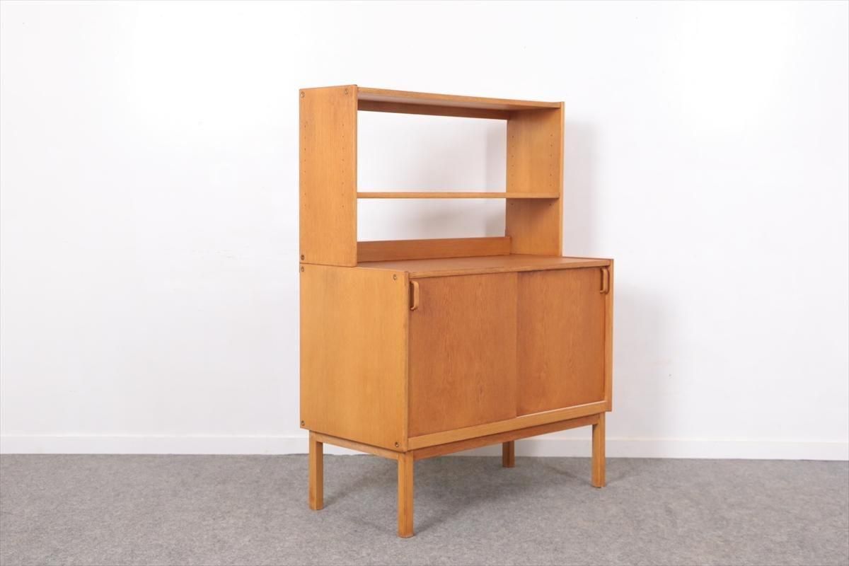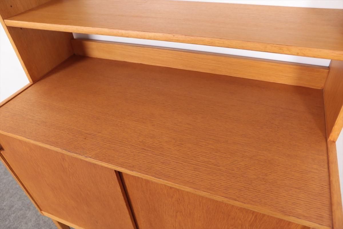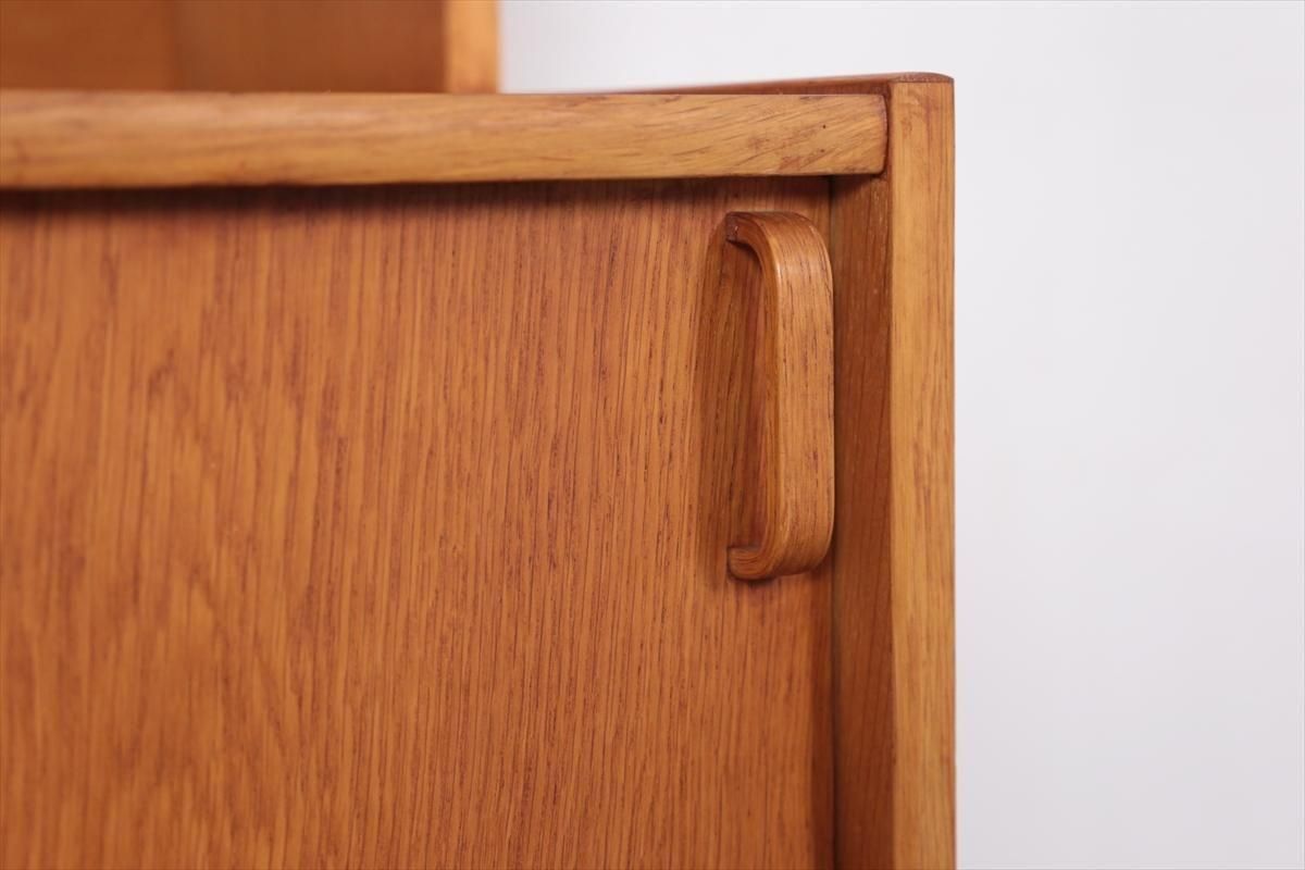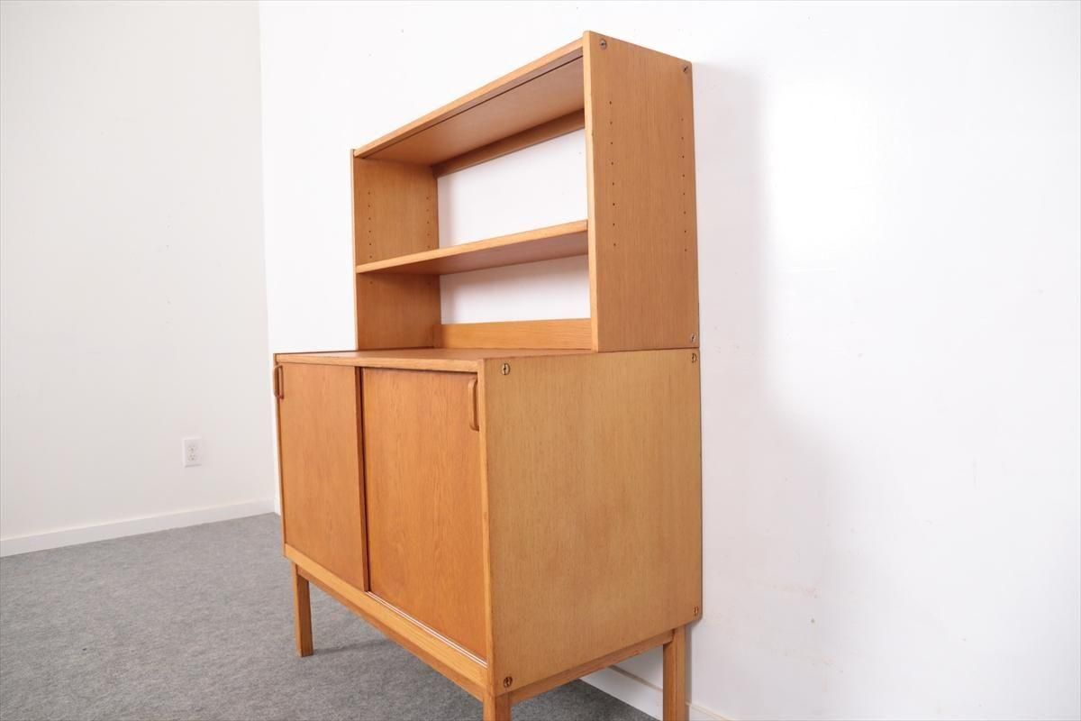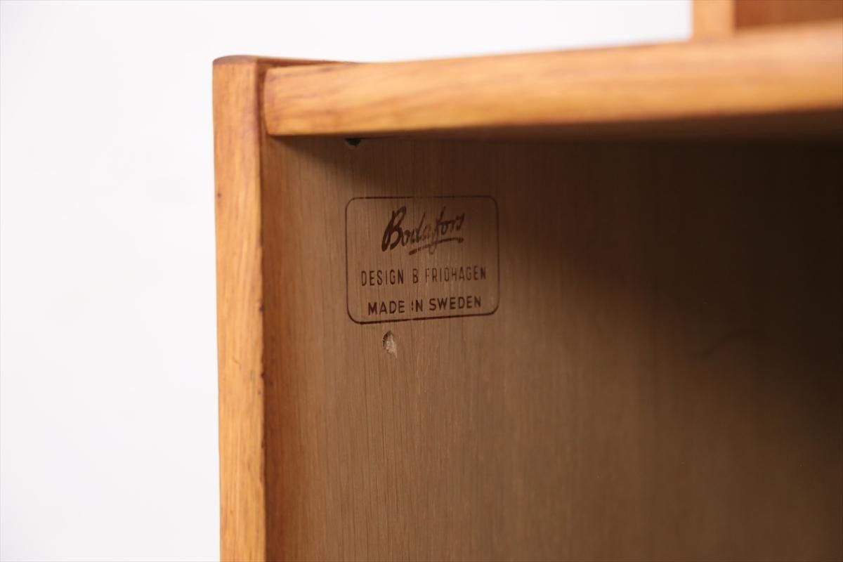スウェーデンの家具メーカーBodaforsのチークのブックケースです。 スウェーデンの建築家、家具デザイナーのBertil Fridhagenによるデザインです。 当時、こちらのシリーズはデザインの違うタイプを組み合わせて連結したり、上下を別々で使用できるように販売されていた家具のようです。 こちらはオープンタイプの棚と、引き戸の収納の組み合わせで、背も高くないので圧迫感が無く、 上に物を飾ったりした楽しむことができます。 上段の棚は8段階、下段の棚板は11段階の高さ調節が可能です。 画像のような細かいキズや凹み、色むらやわずかなシミなどがあります。 多少使用感はありますが、がたつきなどはなく良いコンディションです。