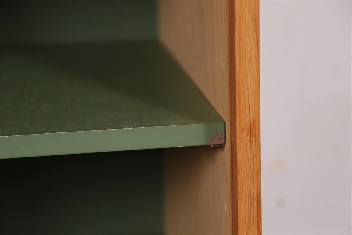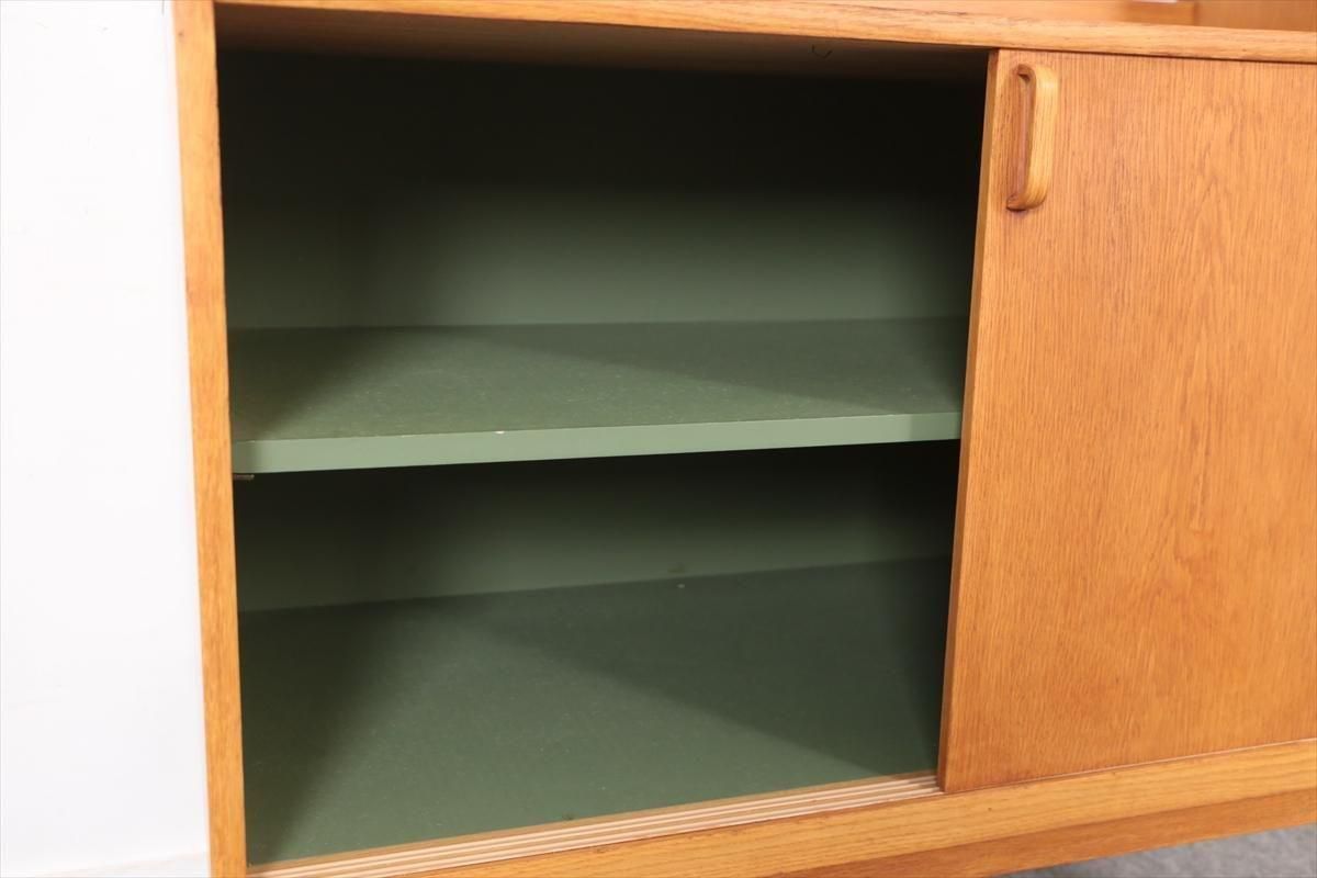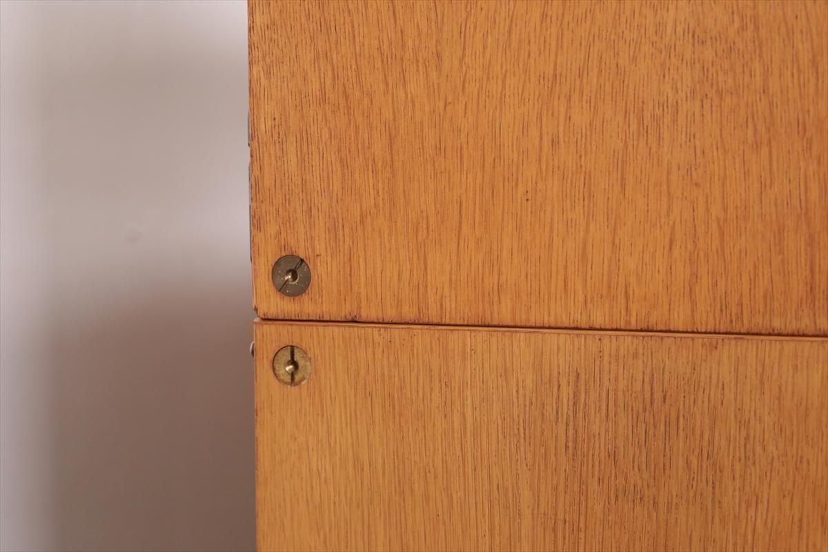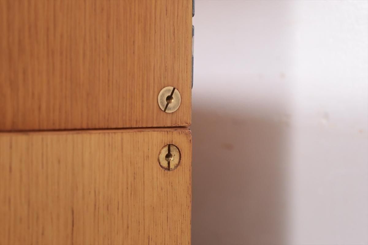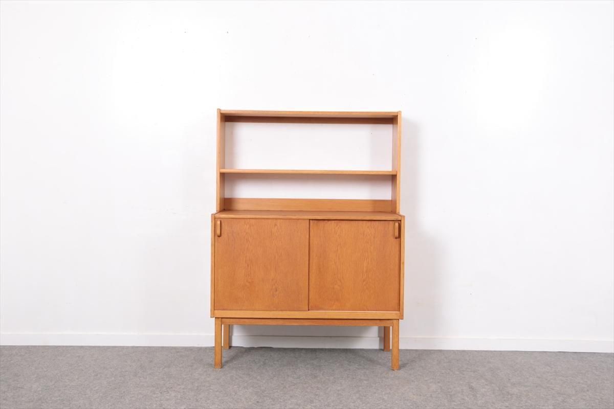 スウェーデンの家具メーカーBodaforsのチークのブックケースです。 スウェーデンの建築家、家具デザイナーのBertil Fridhagenによるデザインです。 当時、こちらのシリーズはデザインの違うタイプを組み合わせて連結したり、上下を別々で使用できるように販売されていた家具のようです。 こちらはオープンタイプの棚と、引き戸の収納の組み合わせで、背も高くないので圧迫感が無く、 上に物を飾ったりした楽しむことができます。 上段の棚は8段階、下段の棚板は11段階の高さ調節が可能です。 画像のような細かいキズや凹み、色むらやわずかなシミなどがあります。 多少使用感はありますが、がたつきなどはなく良いコンディションです。
