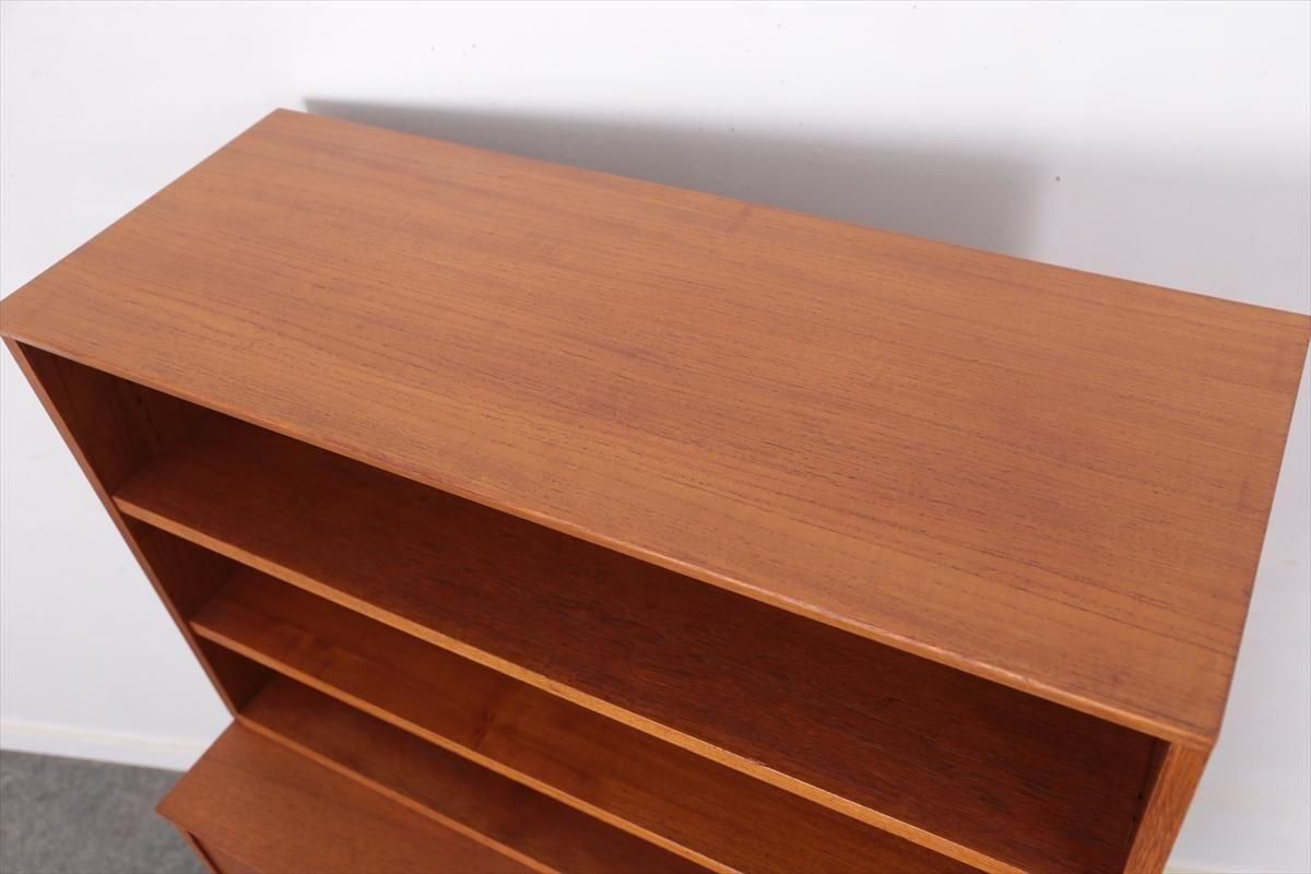 スウェーデンの家具メーカーBrantorps社のチークのブックケースです。 脚やフレームの一部が黒くペイントされたデザインがアクセントとなったコンパクトなデザインです。 当時こちらの「Nybro」シリーズはデザインの違うタイプを組み合わせたり、上下を別で使用できるように販売されていた家具のようです。 こちらはシンプルな棚と開き扉のキャビネットの組み合わせです。 背も高くないので圧迫感が無く、上に物を飾ったりして楽しむことができます。 上段の棚板は15段階、下段の棚板は11段階の高さ調節が可能です。 上段の角部に欠けを補修した箇所や棚の色焼け、下段の天板にしみがあります。 その他の細かいキズや凹み、塗装のはがれなど多少使用感はありますが、 全体的には良いコンディションです。