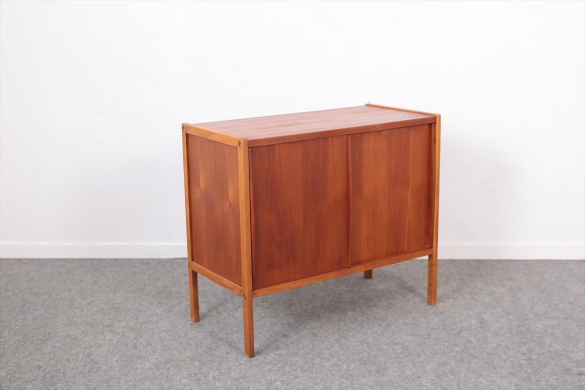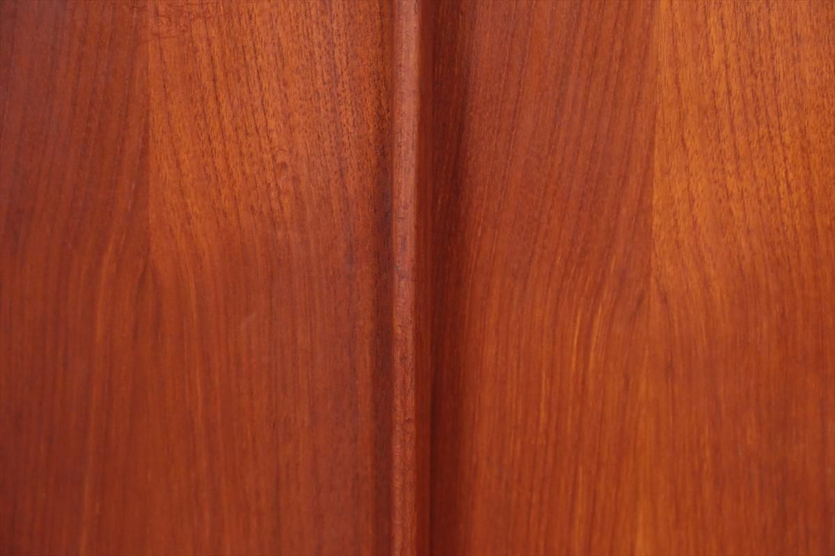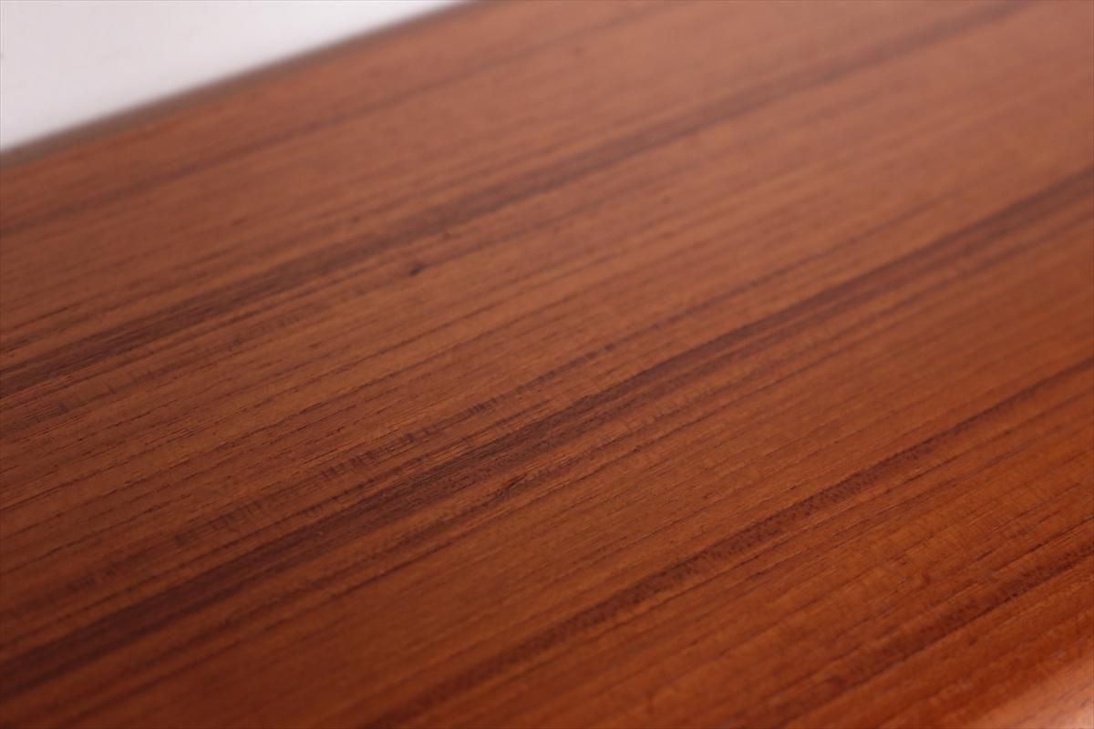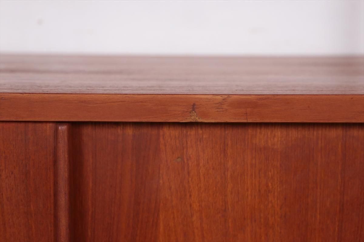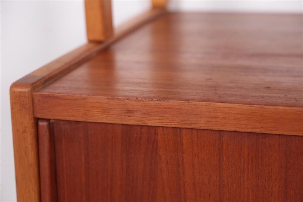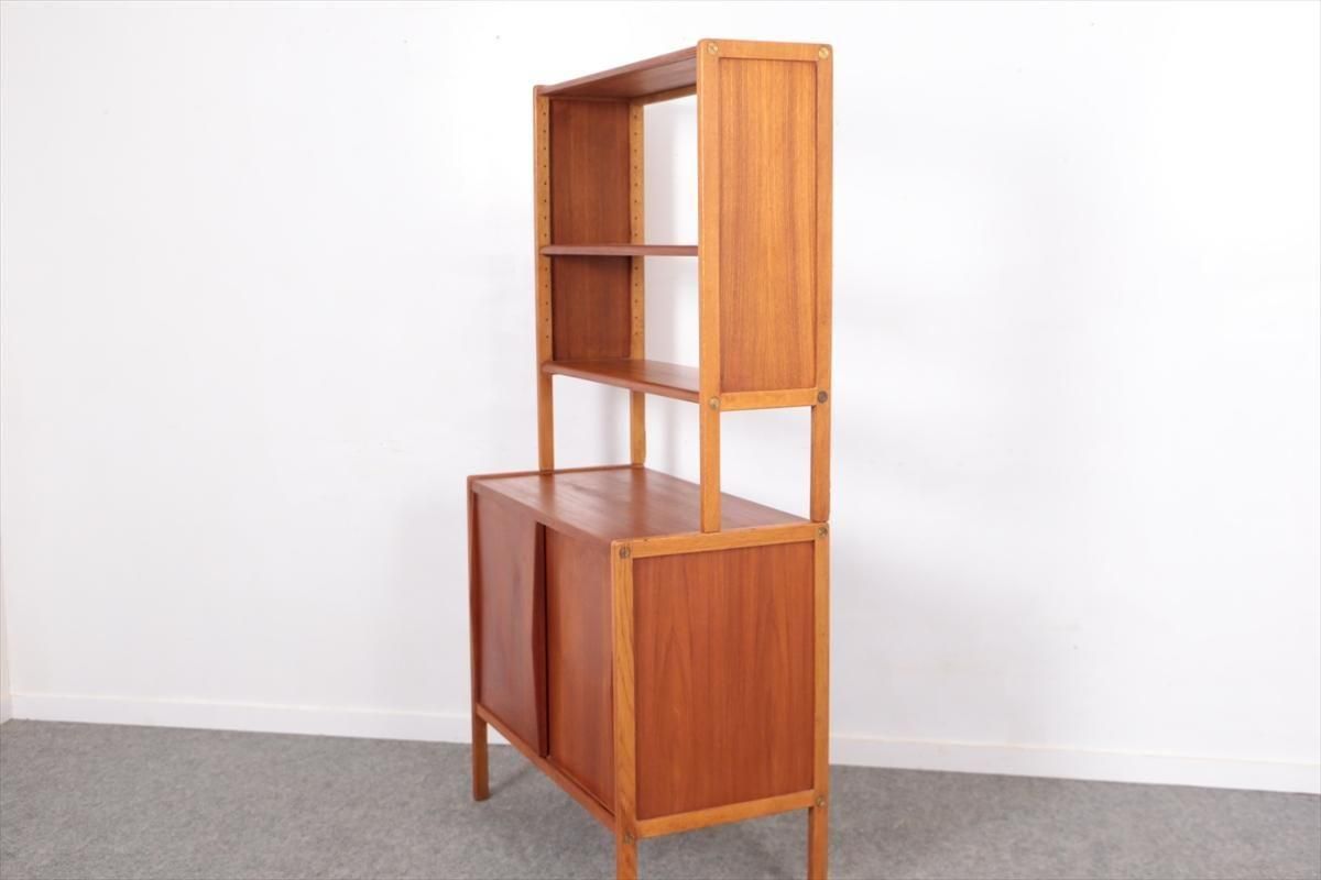スウェーデンのBodafors社製のチークのブックケースです。 スウェーデンの建築家、家具デザイナーのBertil Fridhagenが1954年にデザインした「LIBRETT」シリーズです。すっきりとした細い四角の支柱がアクセントとなったコンパクトで軽やかなデザインです。 当時こちらのシリーズはデザインの違うタイプを組み合わせたり、上下を別で使用できるように販売されていた家具のようです。 こちらは上段の一部に横板があるタイプで、味わいのあるチークの雰囲気を楽しめます。 上段の棚板は14段階の高さ調節が可能です。(一番下は固定) 下段の棚板の高さは固定ですが、取り外しは可能です。 画像のような細かいキズや凹み、わずかな欠けの補修など 多少使用感はありますが、全体的には良いコンディションです。