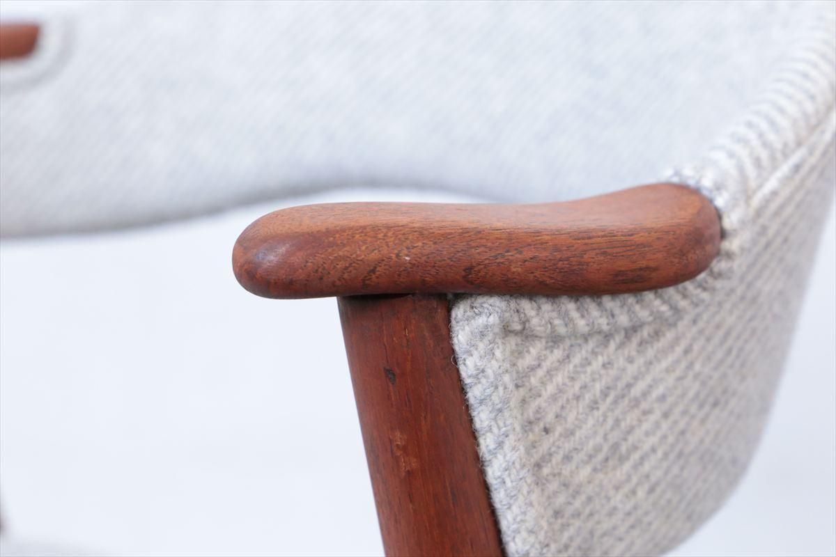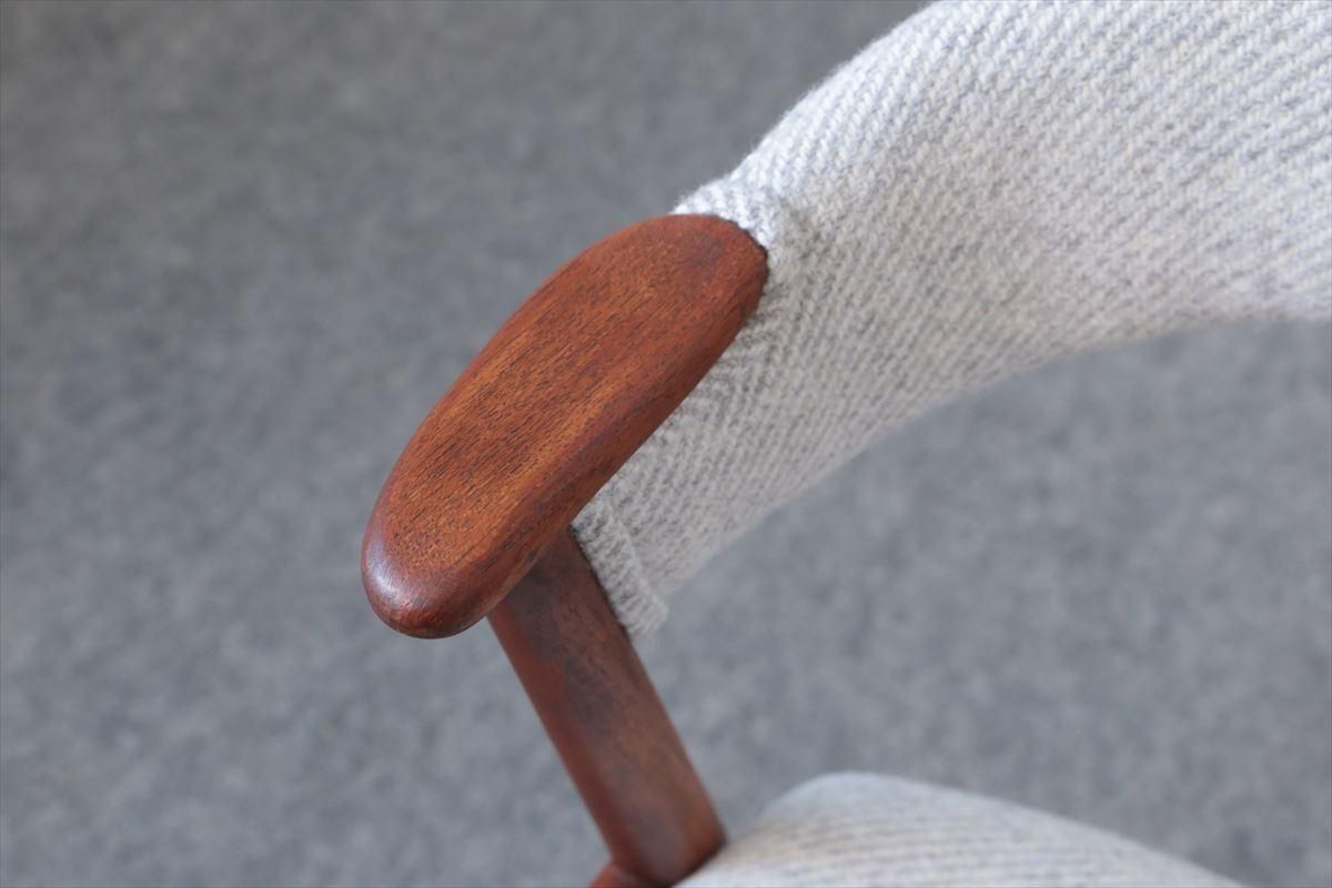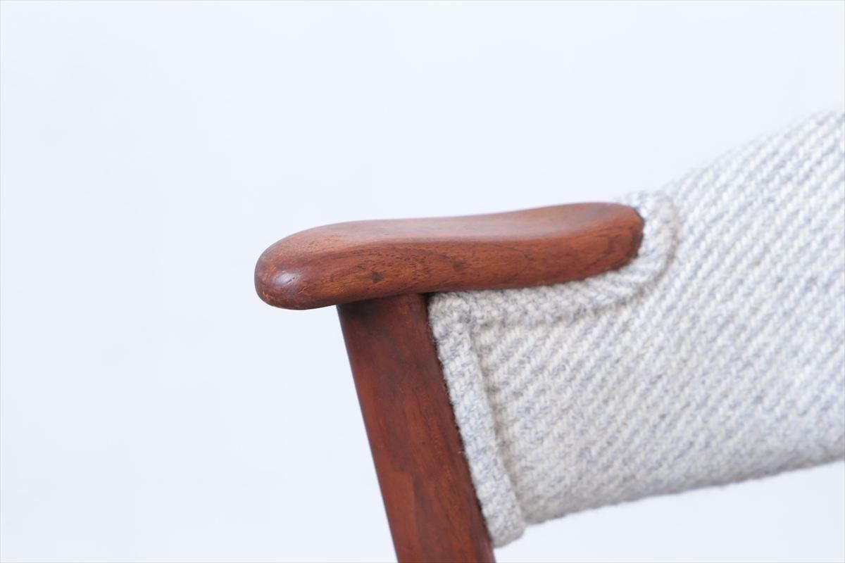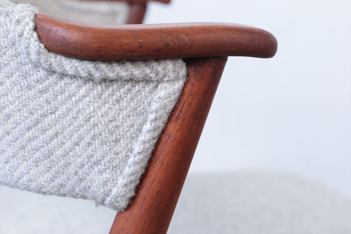 チークのネイルチェアーです。 丸い小さなアームが爪の形に似ていることからネイルチェアーと呼ばれています。 こちらは背もたれも布張りのタイプです 短いアームはダイニングテーブルに合わせても邪魔にならず、楽な姿勢でゆったりとくつろげます。 デザイン性と機能性を兼ね揃えた、細部まで上質で丁寧な造りのチェアーです。 デンマークのファブリックブランドDANISH ART WEAVING(デニッシュアートウィーヴィング)のPERUシリーズ/3( 素材:ウール100%)で張替ました。斜めストライプのふっくらとした質感です。 木部の細かいキズや凹みなど多少使用感はありますが、良いコンディションです。