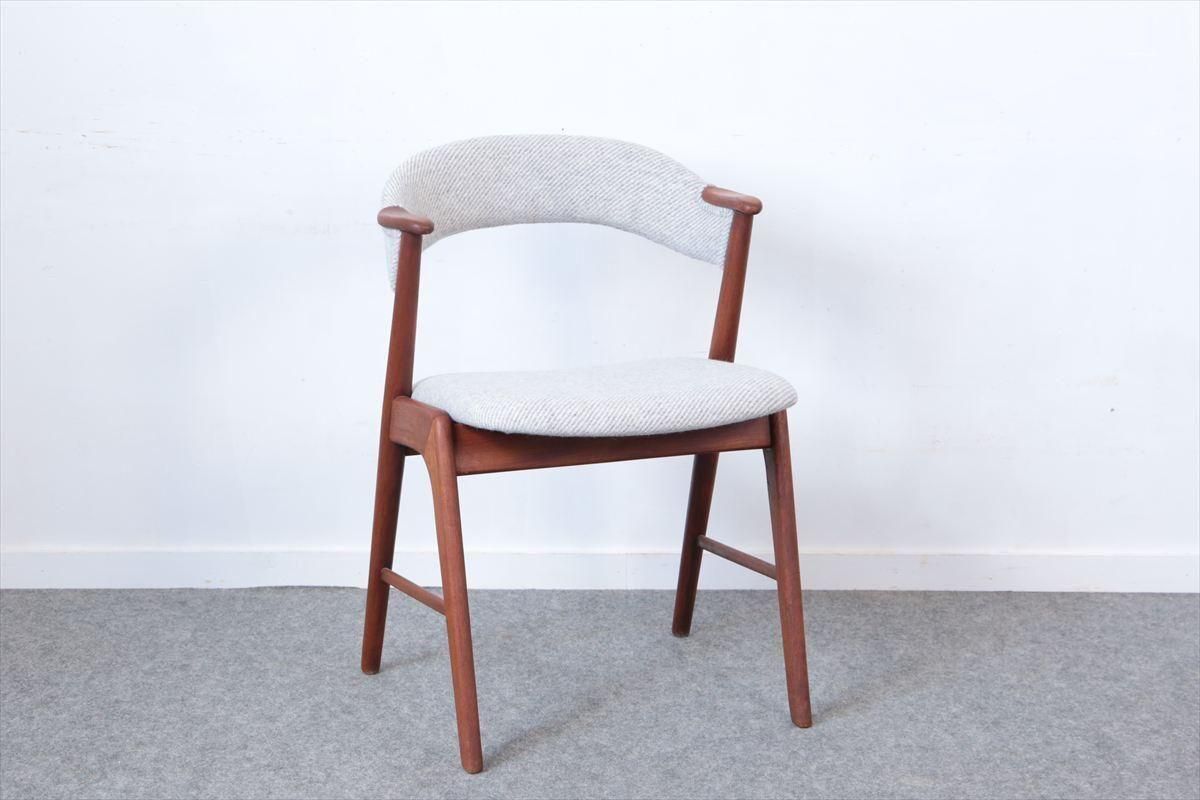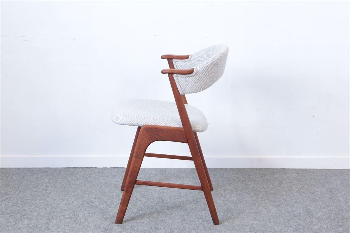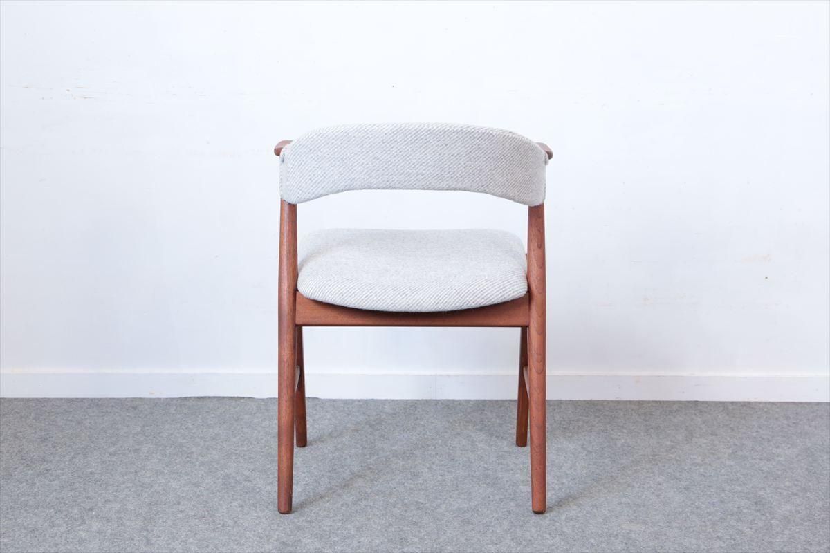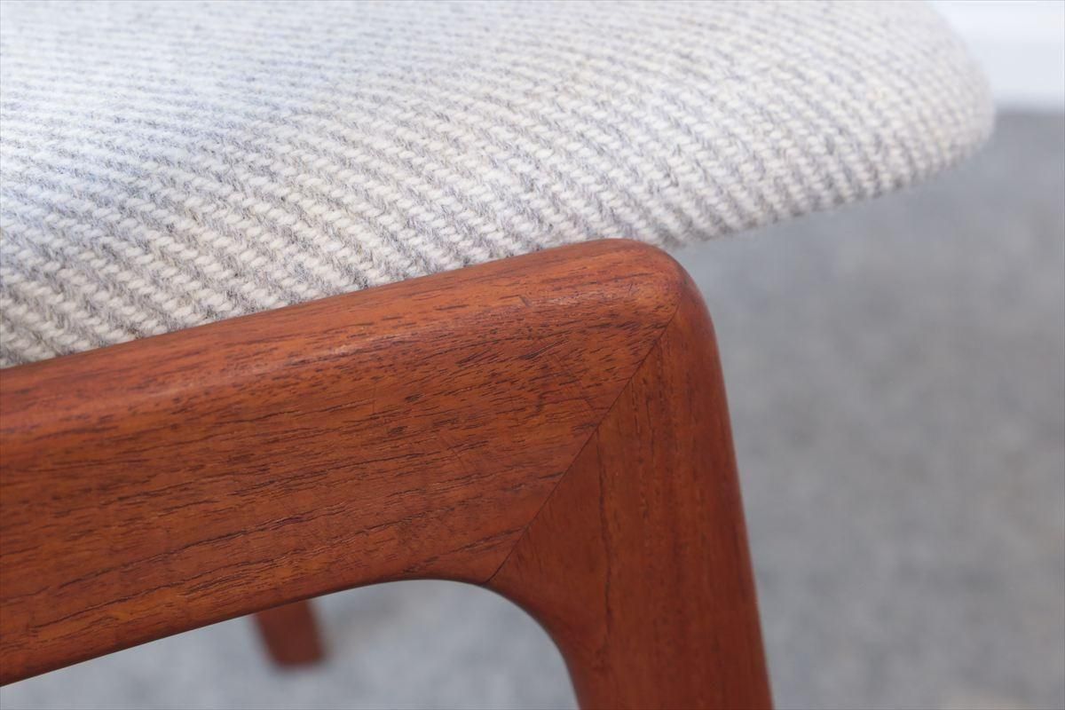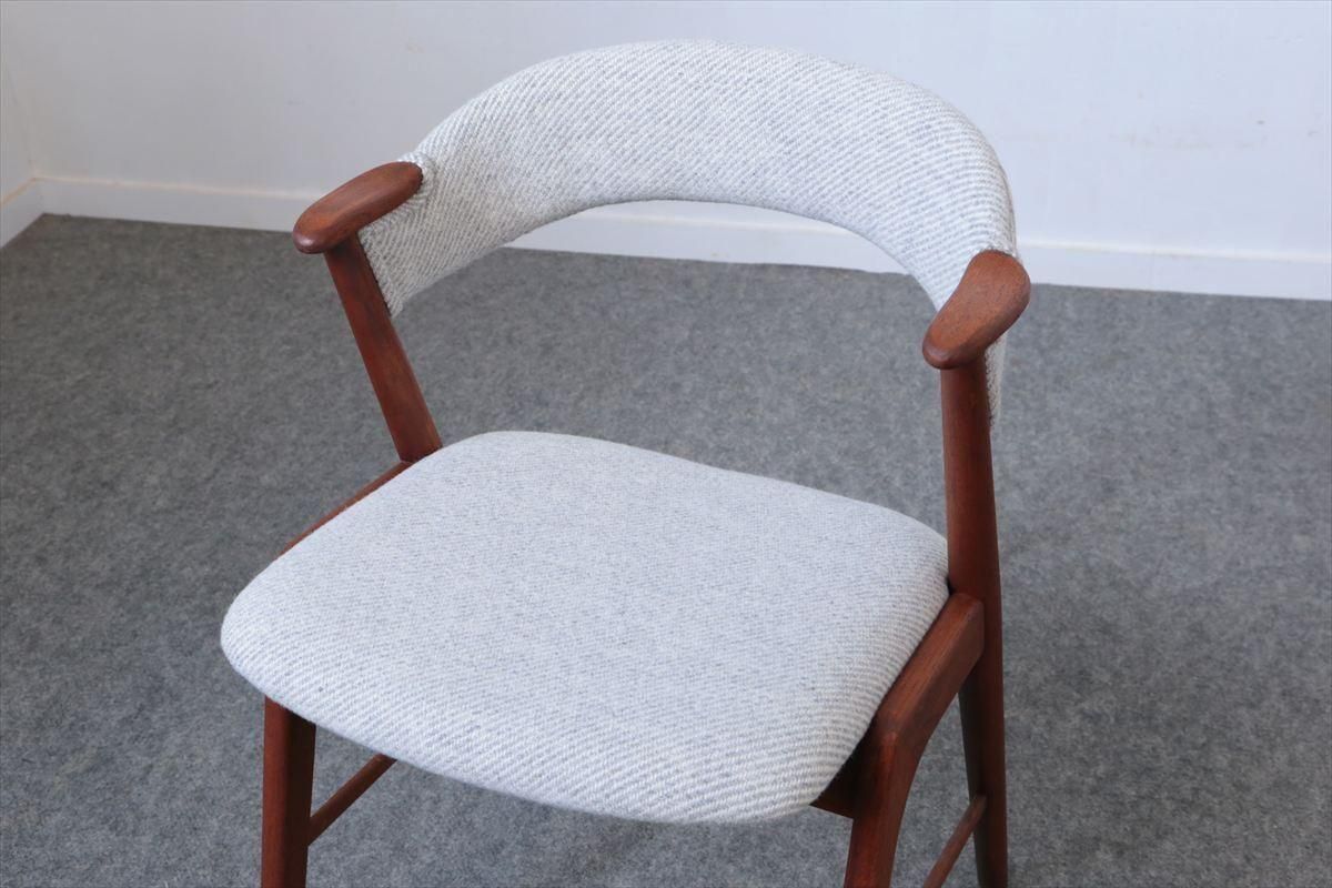 チークのネイルチェアーです。 丸い小さなアームが爪の形に似ていることからネイルチェアーと呼ばれています。 こちらは背もたれも布張りのタイプです 短いアームはダイニングテーブルに合わせても邪魔にならず、楽な姿勢でゆったりとくつろげます。 デザイン性と機能性を兼ね揃えた、細部まで上質で丁寧な造りのチェアーです。 デンマークのファブリックブランドDANISH ART WEAVING(デニッシュアートウィーヴィング)のPERUシリーズ/3( 素材:ウール100%)で張替ました。斜めストライプのふっくらとした質感です。 木部の細かいキズや凹みなど多少使用感はありますが、良いコンディションです。