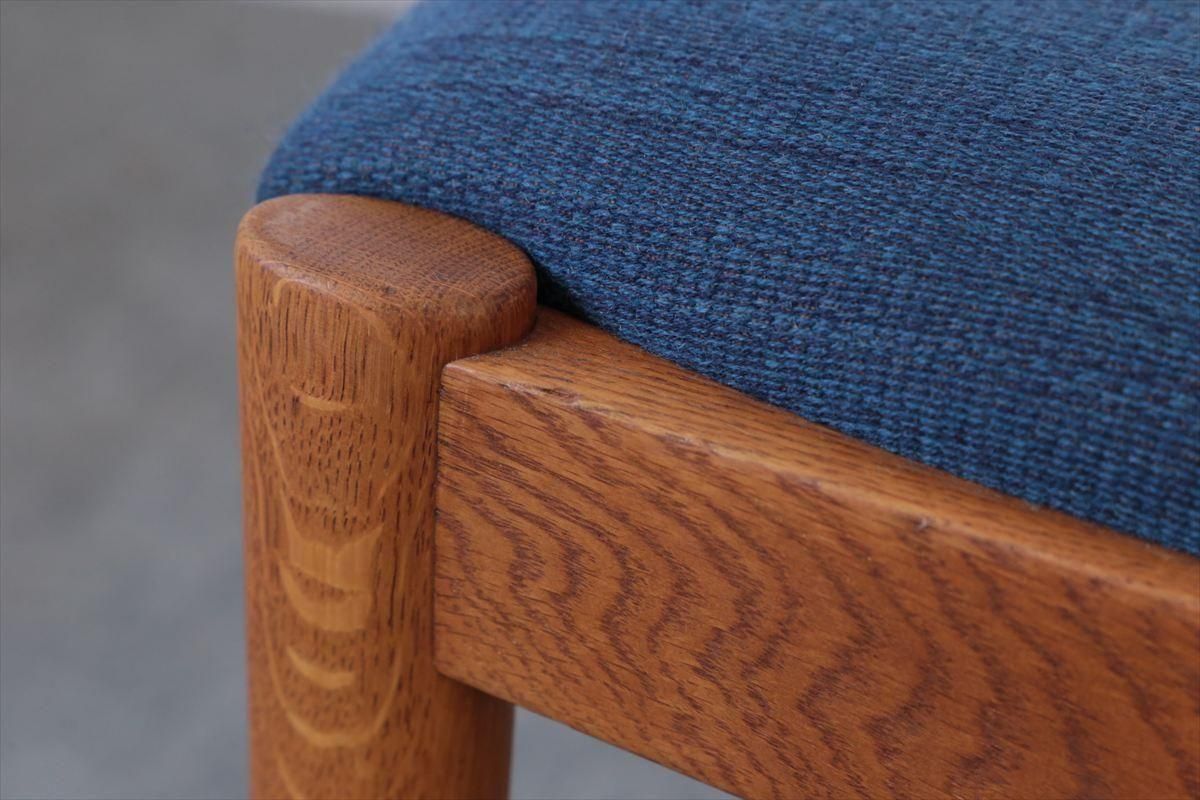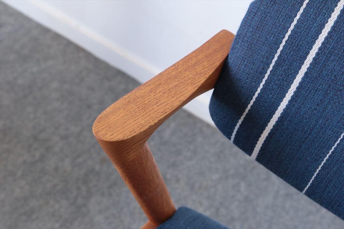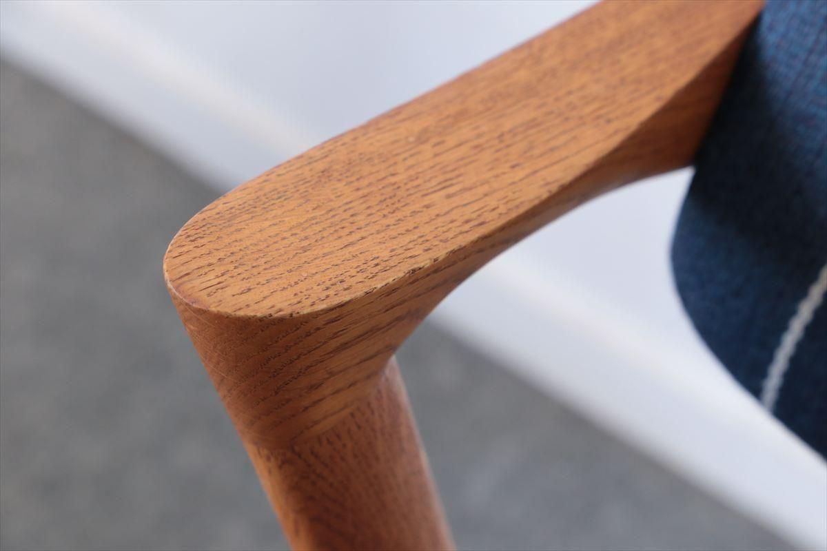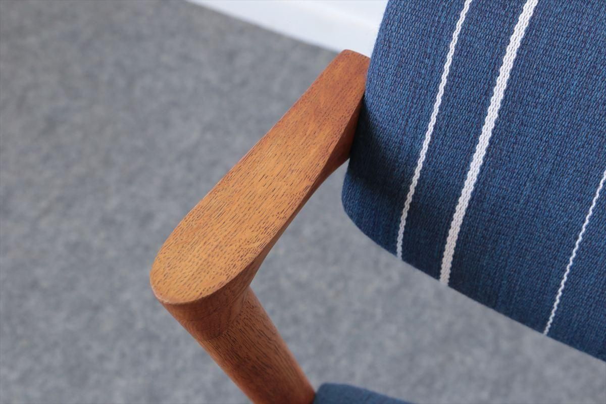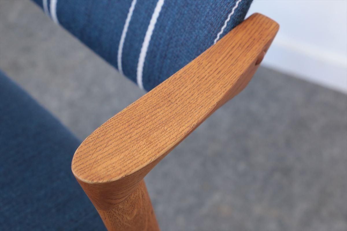 Kai Kristiansen(カイ・クリスチャンセン)デザインのアームチェアー「No.42」です。 こちらはオークのフレームで、小さな肘掛がアクセントになった人気の高いシリーズです。背もたれが可動し、座面下はベルト張りで柔らかな沈み具合が座り心地良く、ゆったりと座ることができます。 ダイニングに組み合わせてもアームが邪魔にならず、デザイン性と機能性に優れています。 細部まで上質で丁寧な造りのチェアーです。 背と座はファブリックはDANISH ART WEAVING(デニッシュアートウィーヴィング)のUrd シリーズ( 素材:ウール74%、ポリエステル17%、コットン9%) で張替ています。内部のウレタンとベルトは新しいものに交換済みです。 画像のようなキズやわずかな欠けなど多少使用感はありますが、良いコンディションです。