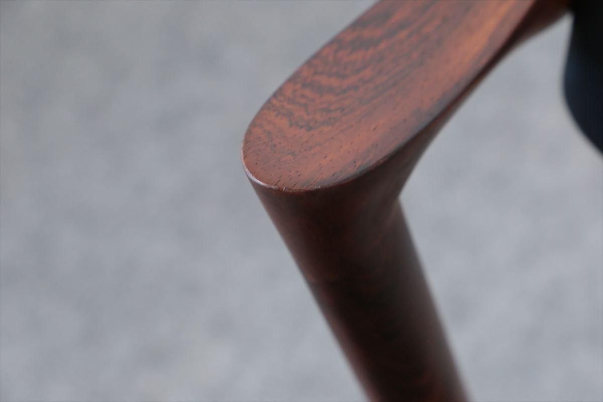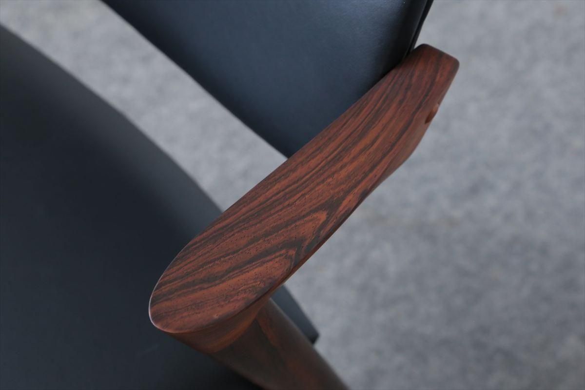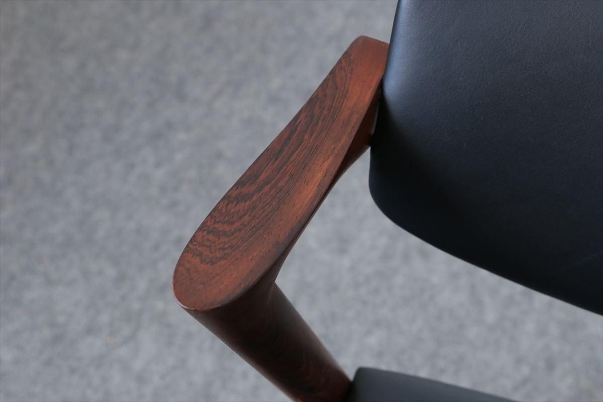 Kai Kristiansen(カイ・クリスチャンセン)デザインのアームチェアー「No.42」です。 こちらはローウッドのフレームで、小さな肘掛がアクセントになった人気の高いシリーズです。 背もたれが可動し、座面下はベルト張りで柔らかな沈み具合が座り心地良く、ゆったりと座ることができます。 ダイニングに組み合わせてもアームが邪魔にならず、デザイン性と機能性に優れています。 細部まで上質で丁寧な造りのチェアーです。 背と座はレザーで張り替えました。ブラックのレザーと赤みを帯びたローズウッドのフレームが落ち着いた雰囲気です。内部のウレタンとベルトも新しいものに交換済みです。 レザーにしわや小さな擦れなどがありますが、レザー特有のものですのでご了承くださいませ。 木部の細かいキズなど多少使用感はありますが、良いコンディションです。