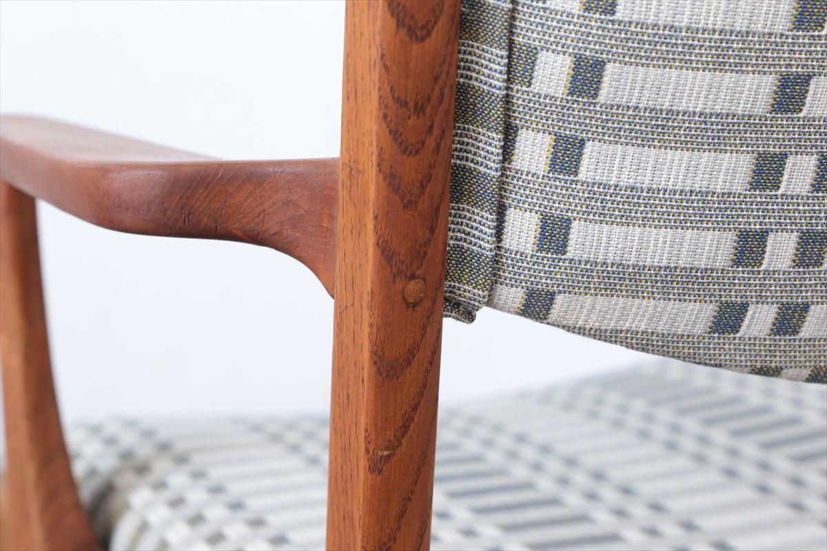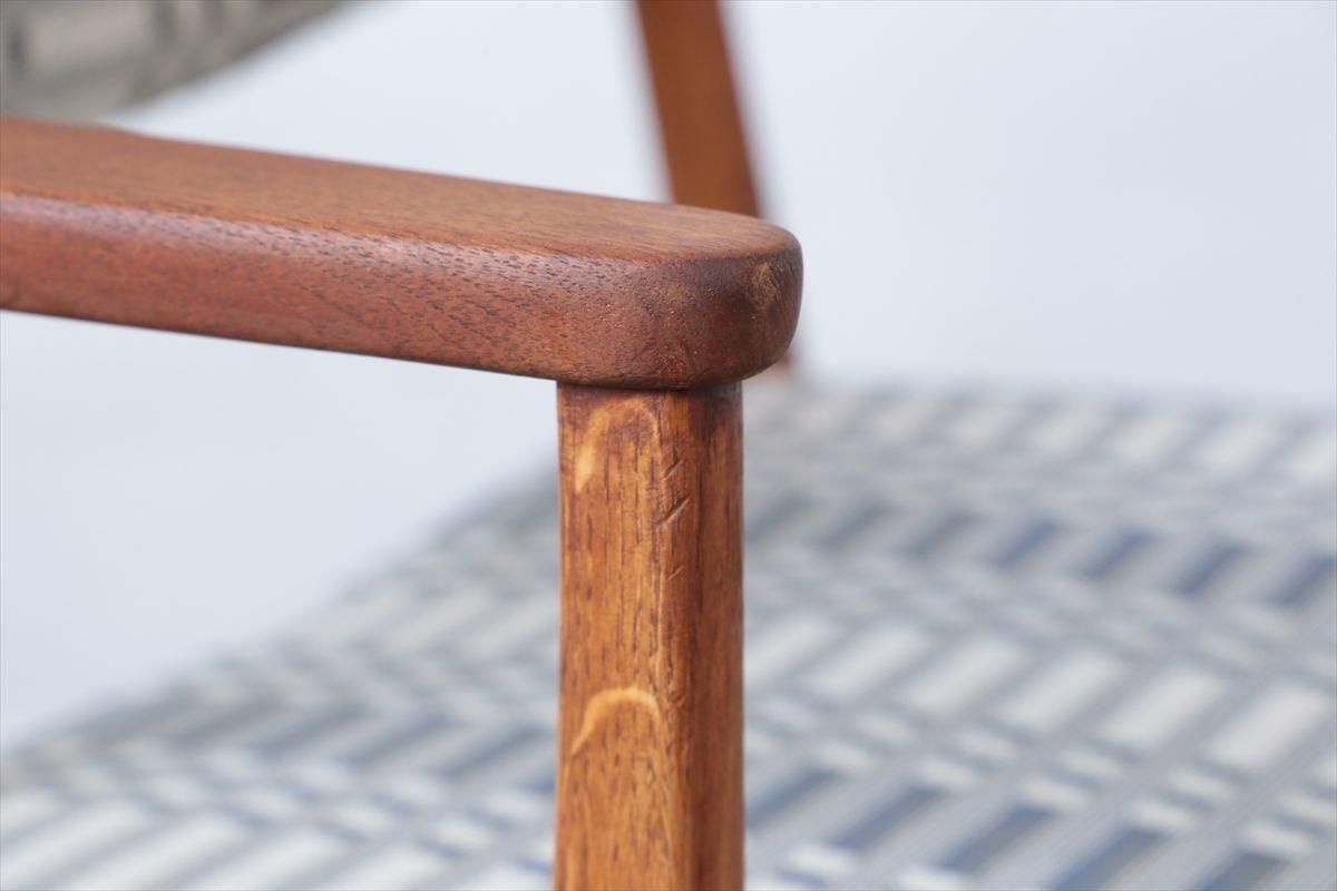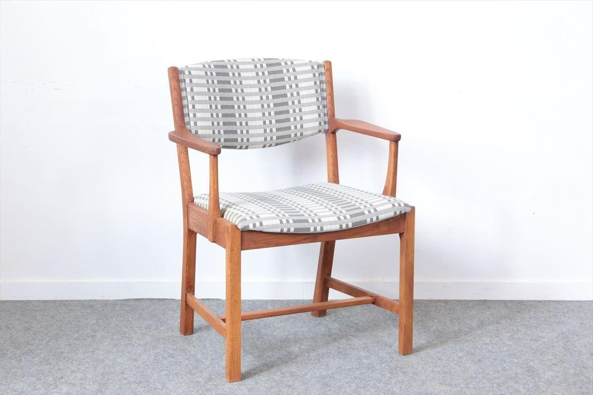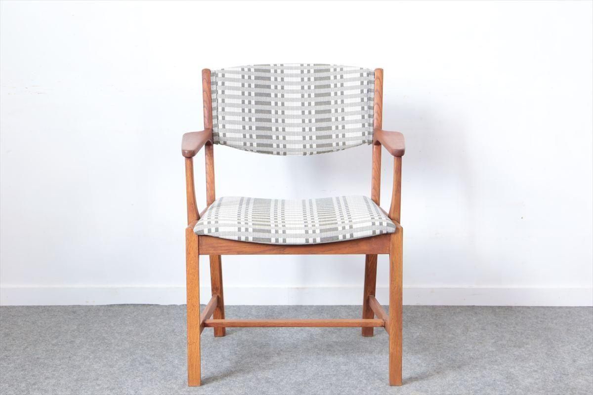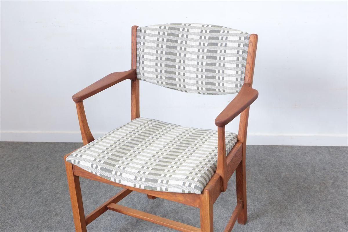 チーク×オークのアームチェアーです。 チークのアームがアクセントとなった、シンプルで温かみのあるデザインです。 ファブリックはフィンランドのテキスタイルブランドJohanna Gullichsen(ヨハンナ・グリクセン)の「Tithonus/ティトナス(リード)」(綿100%)の生地で張替ました。グラフィックパターンを織りで表現したテキスタイルは、立体感のある優しい手触りや、糸が重なることで表現される色合いも美しく、季節を通してお楽しみいただけます。アームはチーク、その他はオークです。 背柱の上部に割れを補修した跡や背側に補修の跡があります。現在強度には問題はありませんが、それらを考慮した割引価格になっております。 その他細かいキズや凹みなど多少使用感はありますが、良いコンディションです。