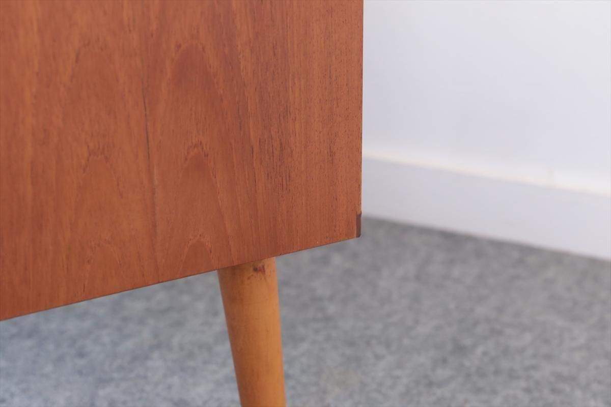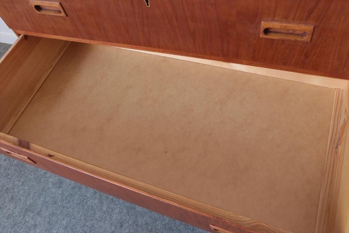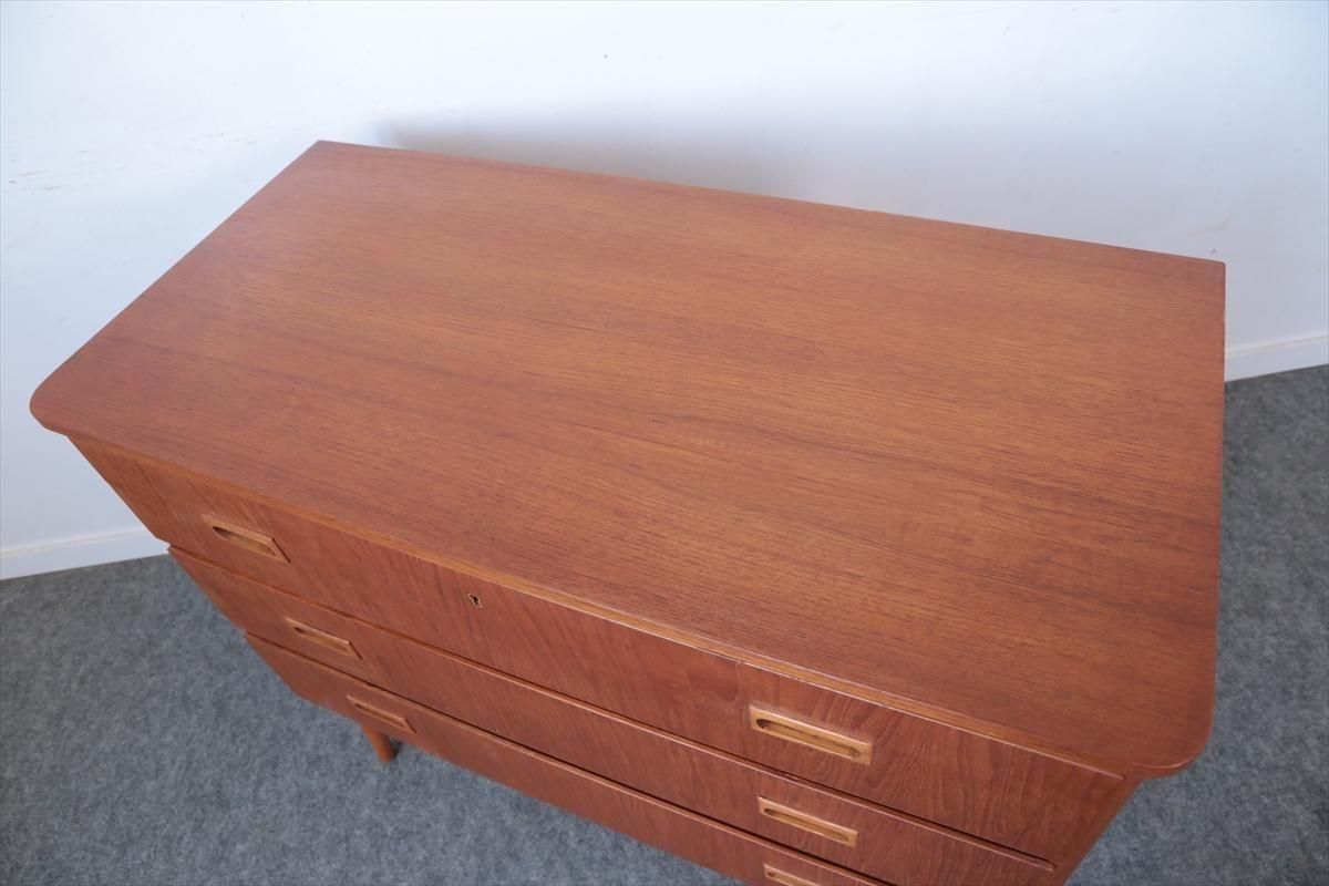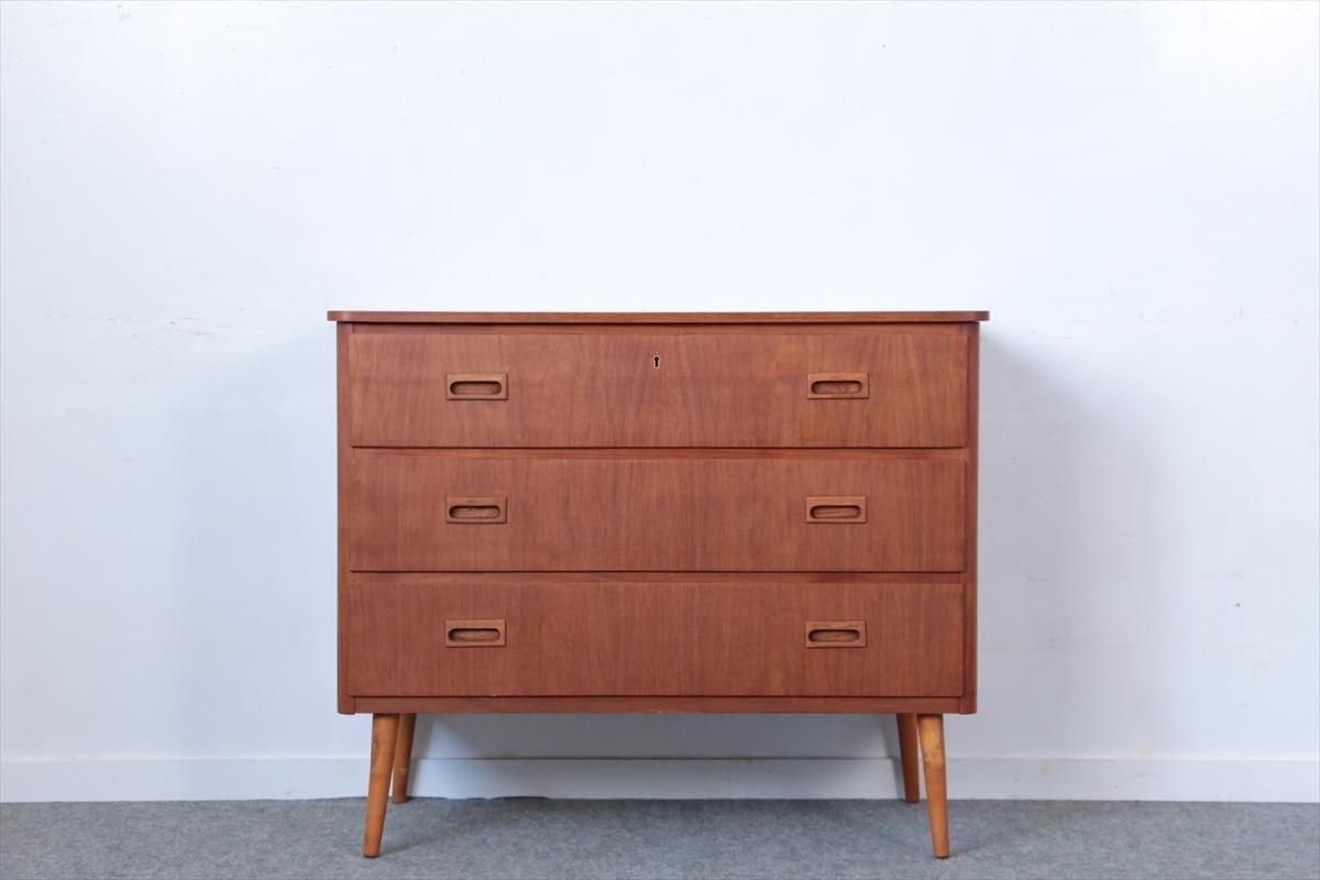 スウェーデンのチークの3段チェストです。 幅が88.5cmとやや広めなサイズで、丸みのある形や明るい色がスウェーデン家具らしい可愛らしい印象です。お気に入りのものをディスプレイしながら、衣類や身の回りの小物などの収納に便利です。 高さが73cm程で上に物を置いたり、飾ったりするのにちょうど良いサイズです。 脚はビーチ材で、引き出しの底板はボード板が使用されています。 画像の様に横面の角に欠けを補修した跡あります。 その他に天板や縁に小さな凹みキズなど多少使用感はありますが、 全体的には良いコンディションです。