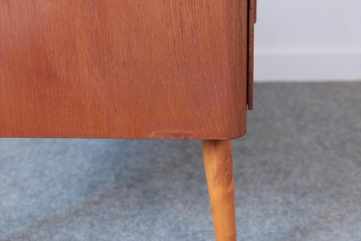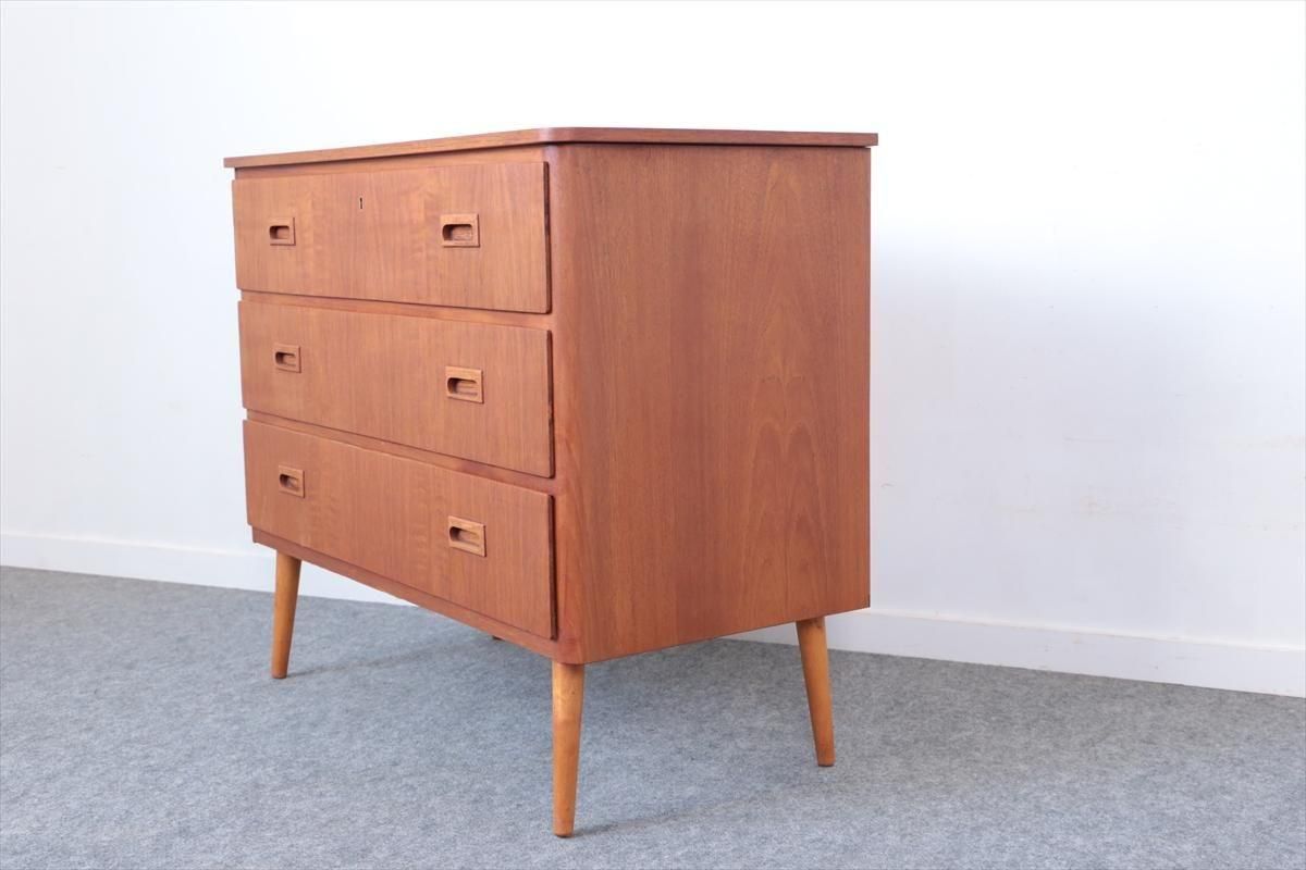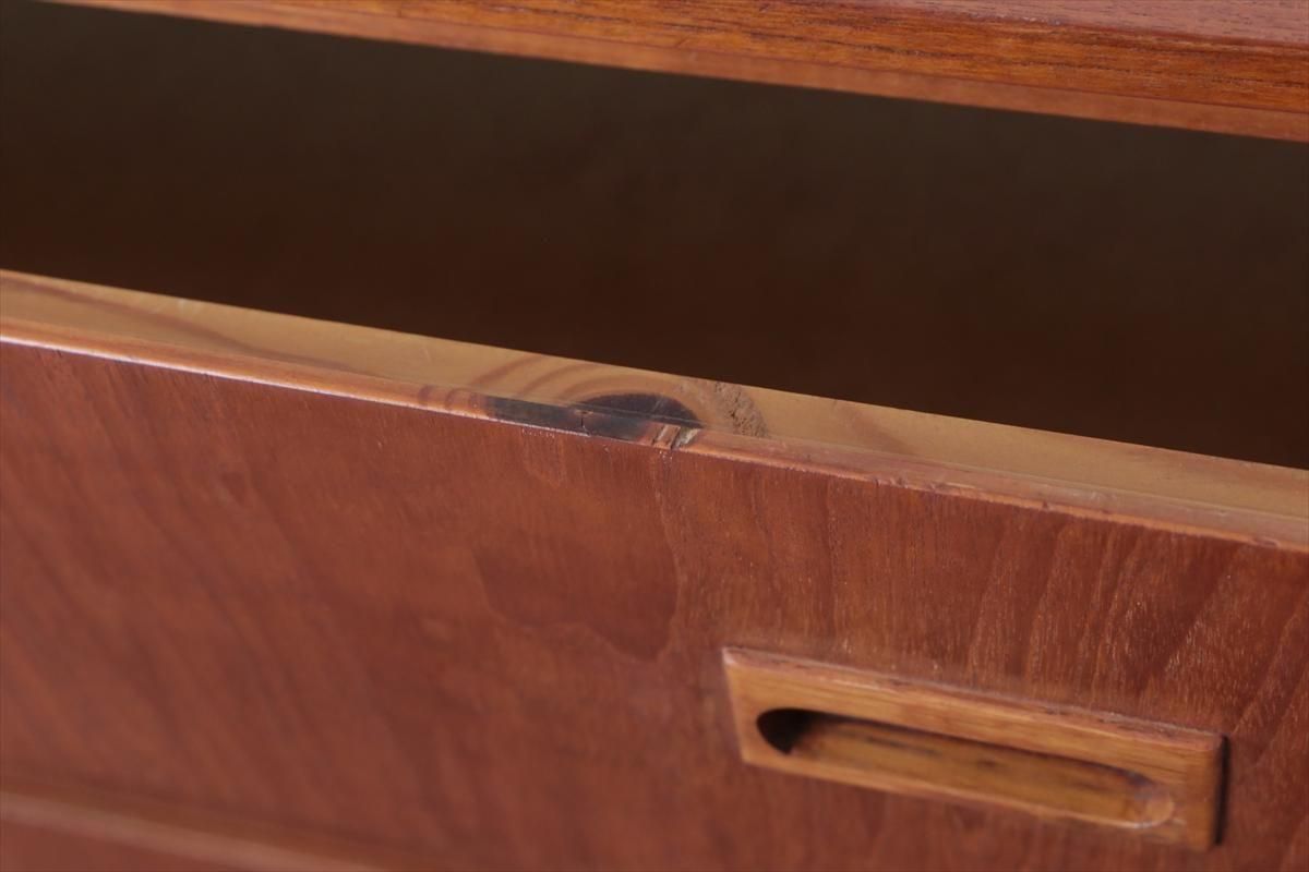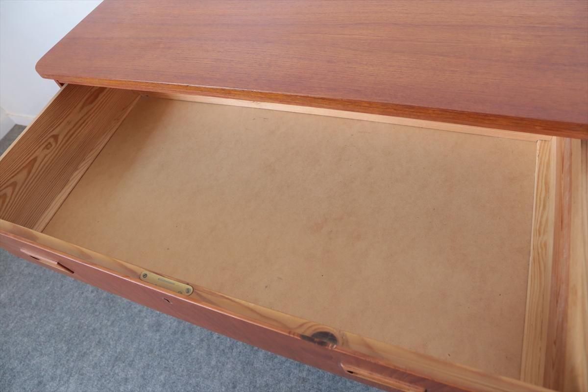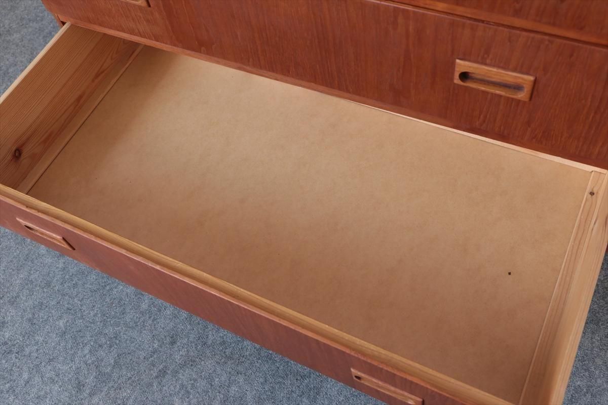 スウェーデンのチークの3段チェストです。 幅が88.5cmとやや広めなサイズで、丸みのある形や明るい色がスウェーデン家具らしい可愛らしい印象です。お気に入りのものをディスプレイしながら、衣類や身の回りの小物などの収納に便利です。 高さが73cm程で上に物を置いたり、飾ったりするのにちょうど良いサイズです。 脚はビーチ材で、引き出しの底板はボード板が使用されています。 画像の様に横面の角に欠けを補修した跡あります。 その他に天板や縁に小さな凹みキズなど多少使用感はありますが、 全体的には良いコンディションです。