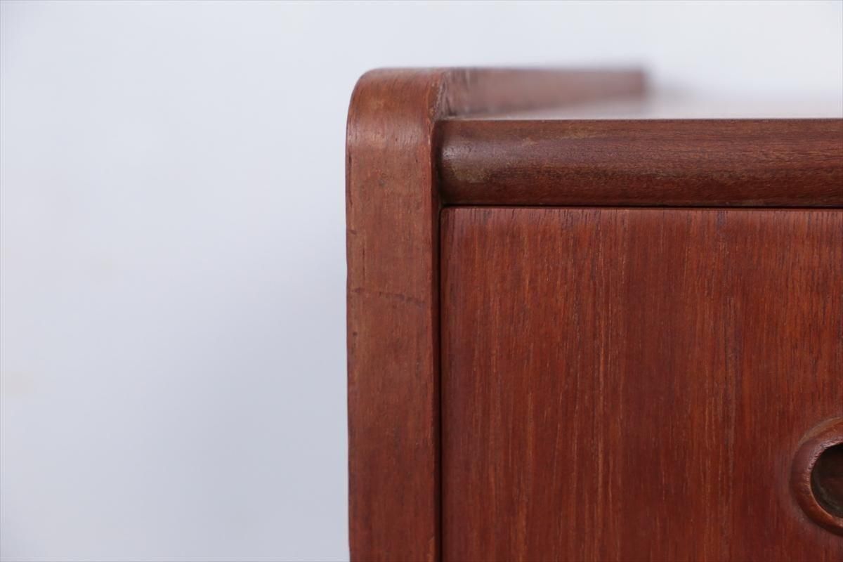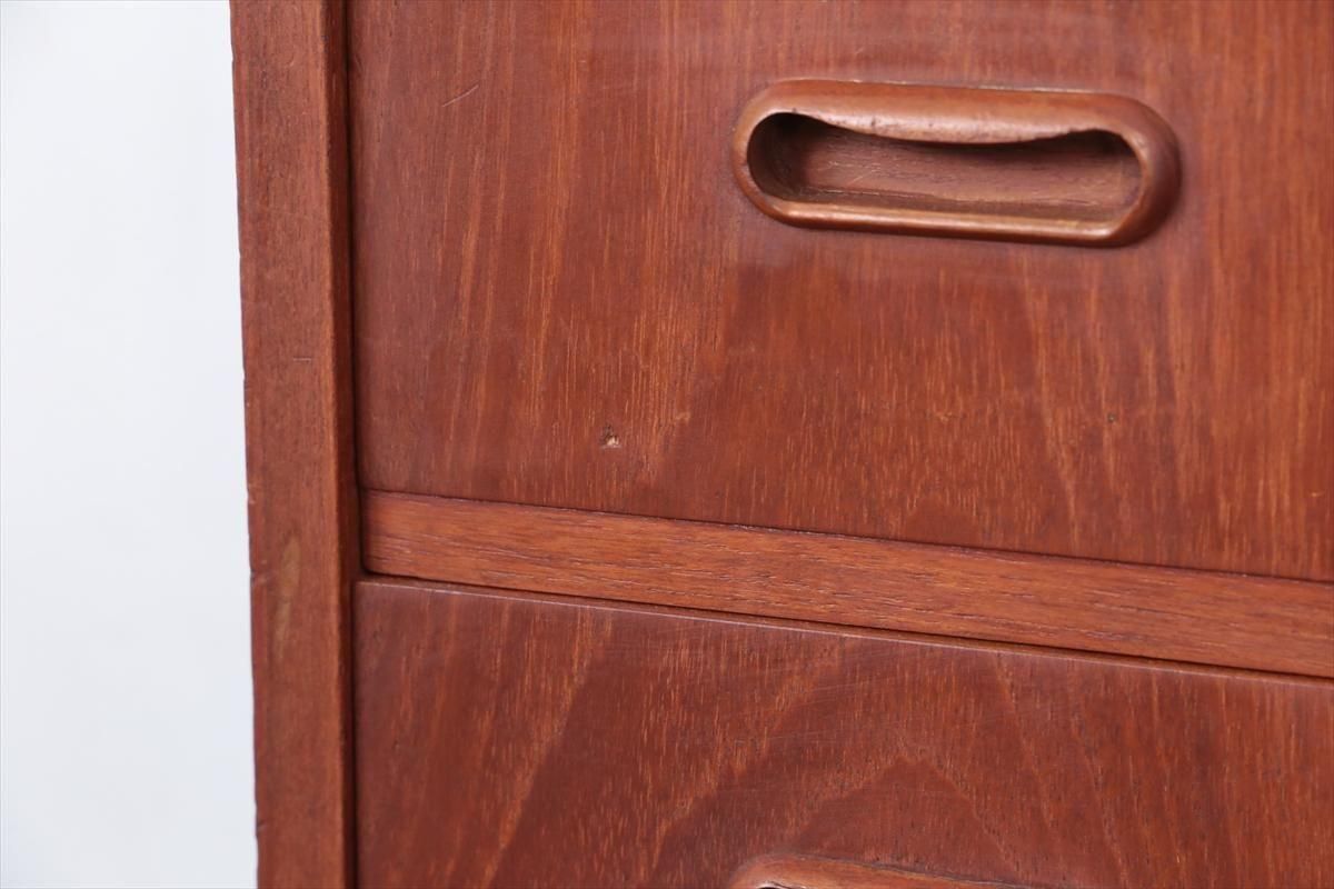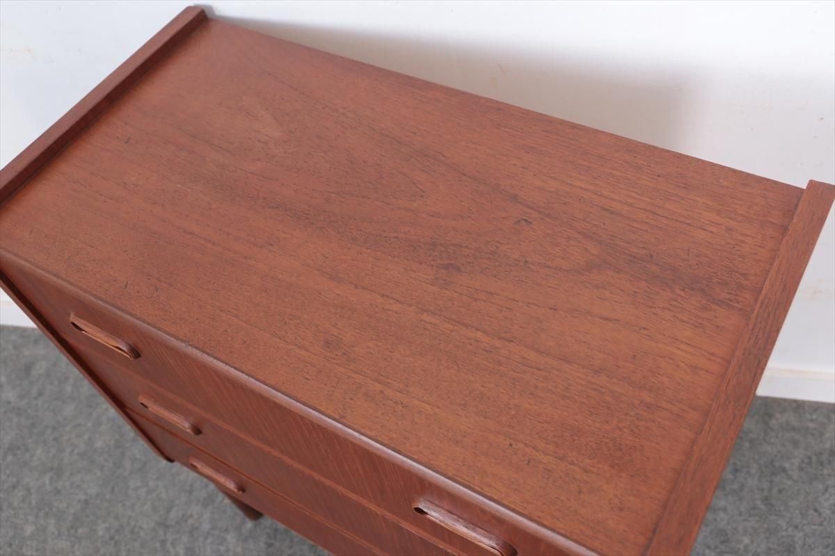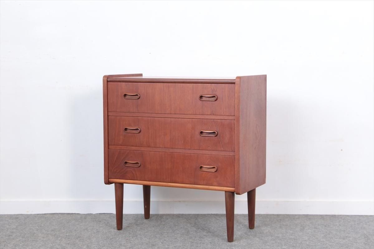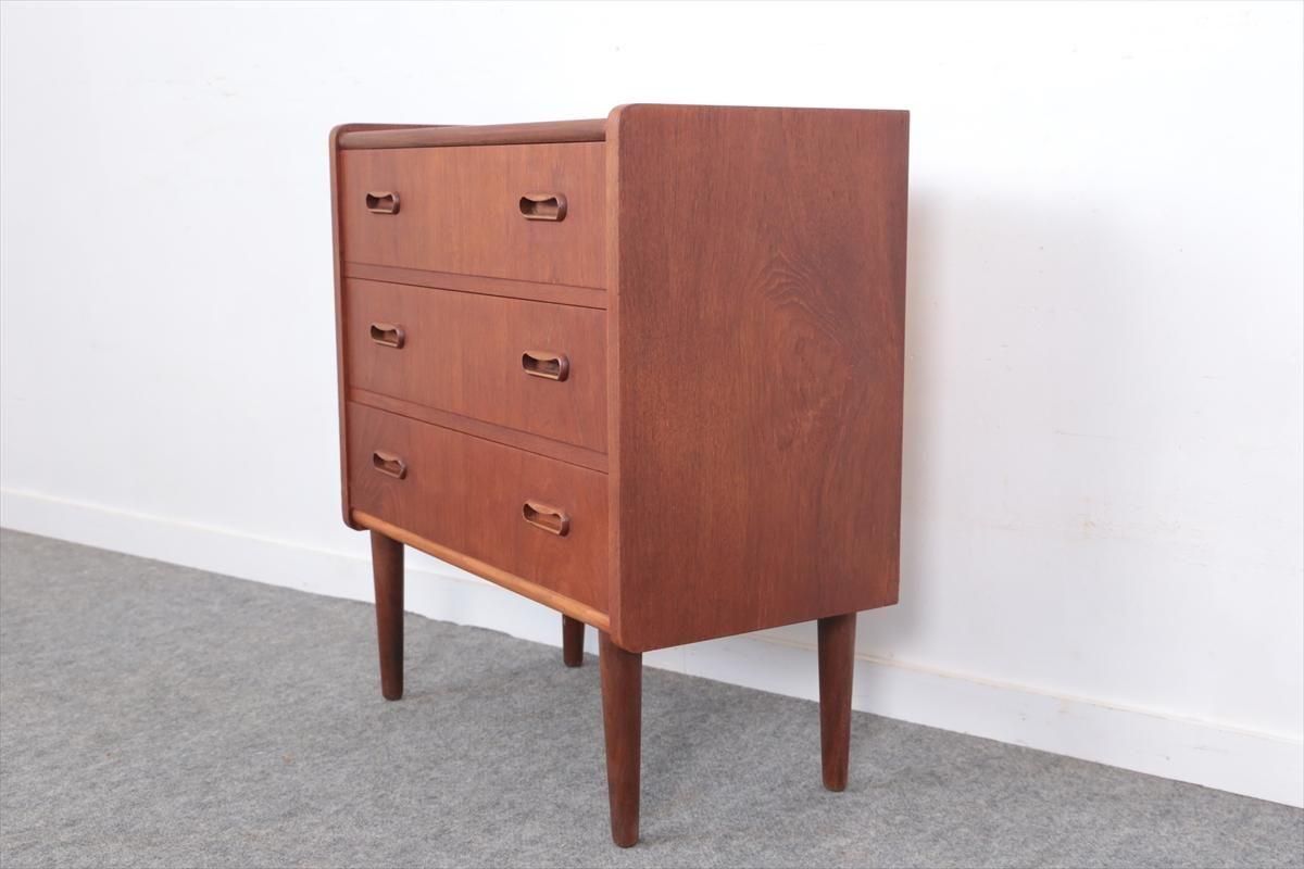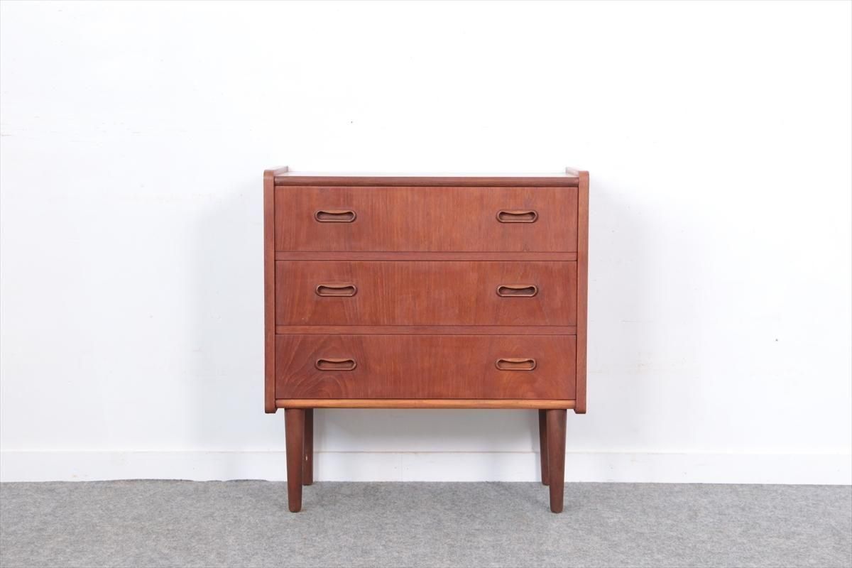 デンマークのチークの3段ミニチェストです。とても人気のあるデザインで、持ち手が可愛らしい印象です。ベッドサイドや玄関や廊下などのスペースでも使えそうです。 お気に入りの物をディスプレイしながら、身の回りの小物などの収納が出来ます。置くだけでも空間の印象を変えてくれそうです。 持ち手に小さな欠けが所々あります。また、横面の角や引き出しに欠けを補修した跡があります。その他に角や引き出しの内側に小さな欠けや、細かいキズや凹みなど全体的に使用感はありますが、良いコンディションです。