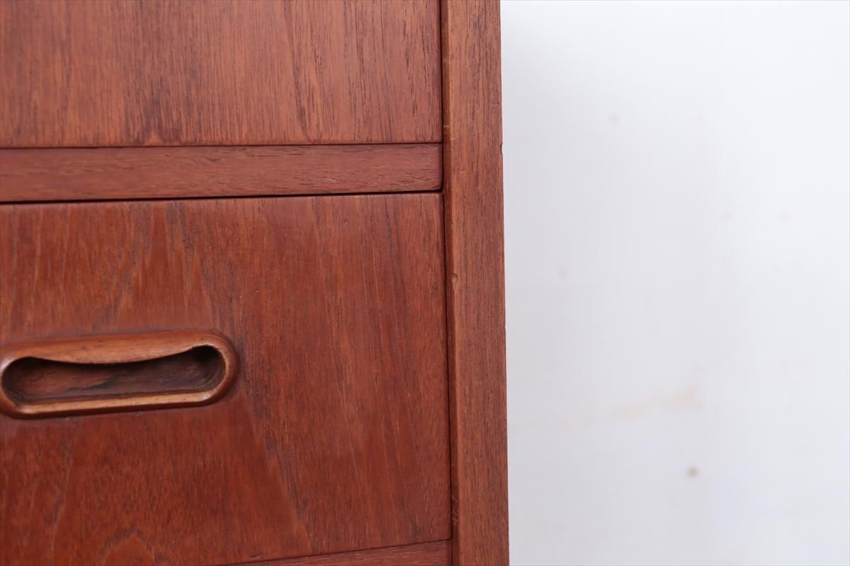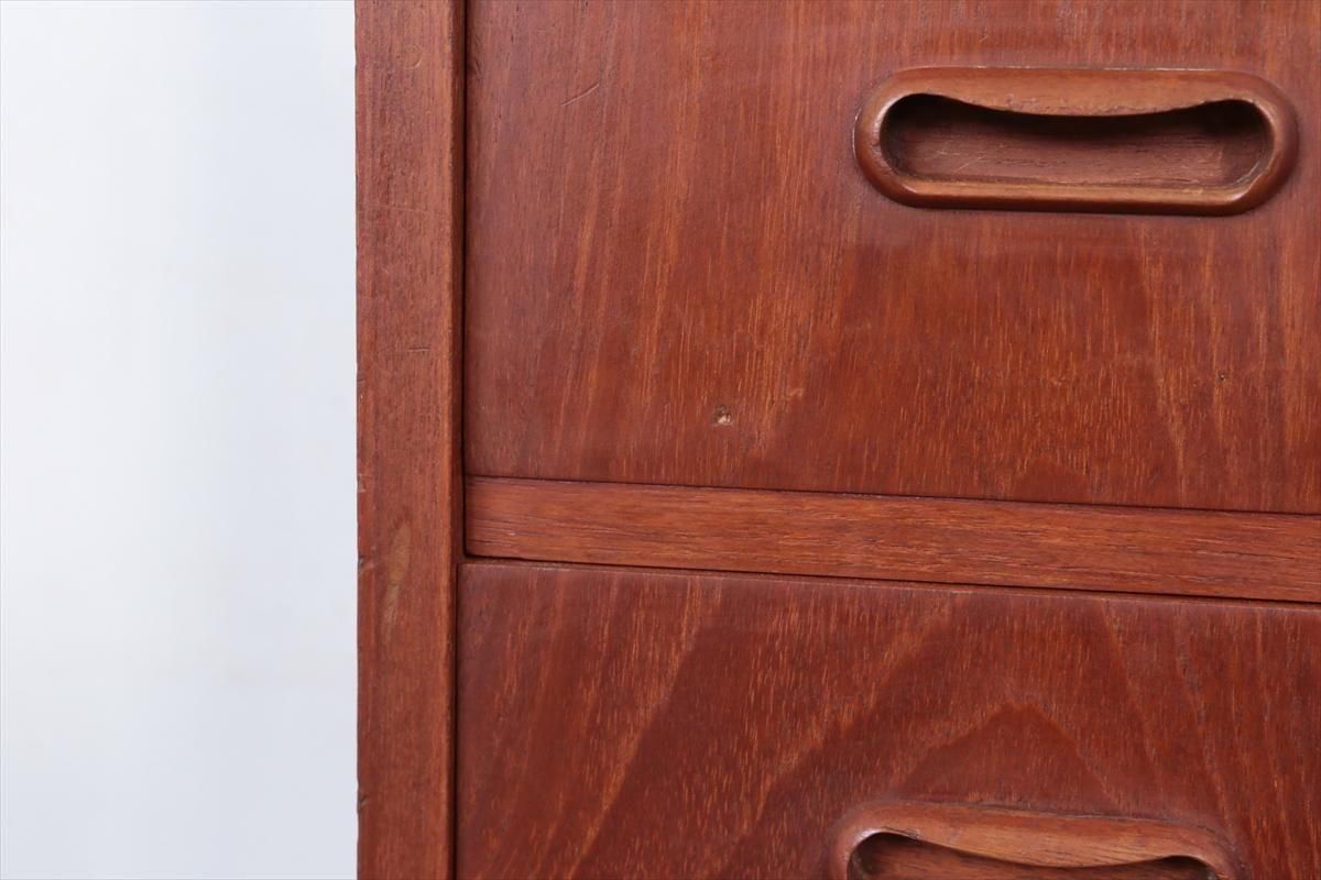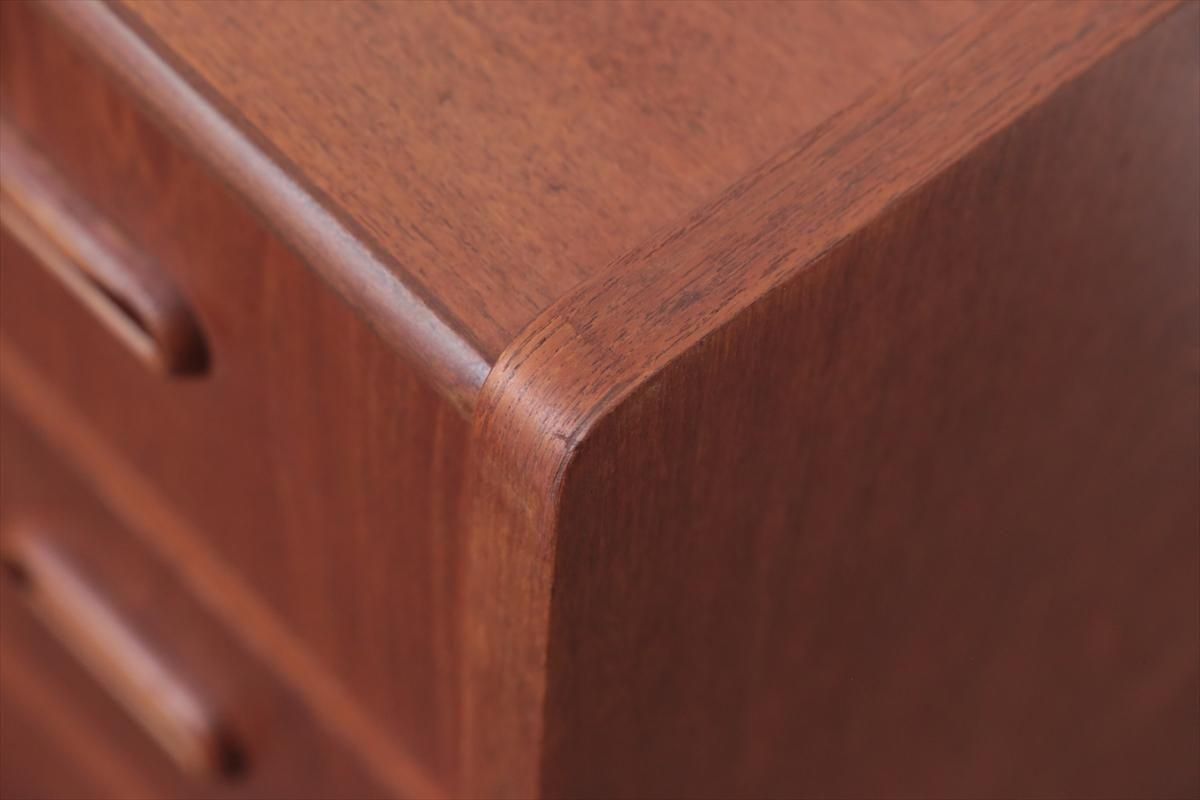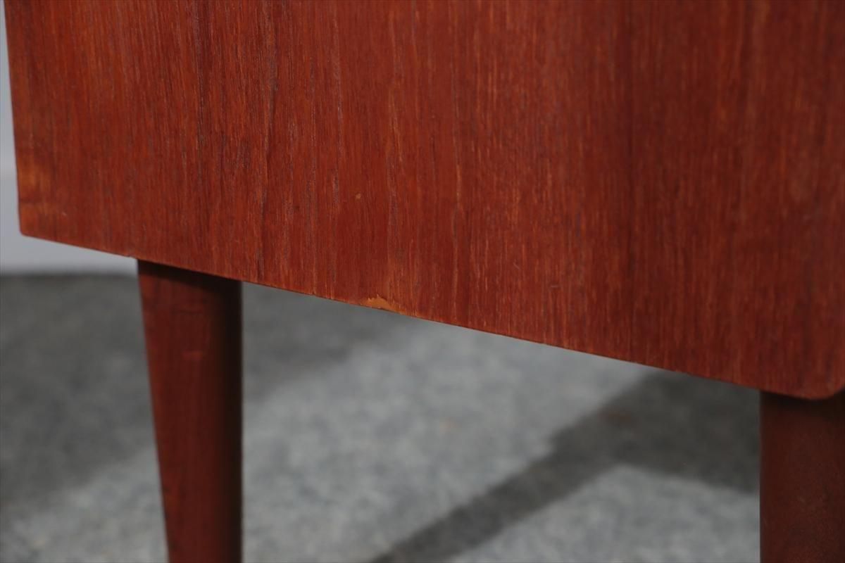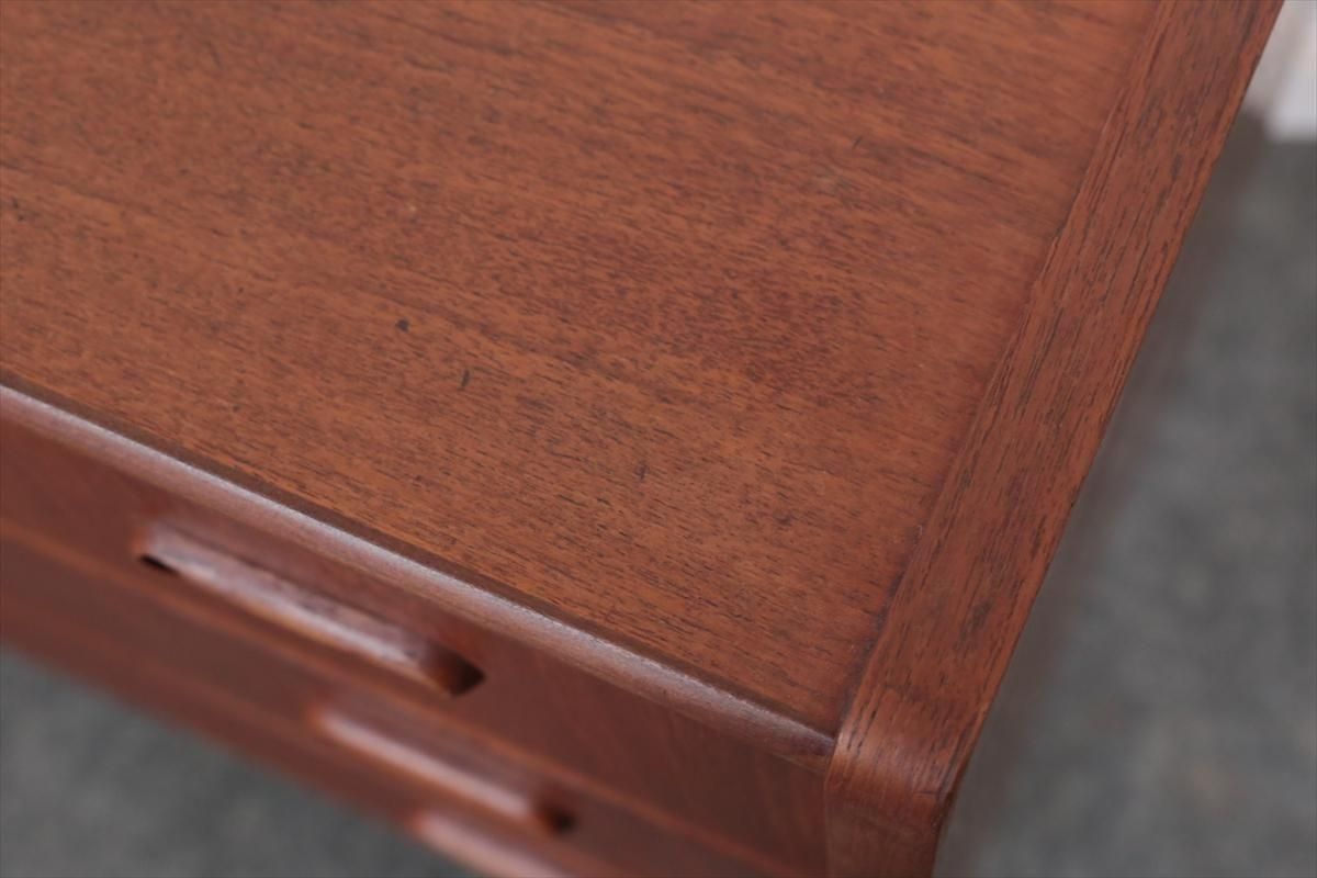 デンマークのチークの3段ミニチェストです。とても人気のあるデザインで、持ち手が可愛らしい印象です。ベッドサイドや玄関や廊下などのスペースでも使えそうです。 お気に入りの物をディスプレイしながら、身の回りの小物などの収納が出来ます。置くだけでも空間の印象を変えてくれそうです。 持ち手に小さな欠けが所々あります。また、横面の角や引き出しに欠けを補修した跡があります。その他に角や引き出しの内側に小さな欠けや、細かいキズや凹みなど全体的に使用感はありますが、良いコンディションです。